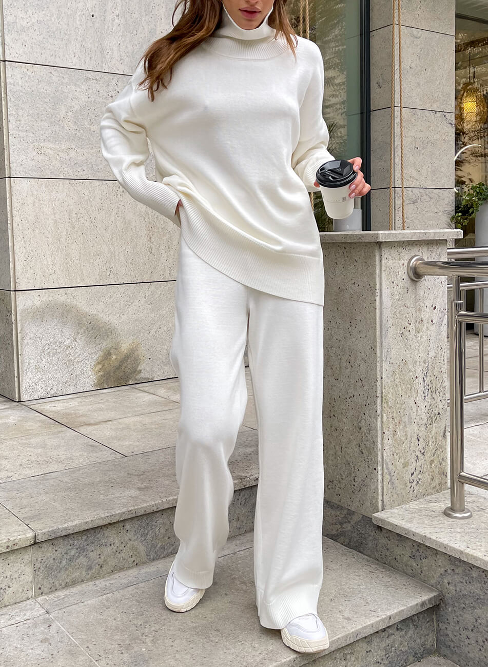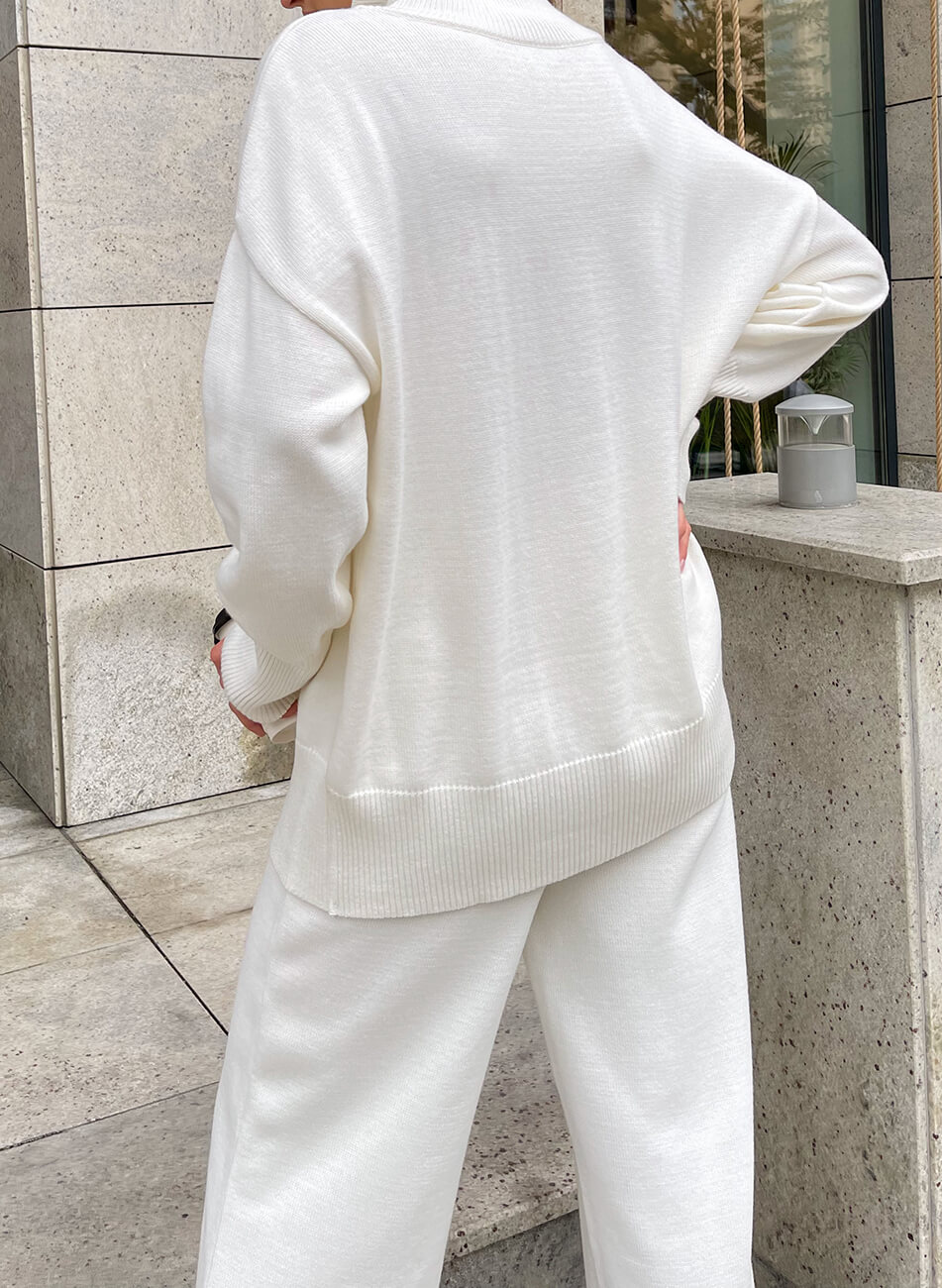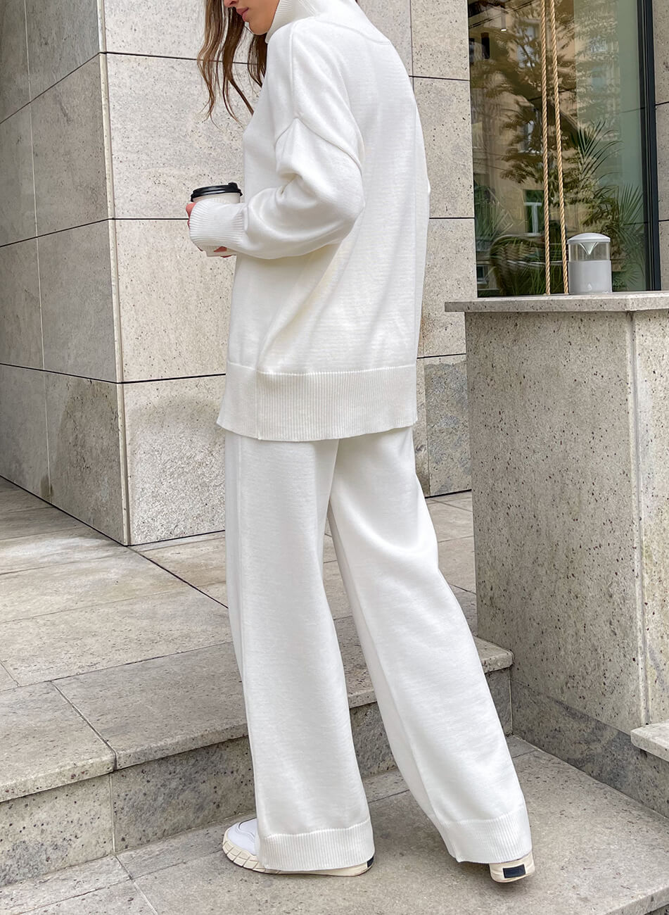 Костюм виконаний з м’якої та приємної до тіла пряжі. Широкі прямі штани, внизу імітація гумки. Светр вільного крою з високою горловиною. Манжети і нижній край вив’язані широкою гумкою, завдяки якій краї светра не розтягуються.