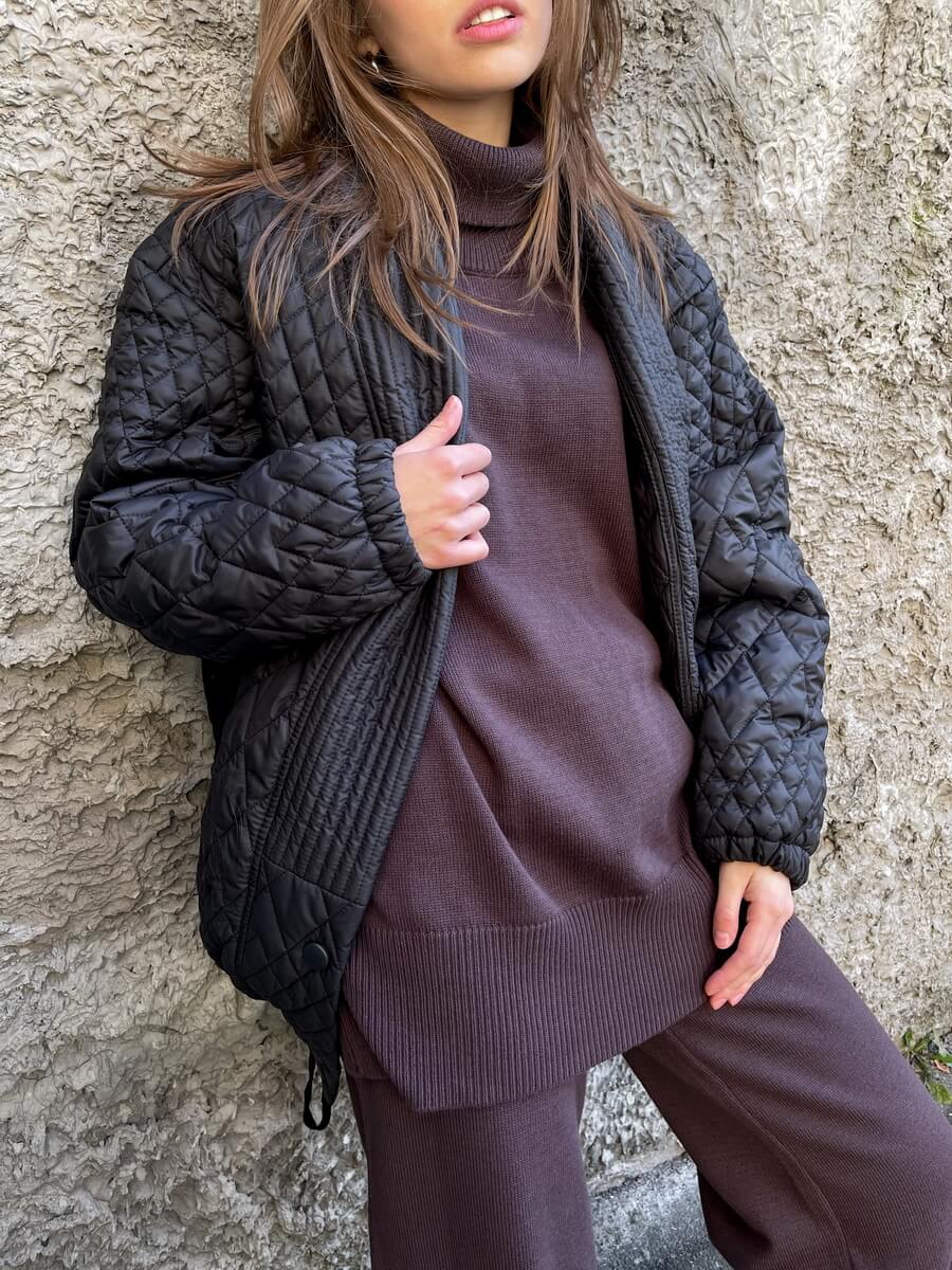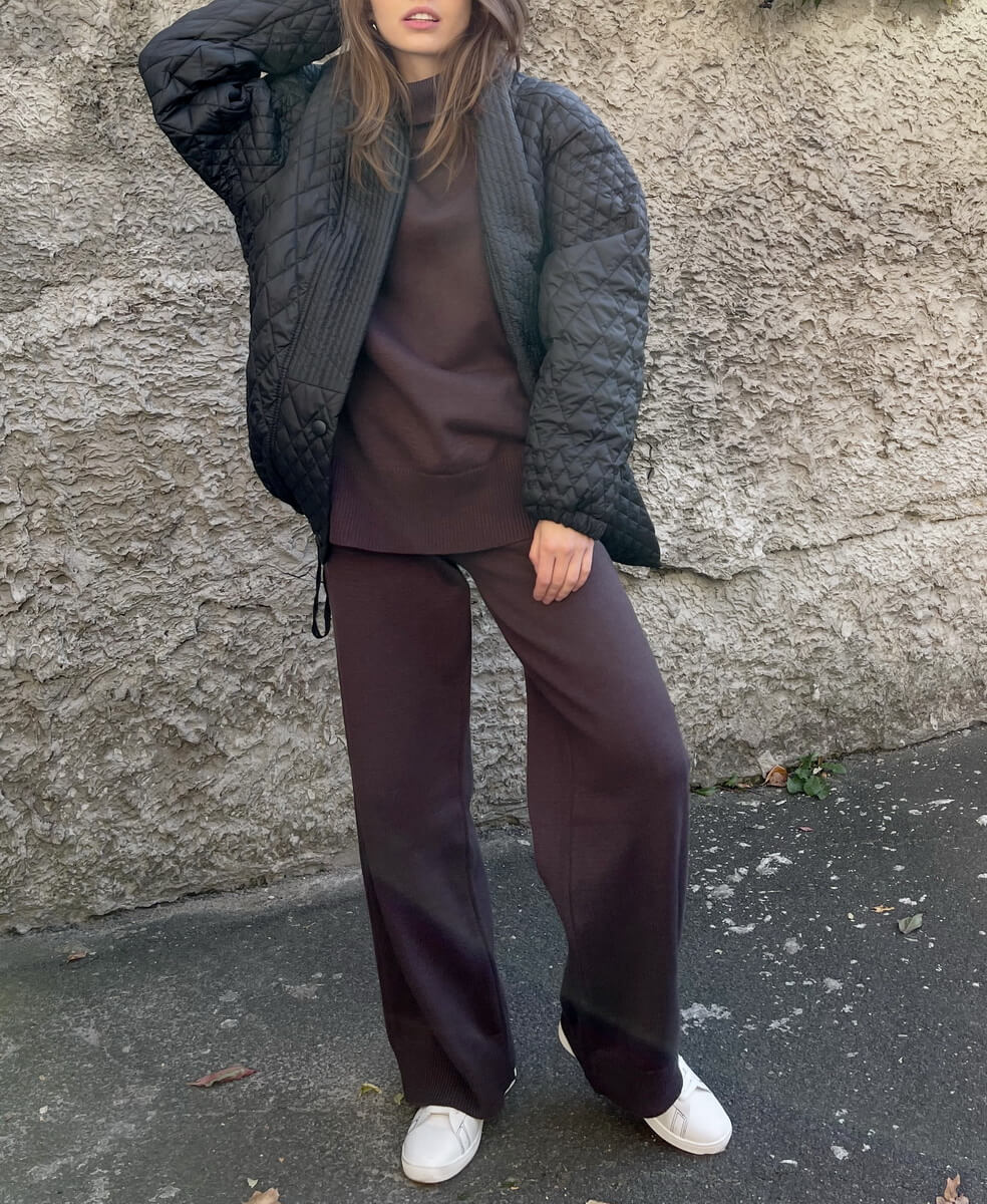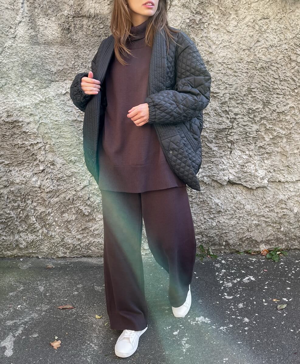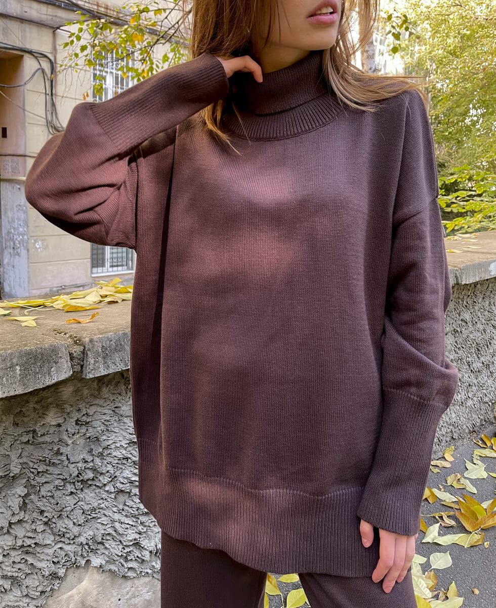 Костюм виконаний з м’якої та приємної до тіла пряжі. Широкі прямі штани, внизу імітація гумки. Светр вільного крою з високою горловиною. Манжети і нижній край вив’язані широкою гумкою, завдяки якій краї светра не розтягуються.