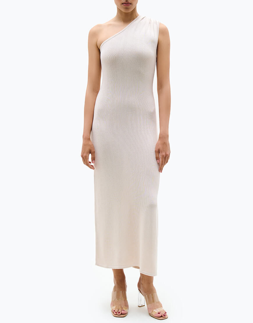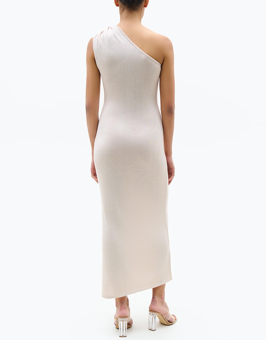 Сукня виконана у довжині максі, з розрізом на нозі та асиметричною бретеллю на одне плече. Приталений силует дозволяє стилізувати дану модель сукні як в вечірніх, так і повсякденних образах.