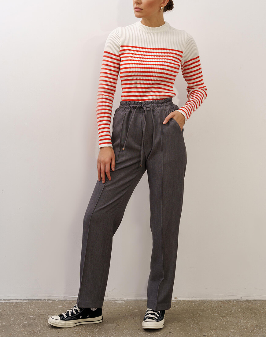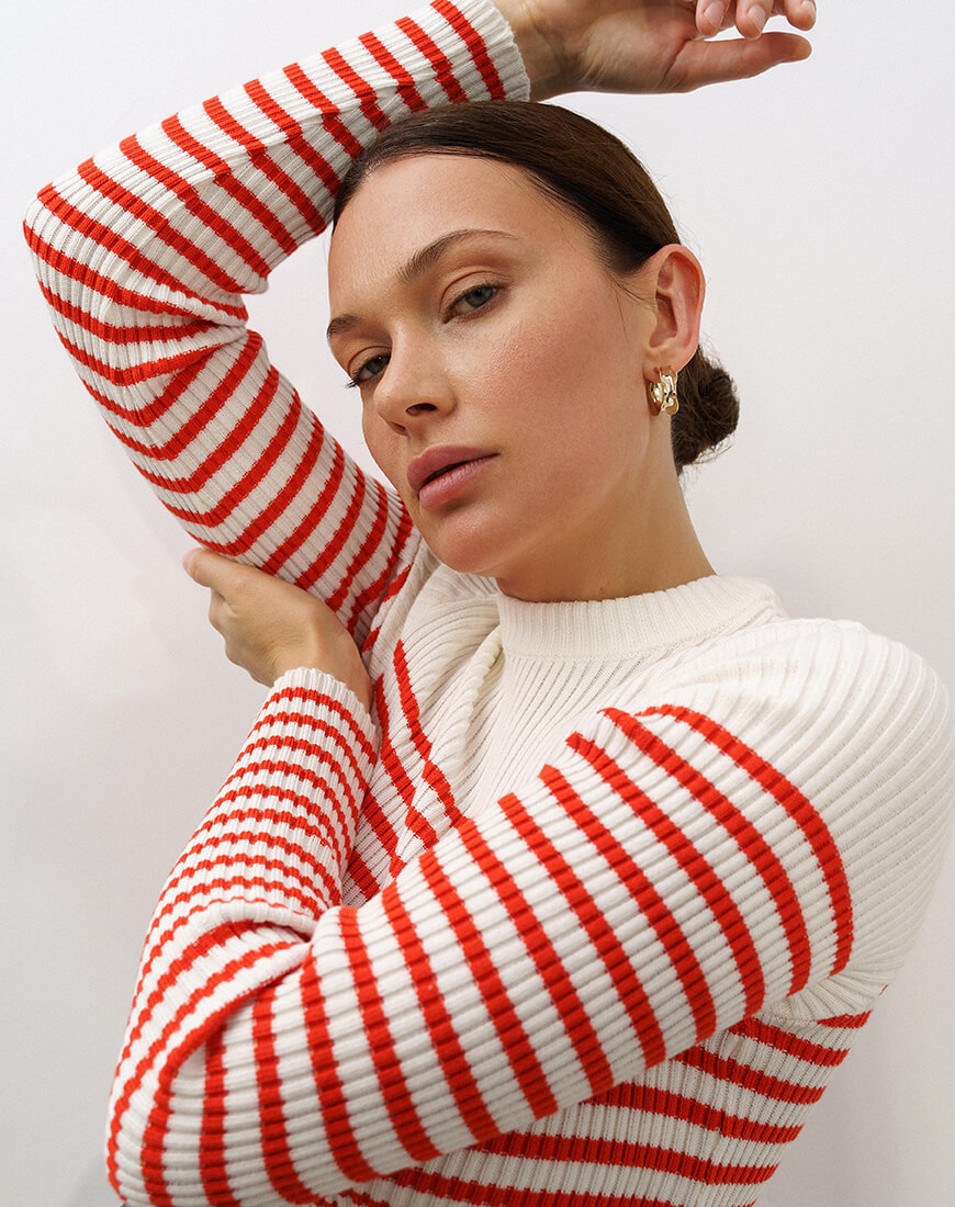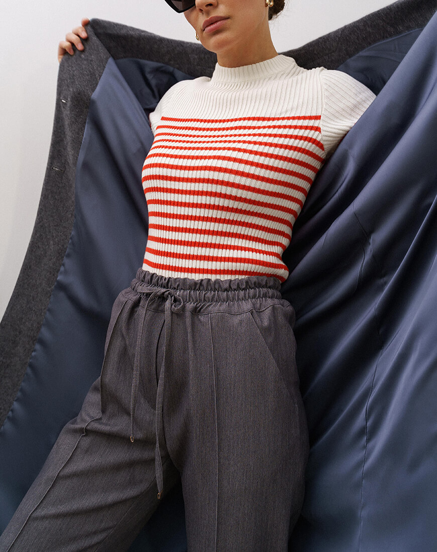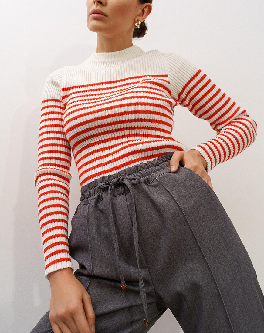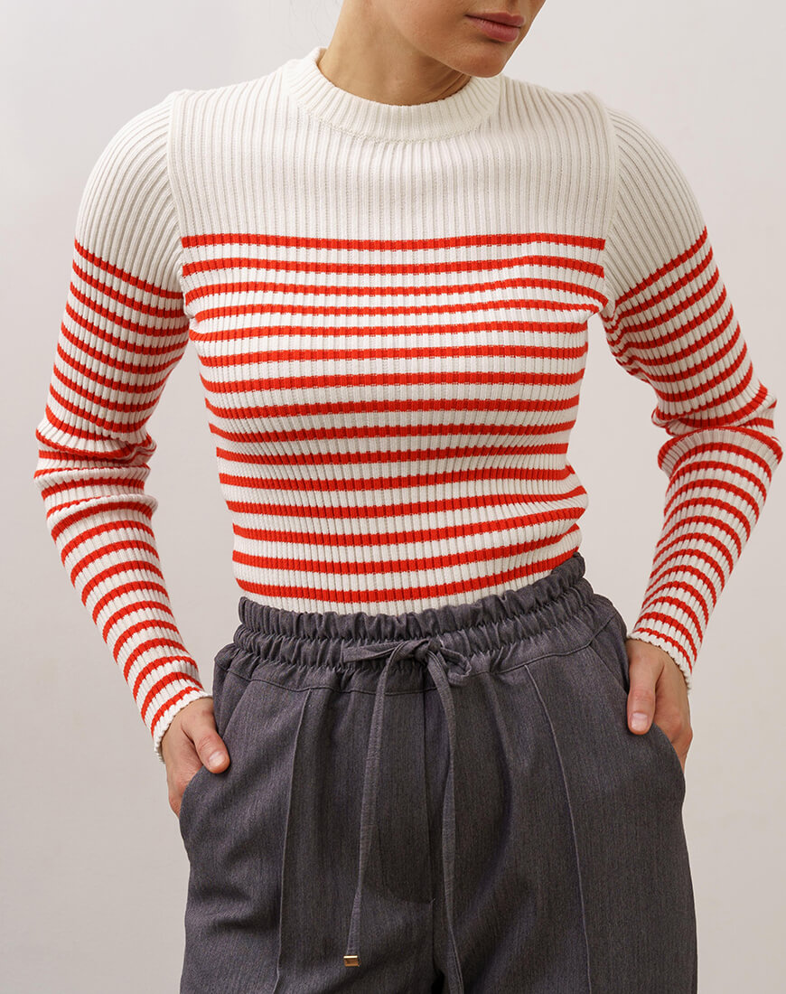 Бавовняний трикотакжний светр в рубчик, прикращений молочно-червоними смужками. Цей светр поєднує у собі сучасність та елегантність.