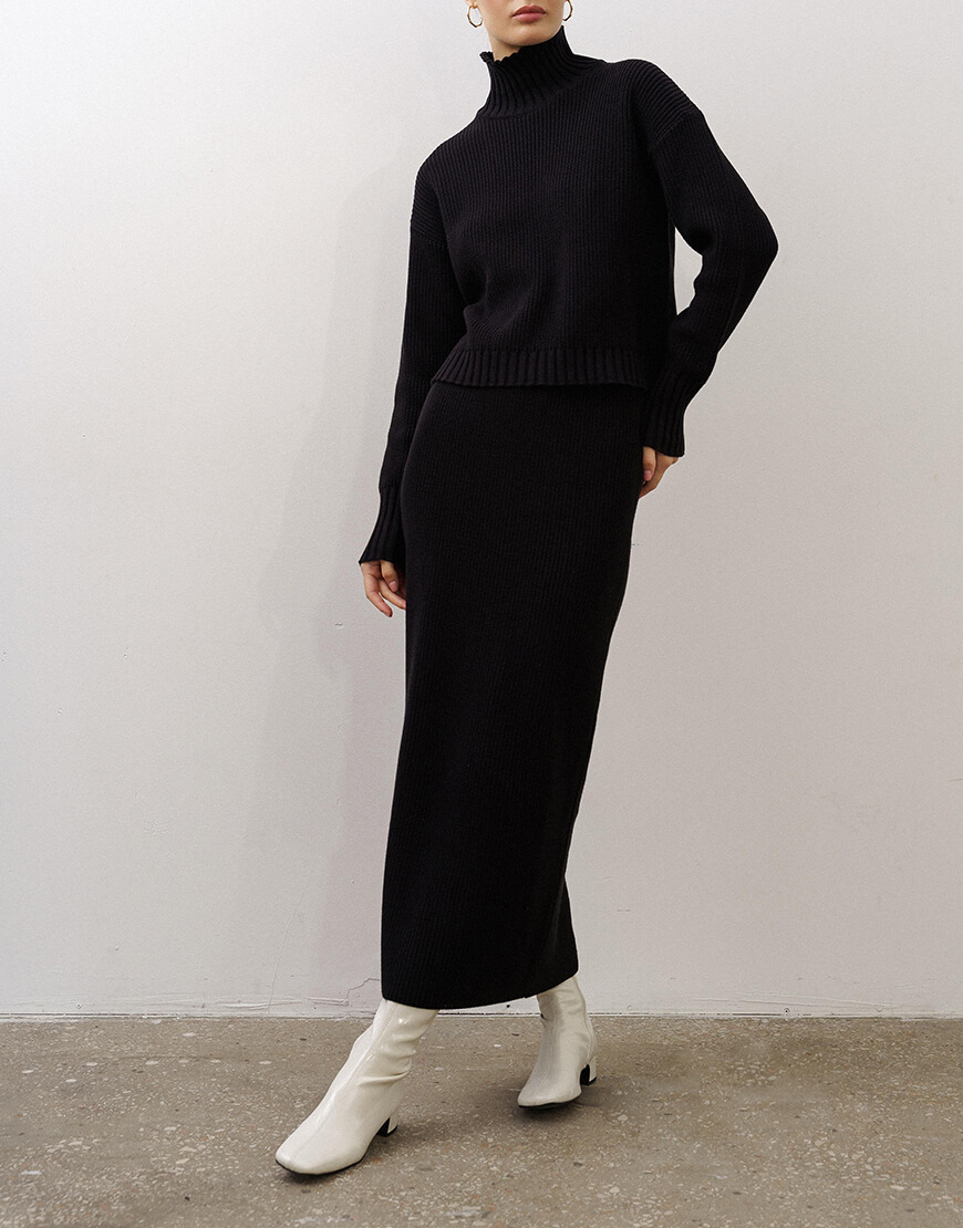 Костюм складається з вкороченого светра – лаконічна модель, без якої важко уявити сучасний базовий гардероб та прителеної спідниці максі. Костюм надзвичайно приємний та затишний завдяки м’якій вовні та “дихає” завдяки бавовні.