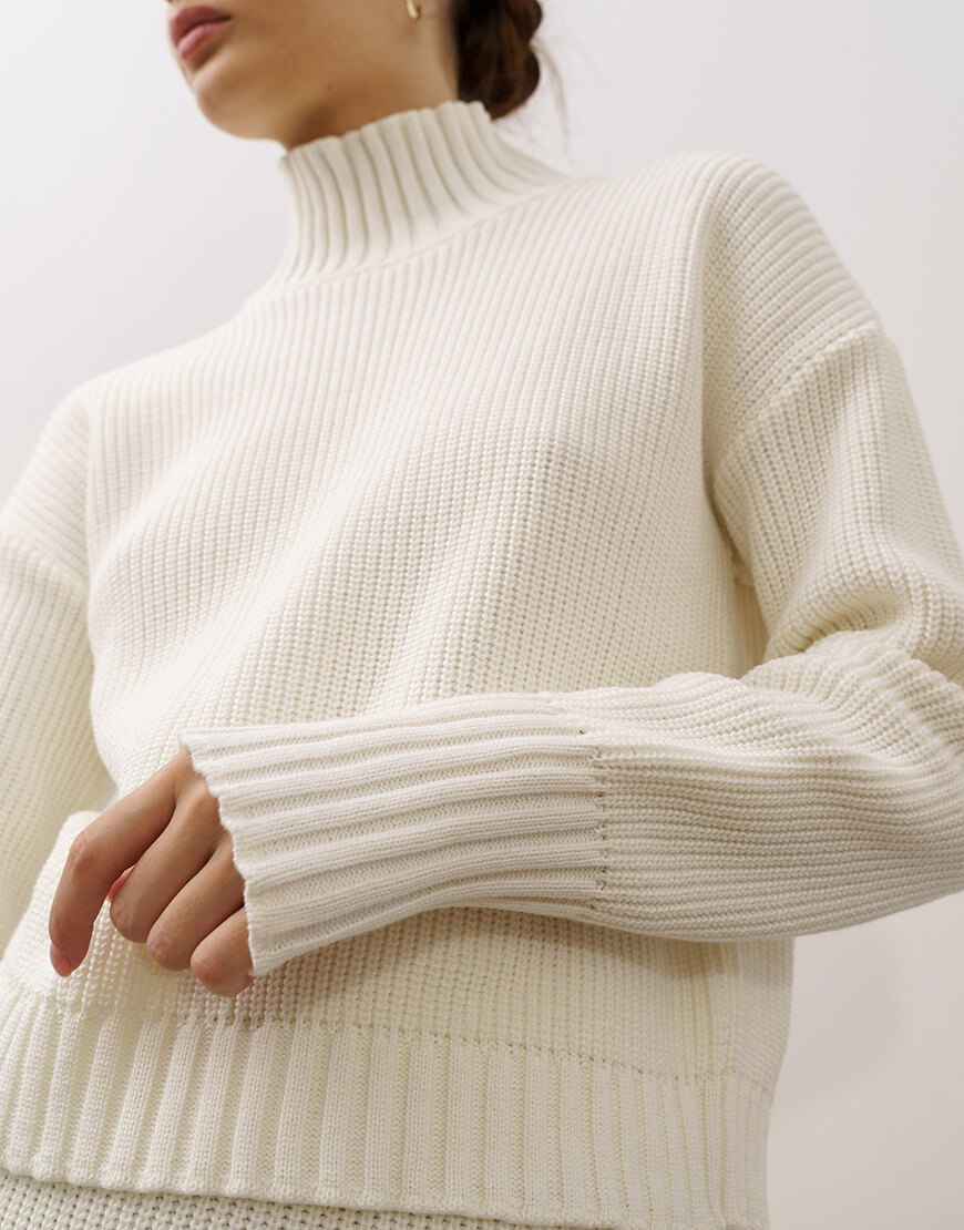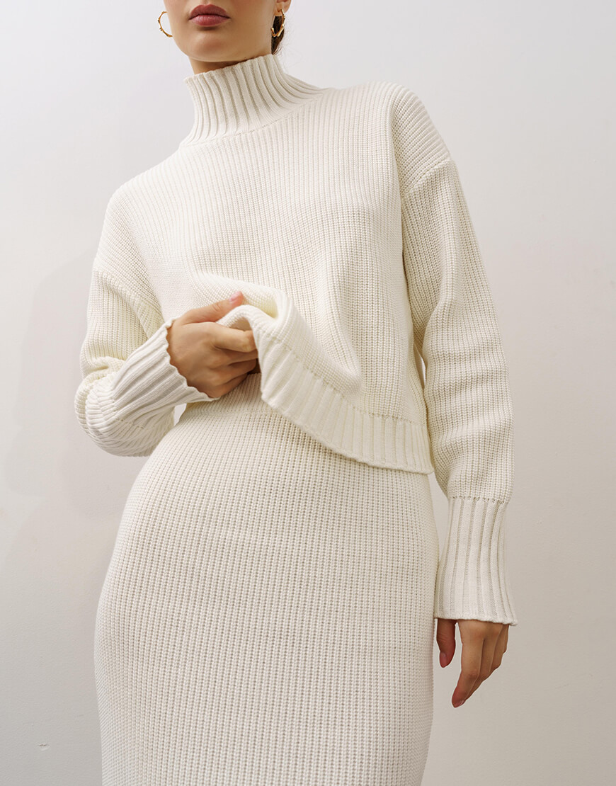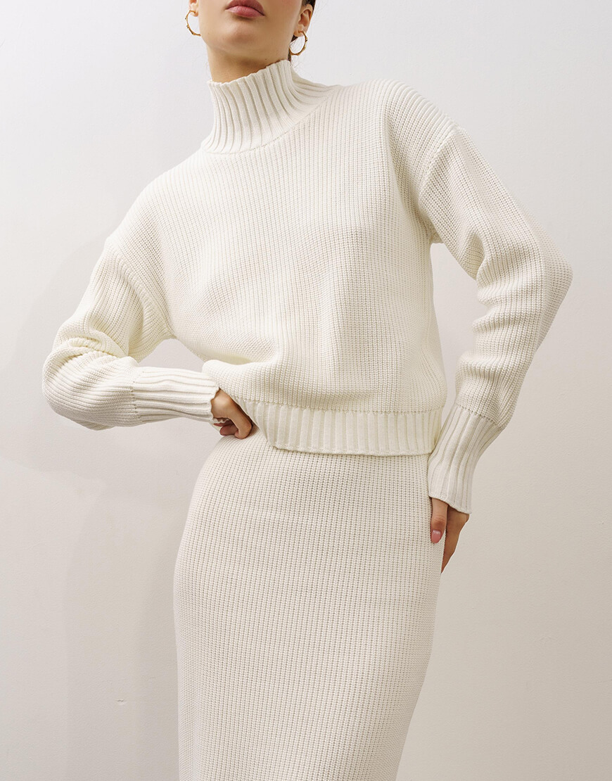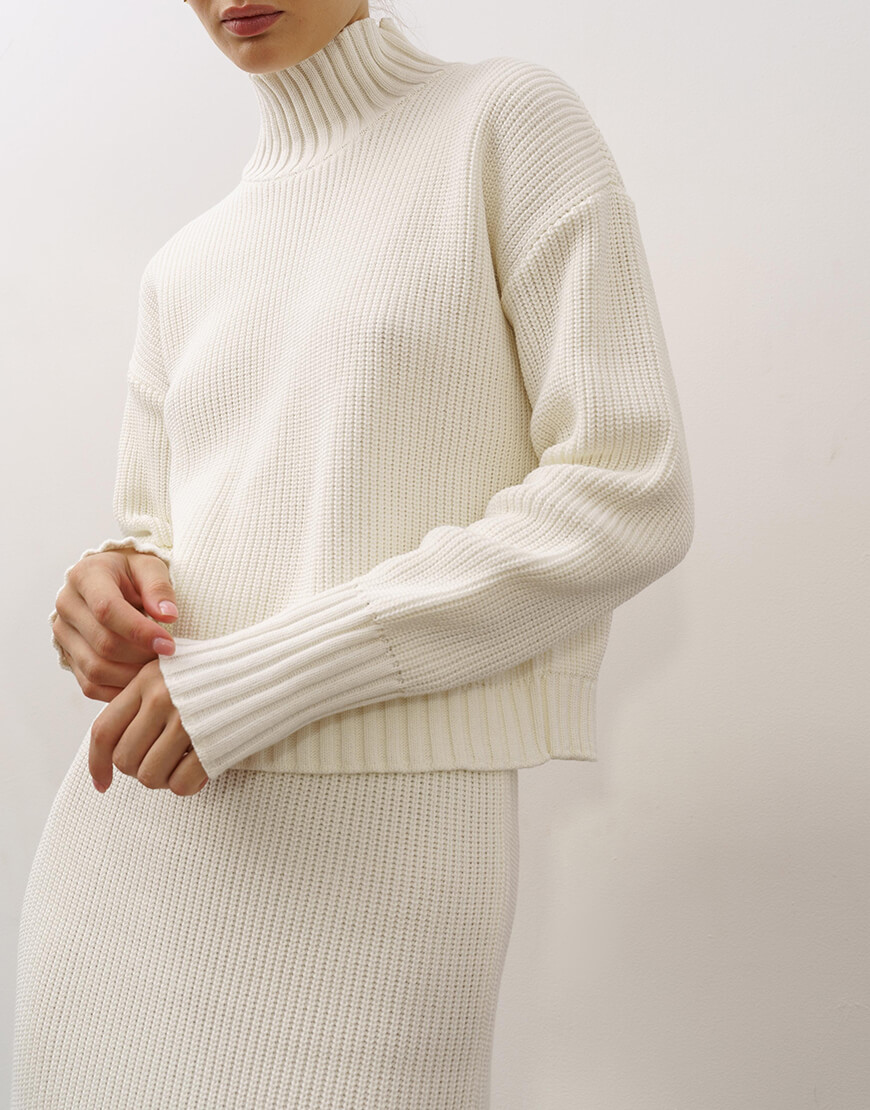 Костюм складається з вкороченого светра – лаконічна модель, без якої важко уявити сучасний базовий гардероб та прителеної спідниці максі. Костюм надзвичайно приємний та затишний завдяки м’якій вовні та “дихає” завдяки бавовні.