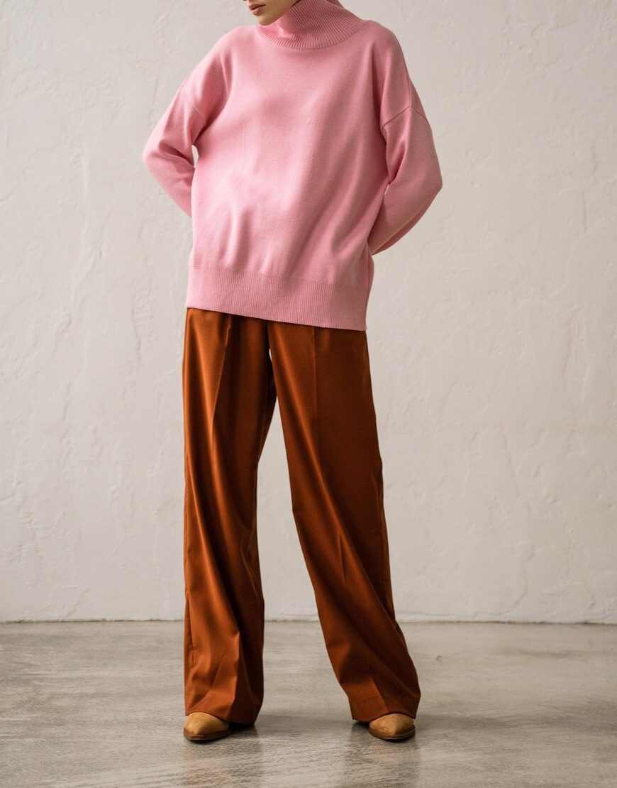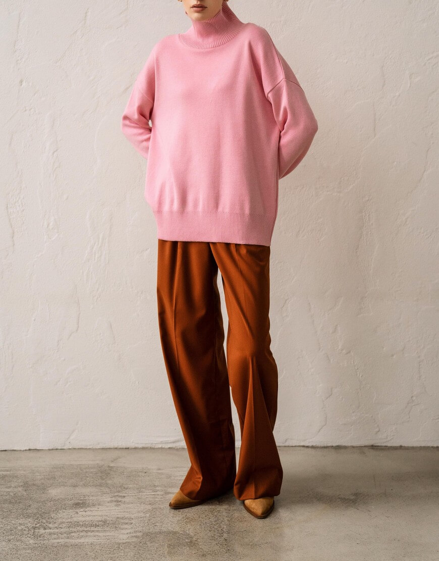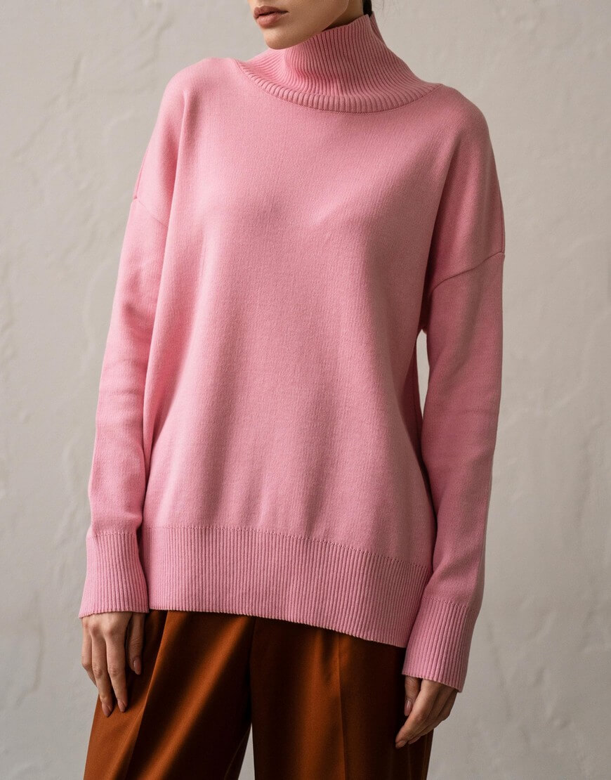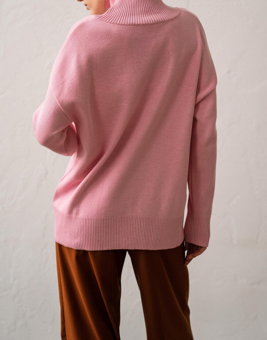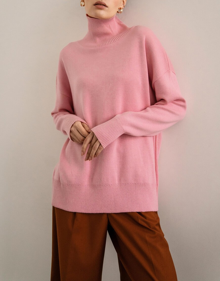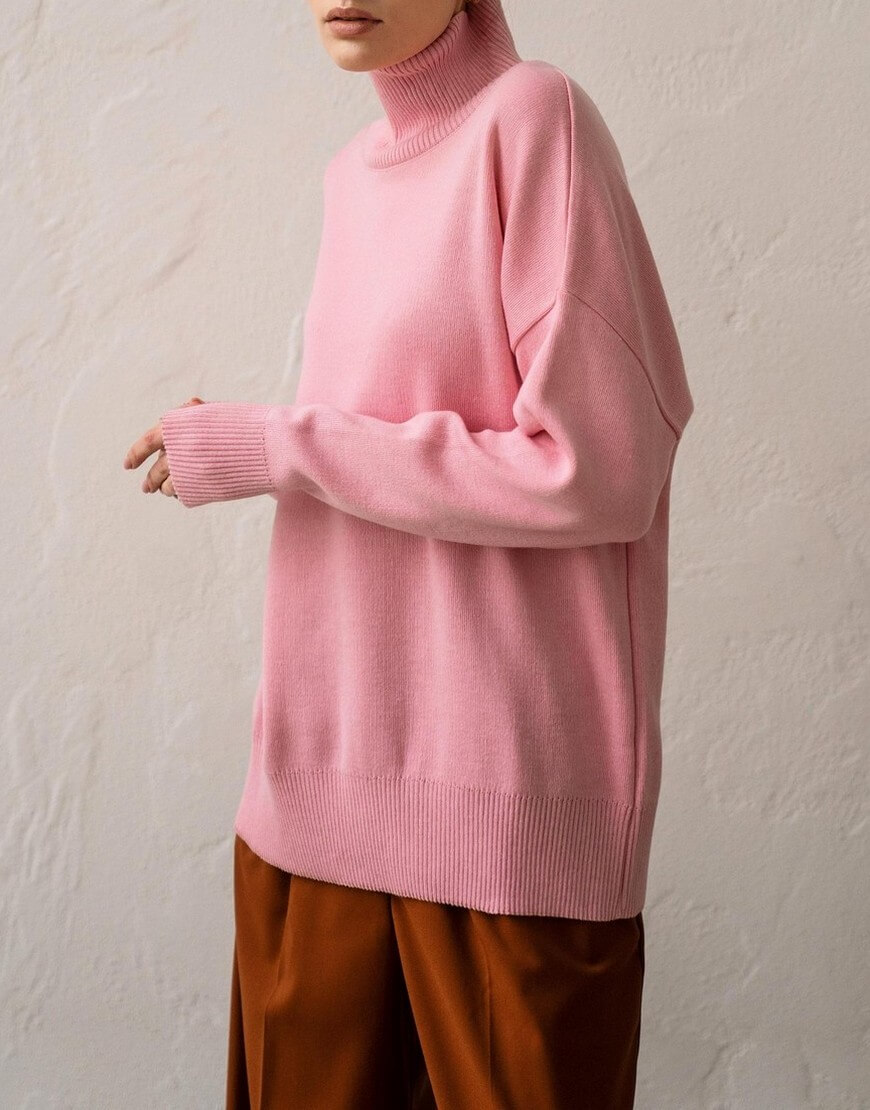 Доставка впродовж 2-5 робочих днівСветр виконаний з м’якої та приємної до тіла пряжі. Модель вільного крою, зі спущеною лінією плеча та з високою горловиною в рубчик. Манжети та нижній край вив’язані широкою резинкою, завдяки якій краї светру не розтягуються.