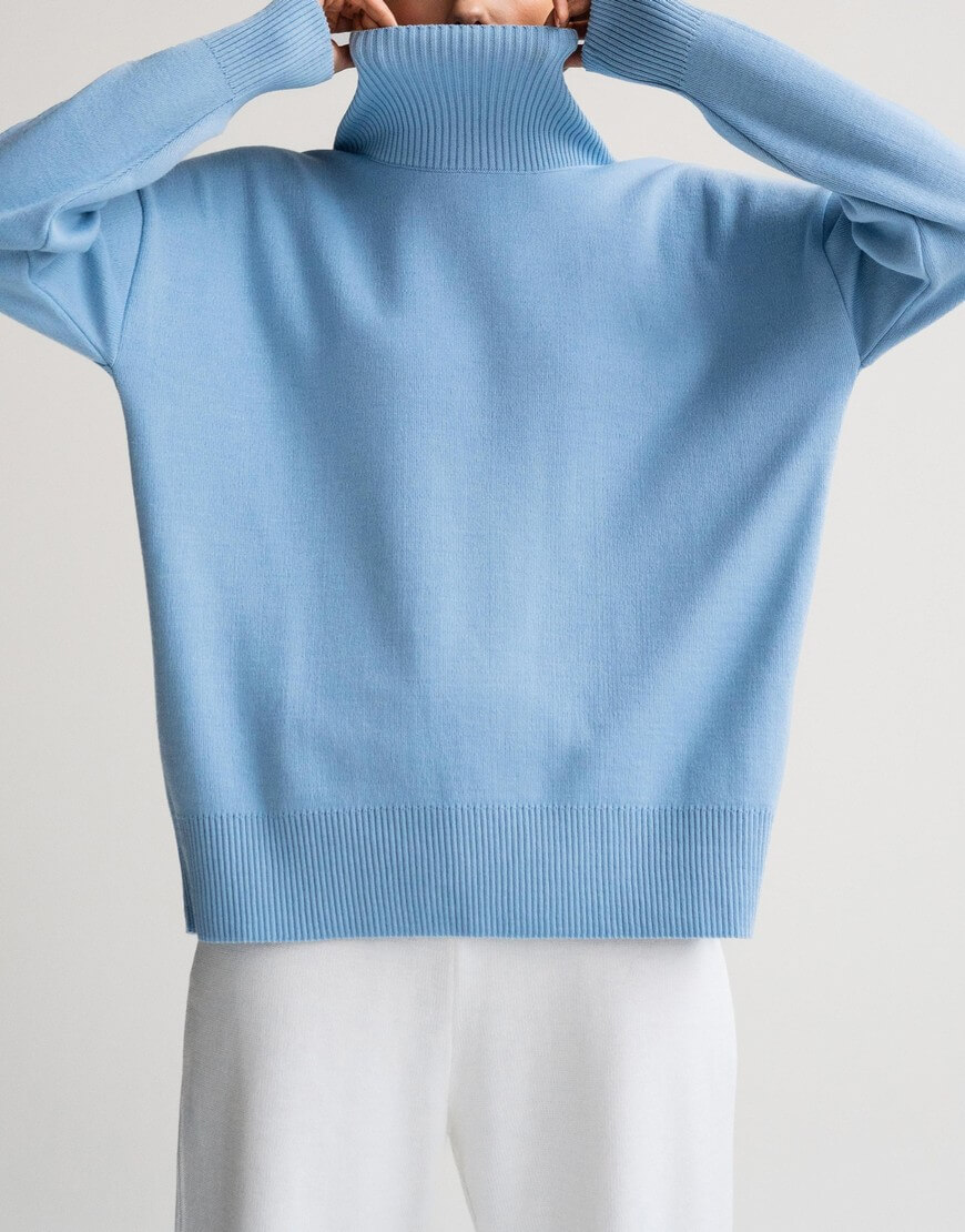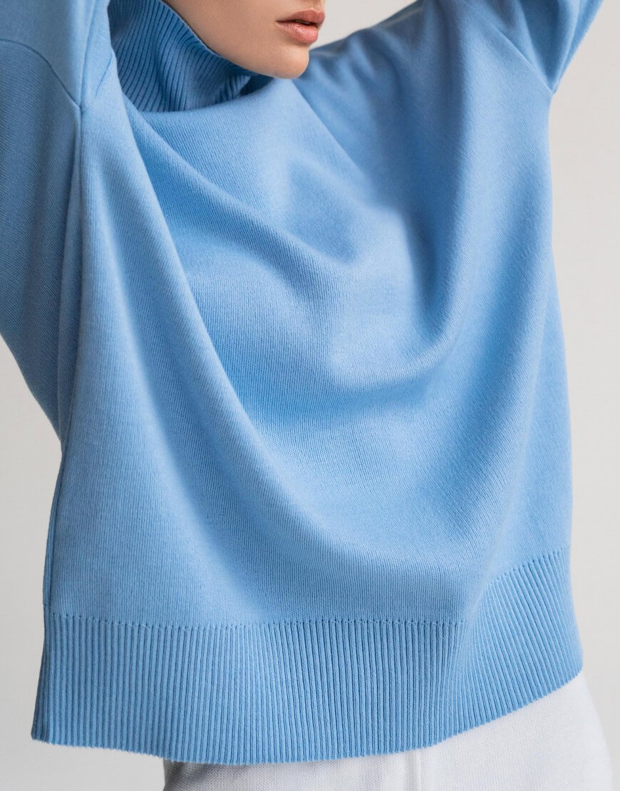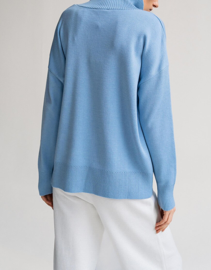 Светр виконаний з м’якої та приємної до тіла пряжі. Модель вільного крою, зі спущеною лінією плеча та з високою горловиною в рубчик. Манжети та нижній край вив’язані широкою резинкою, завдяки якій краї светру не розтягуються.