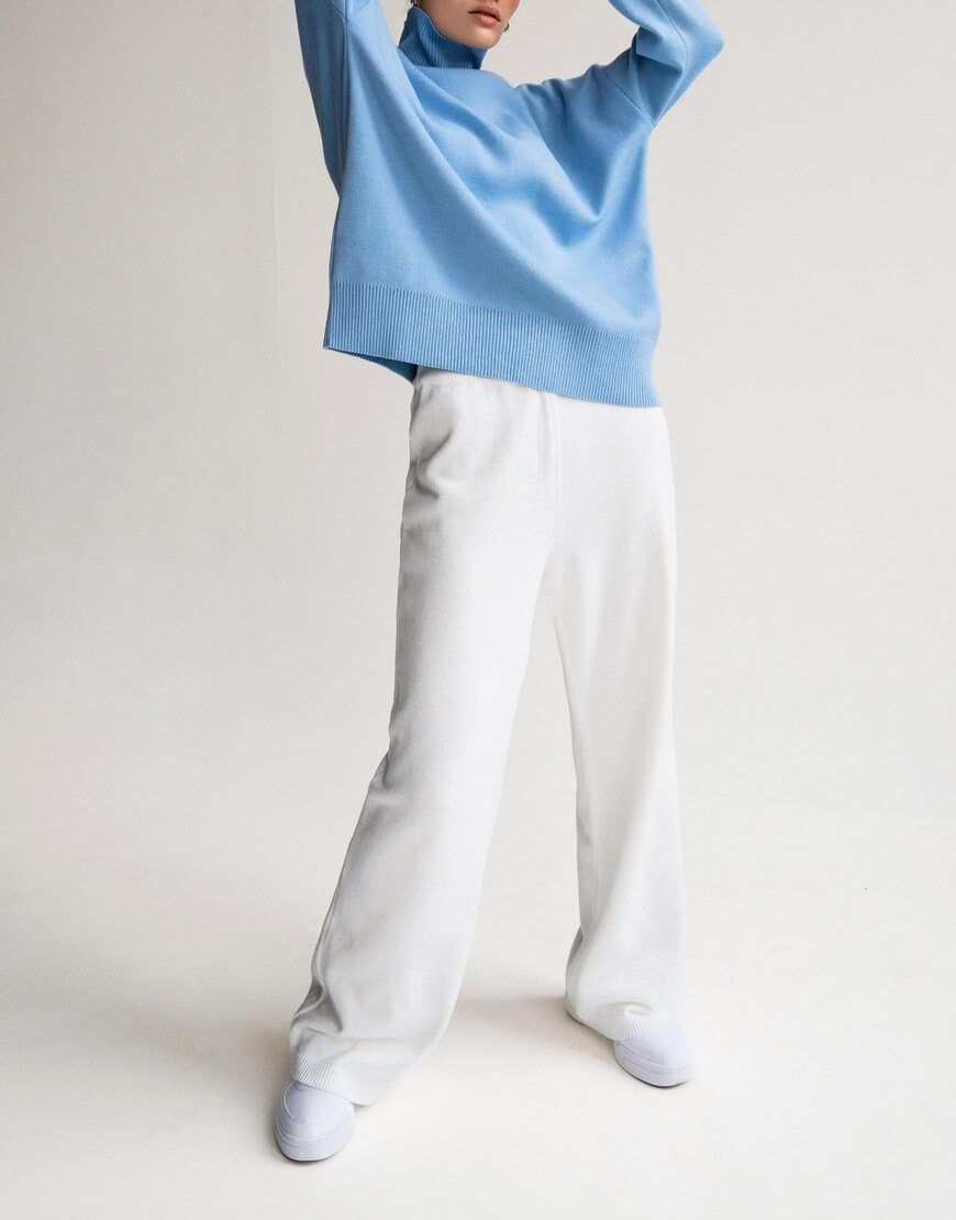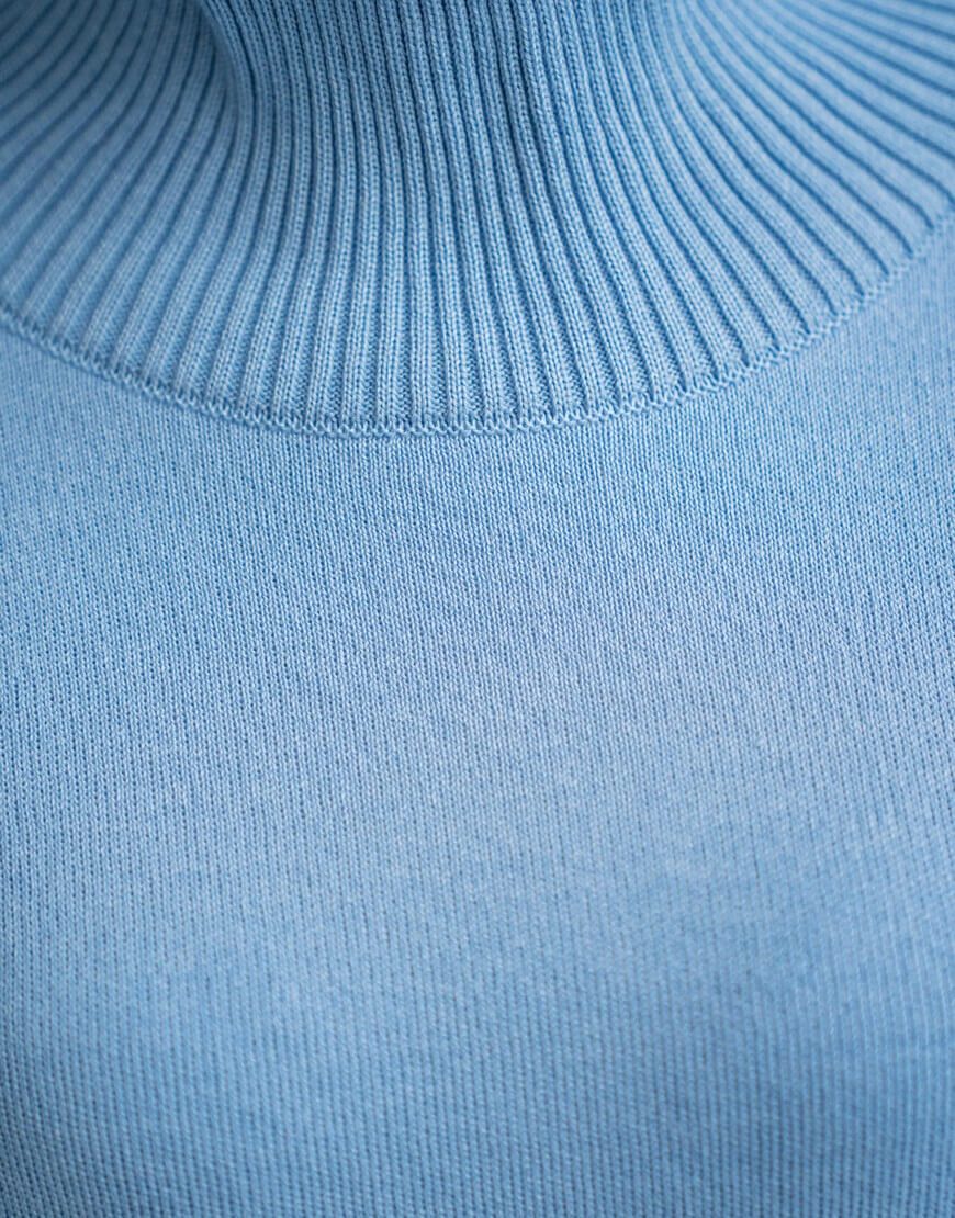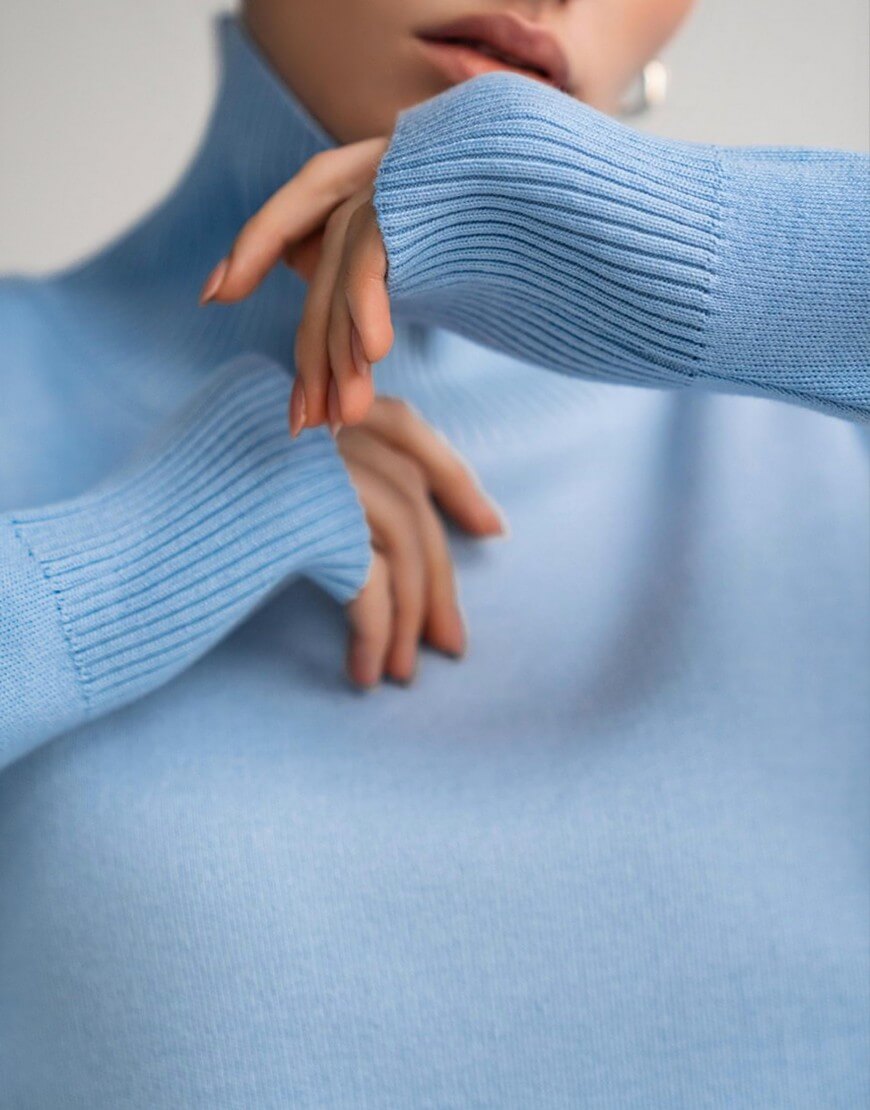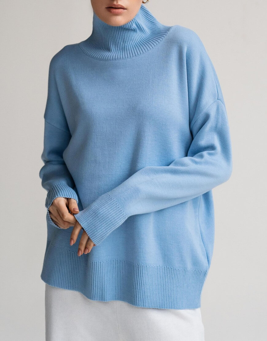 Светр виконаний з м’якої та приємної до тіла пряжі. Модель вільного крою, зі спущеною лінією плеча та з високою горловиною в рубчик. Манжети та нижній край вив’язані широкою резинкою, завдяки якій краї светру не розтягуються.