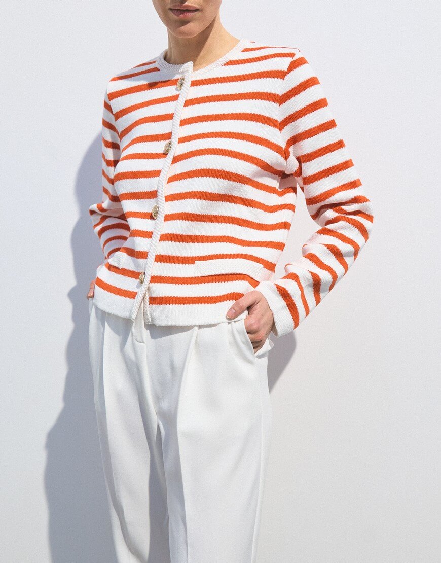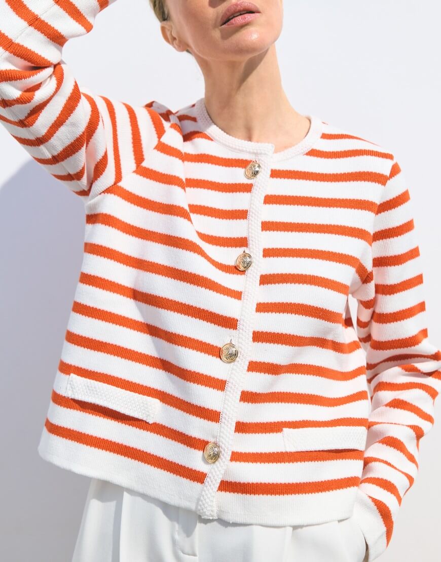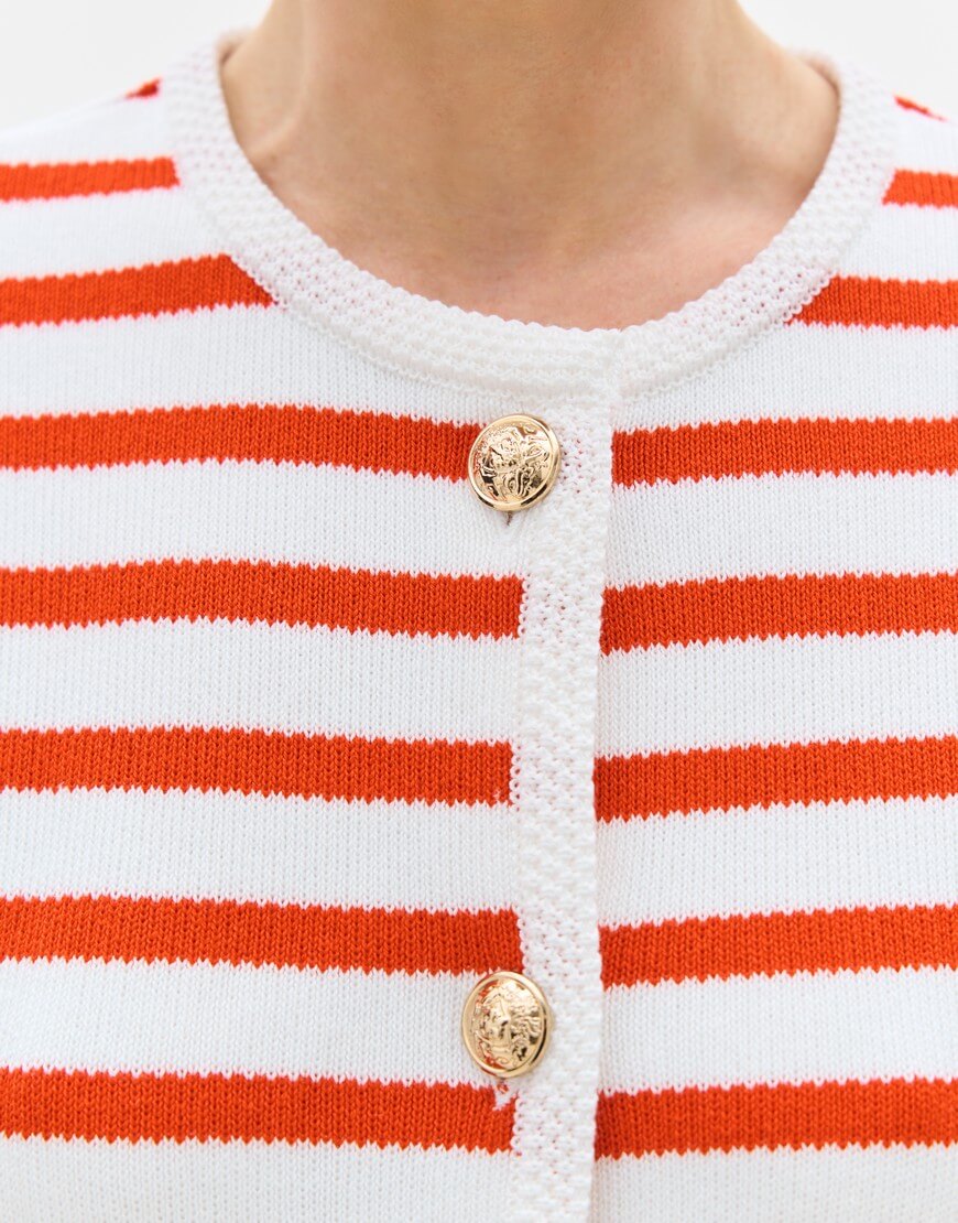 Кардиган у смужку прямого вільного крою. Кардиган стилізований золотими ґудзиками та декоративними кишенями. Горловина, планка та декоративні кишені виконані у вигляді візерунка “рис”.