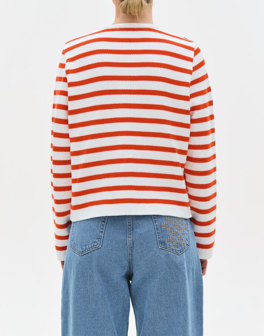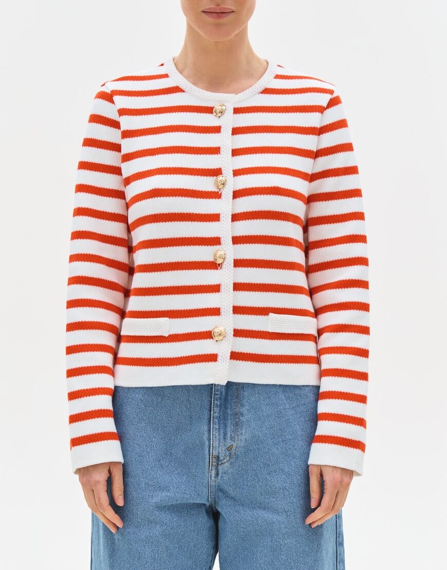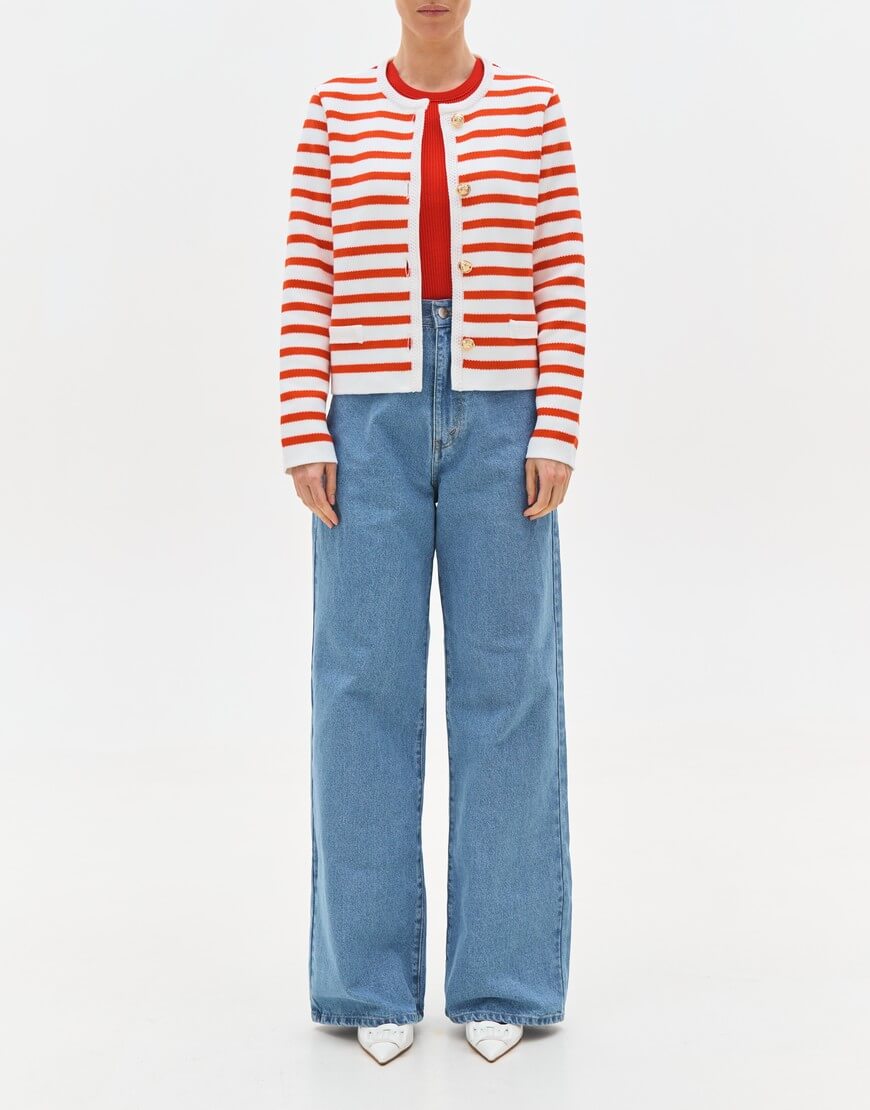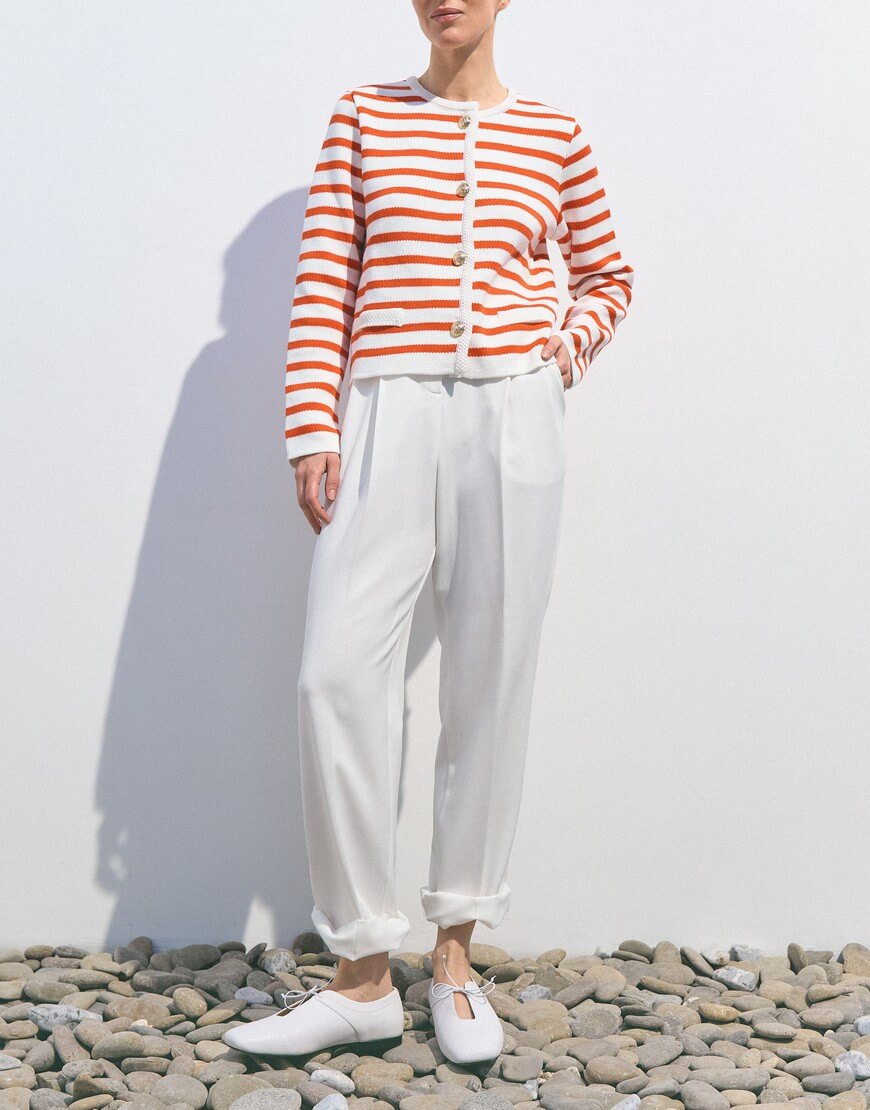 Кардиган у смужку прямого вільного крою. Кардиган стилізований золотими ґудзиками та декоративними кишенями. Горловина, планка та декоративні кишені виконані у вигляді візерунка “рис”.