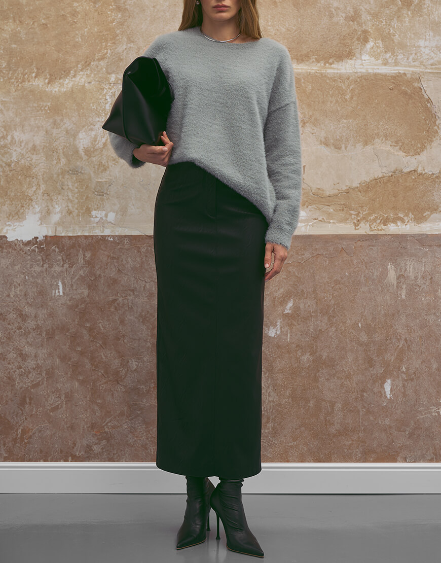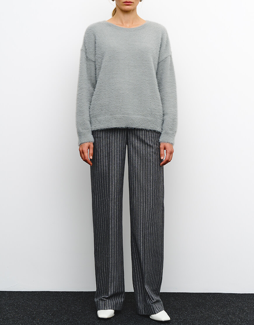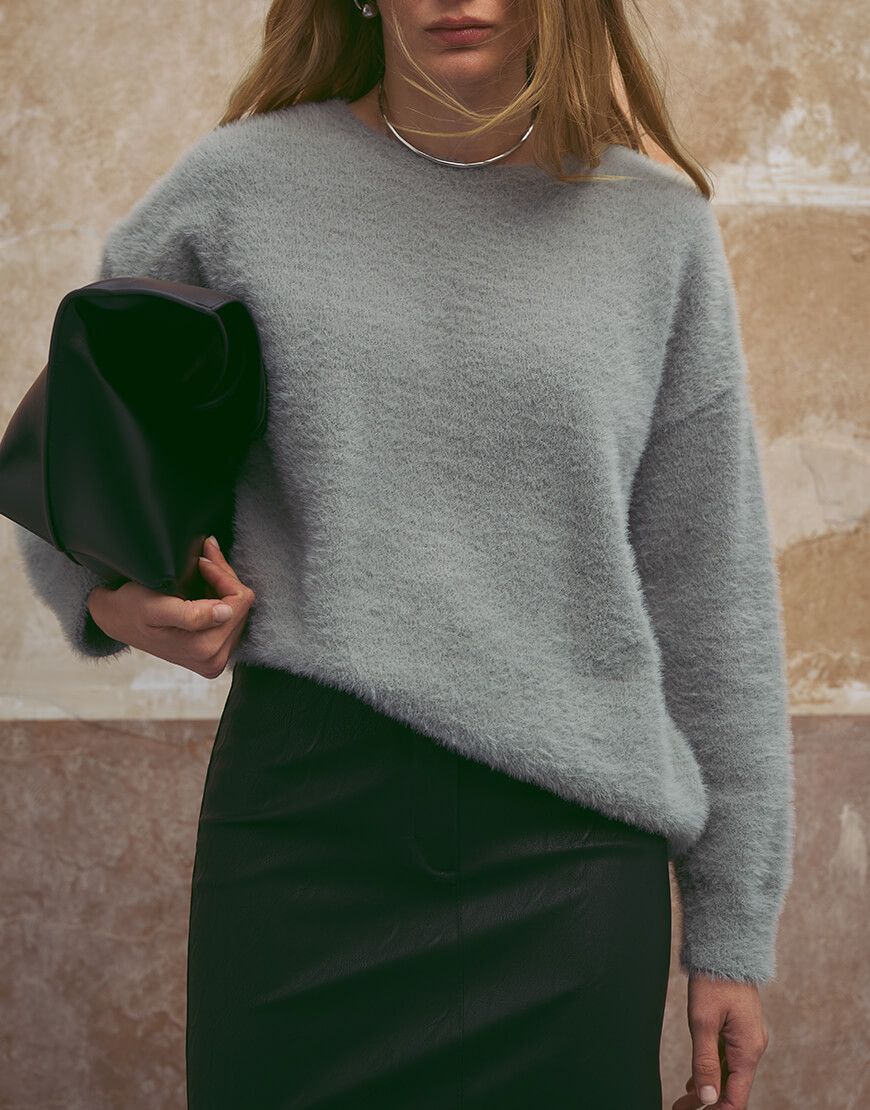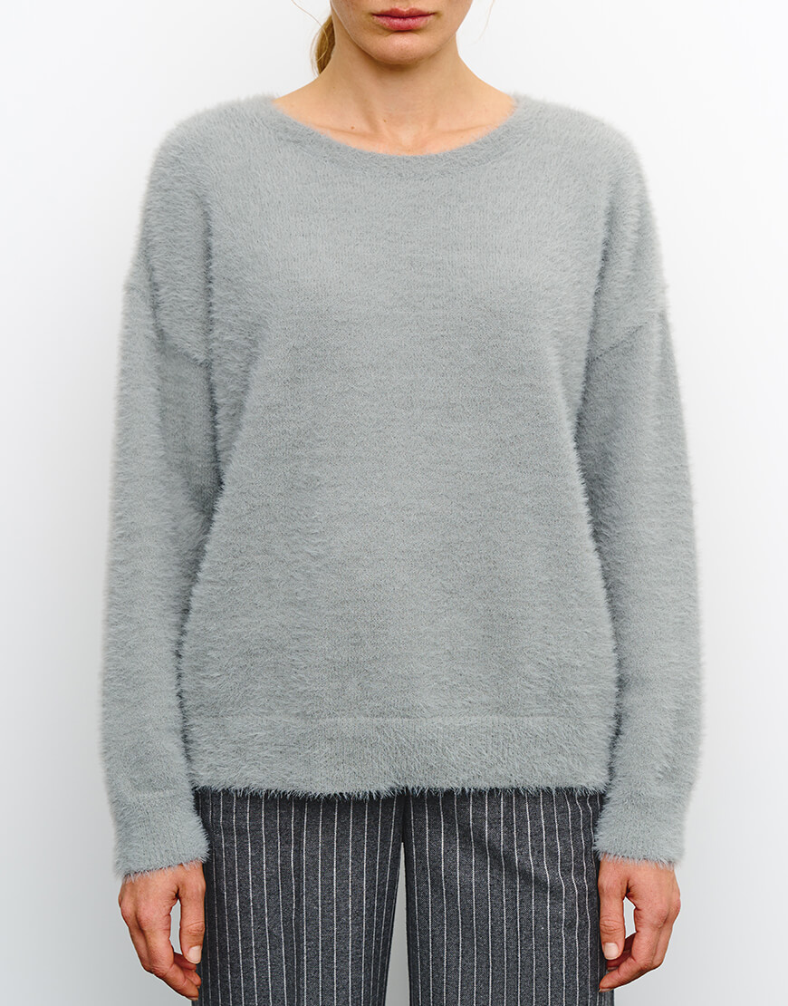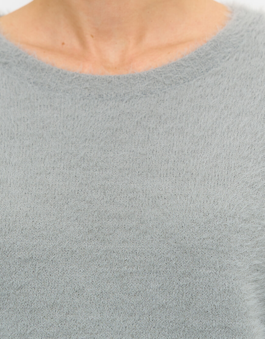Затишний светр виконаний з м’якої та приємної до тіла пряжі з ворсом. Модель вільного крою, зі спущеною лінією плеча та з круглою горловиною.
