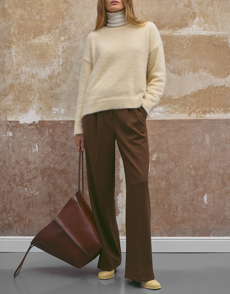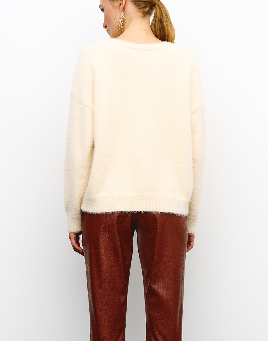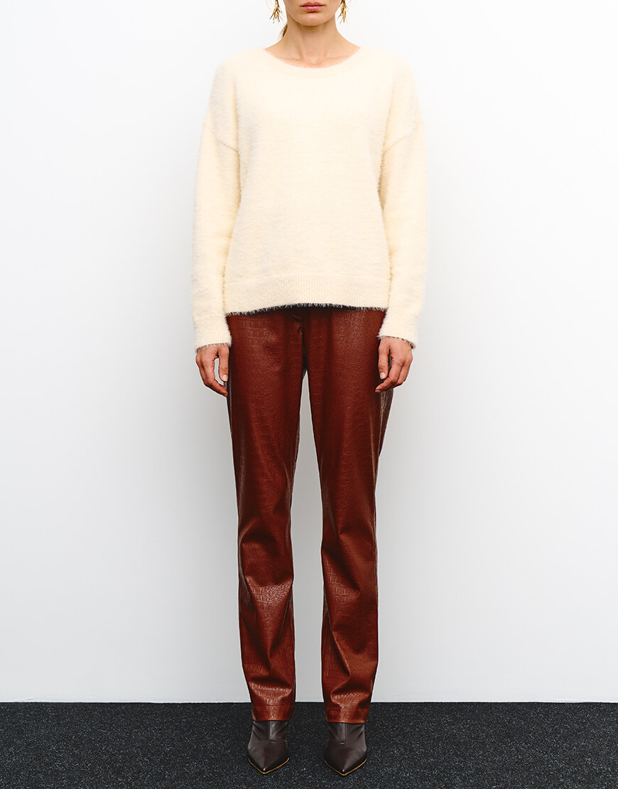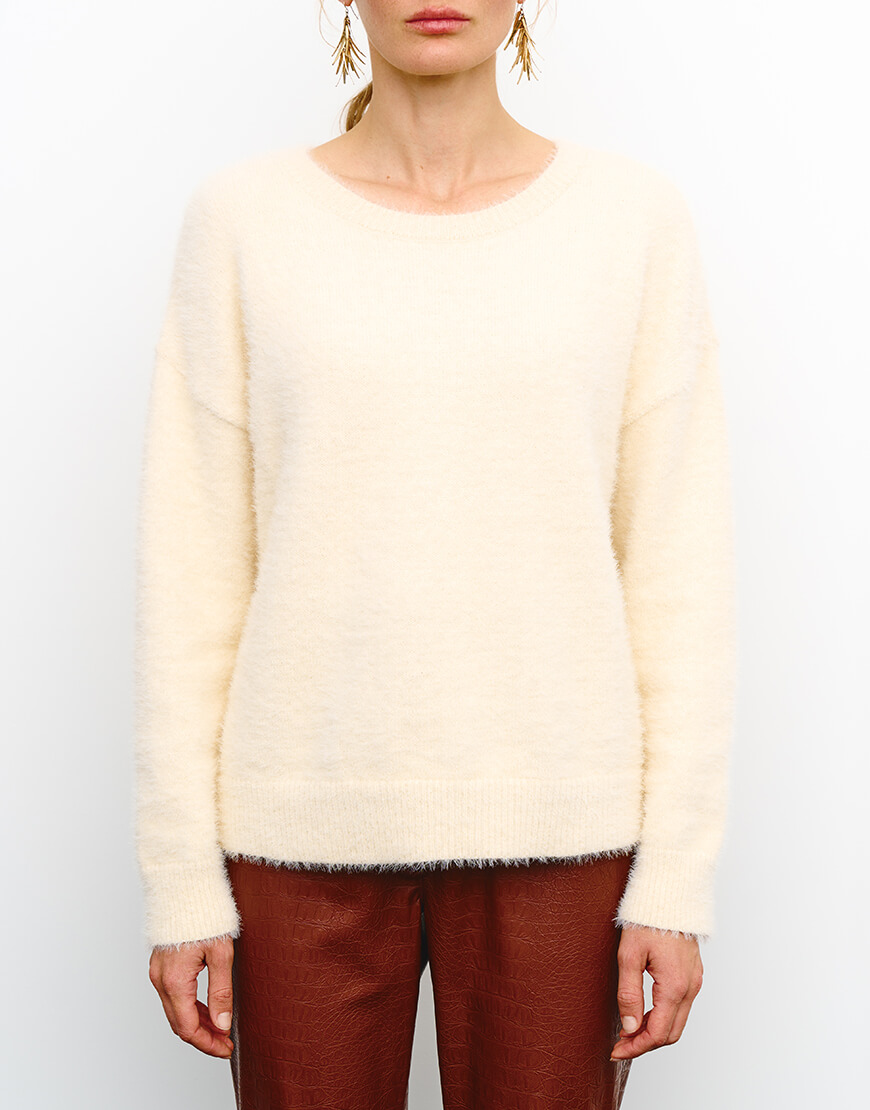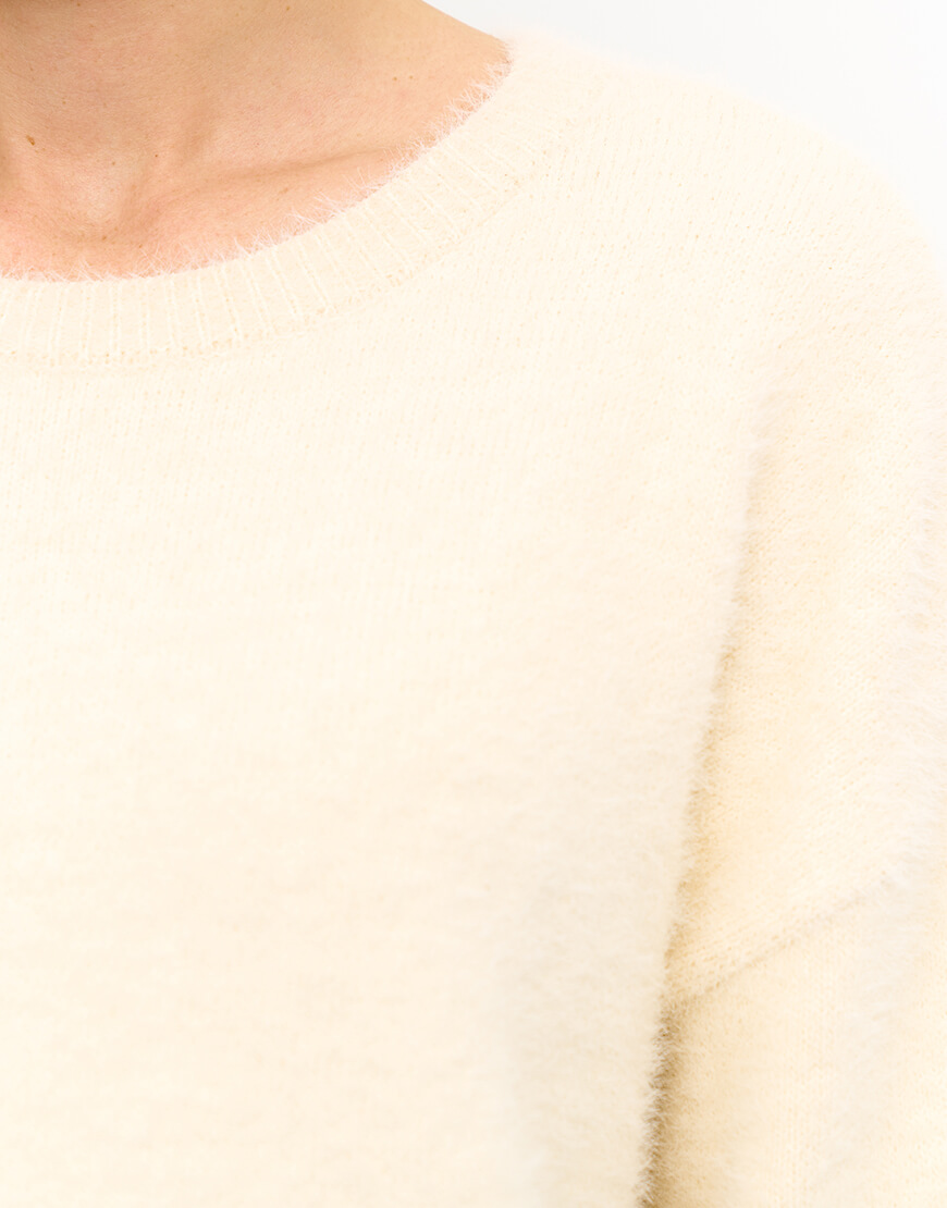 Затишний светр виконаний з м’якої та приємної до тіла пряжі з ворсом. Модель вільного крою, зі спущеною лінією плеча та з круглою горловиною.