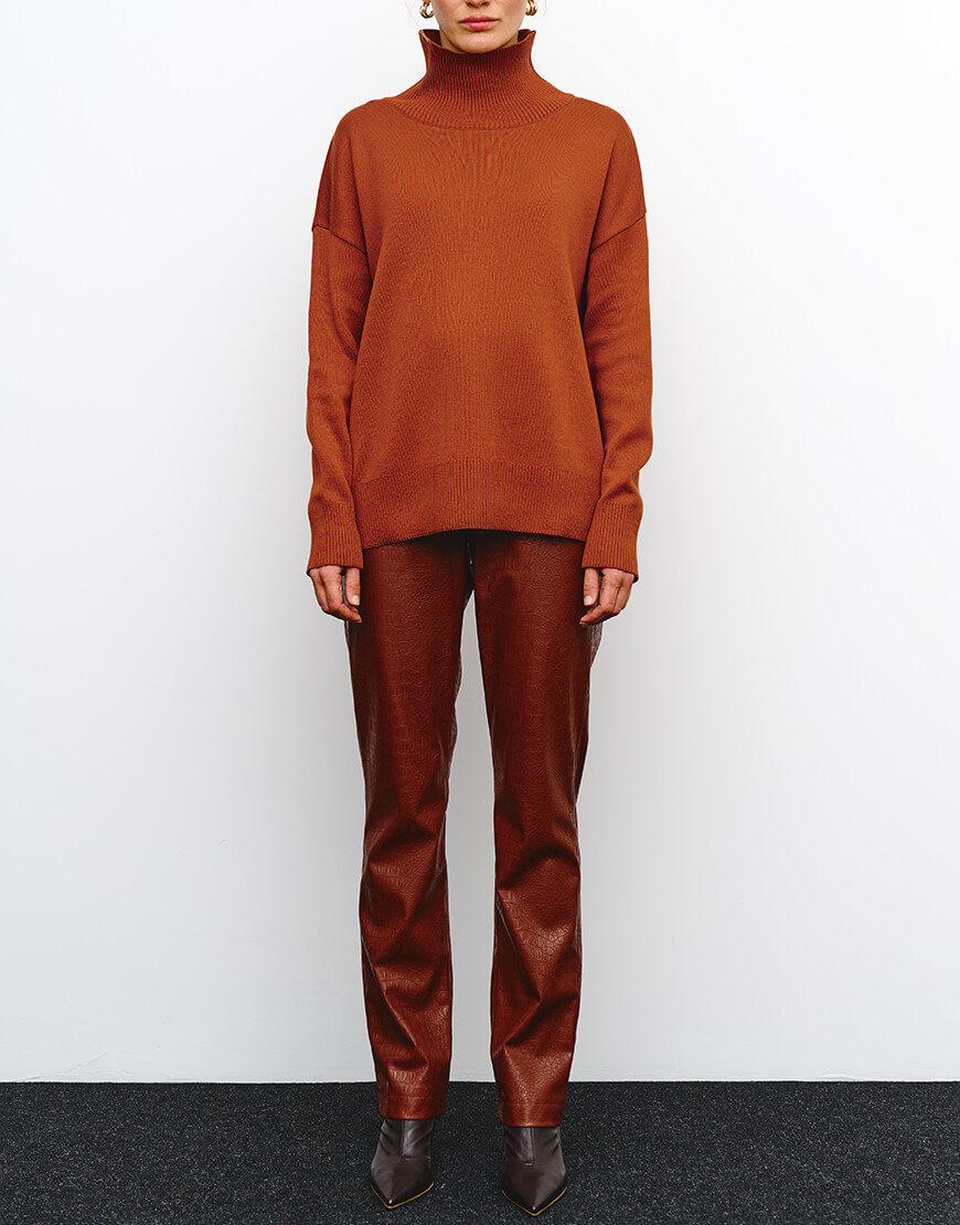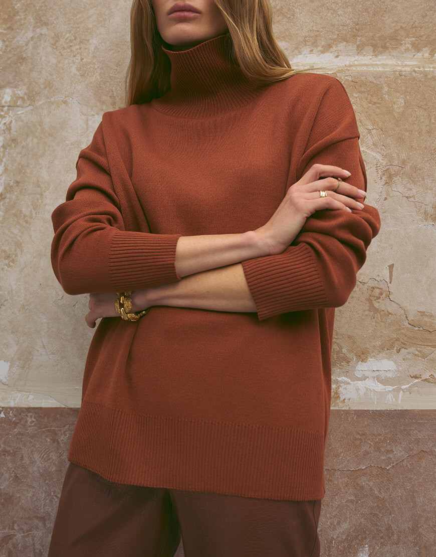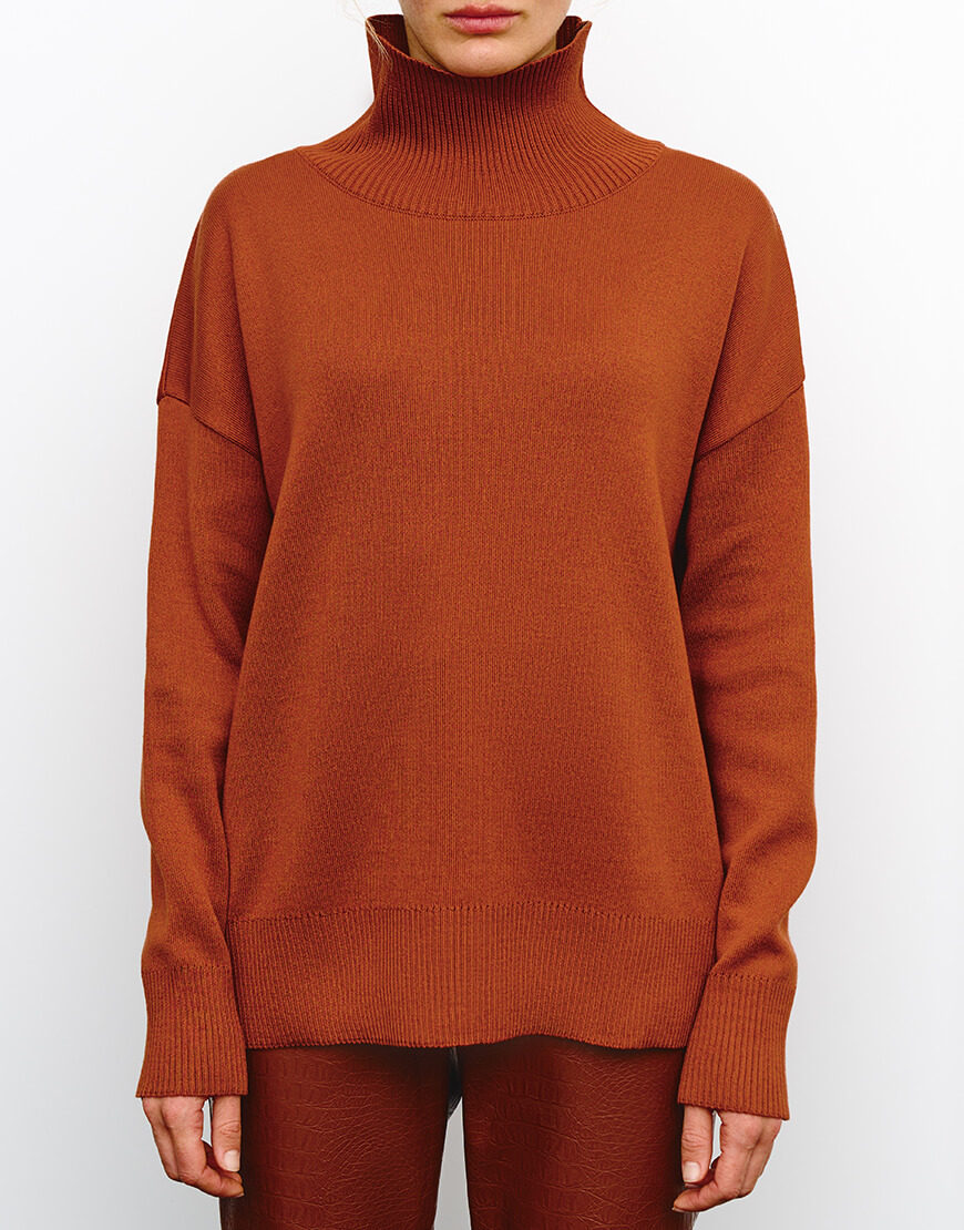 Доставка впродовж 2-5 робочих днівСветр виконаний з м’якої та приємної до тіла пряжі. Модель вільного крою, зі спущеною лінією плеча та з високою горловиною в рубчик. Манжети та нижній край вив’язані широкою резинкою, завдяки якій краї светра не розтягуються.