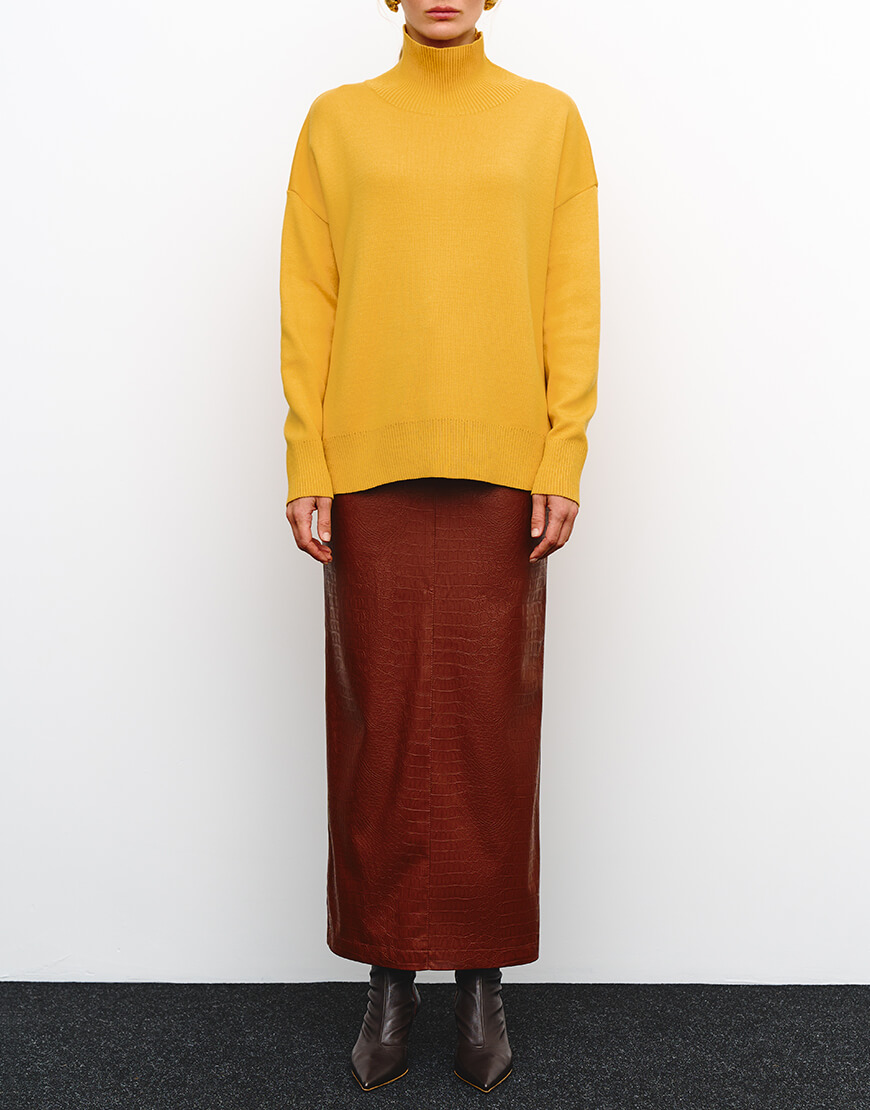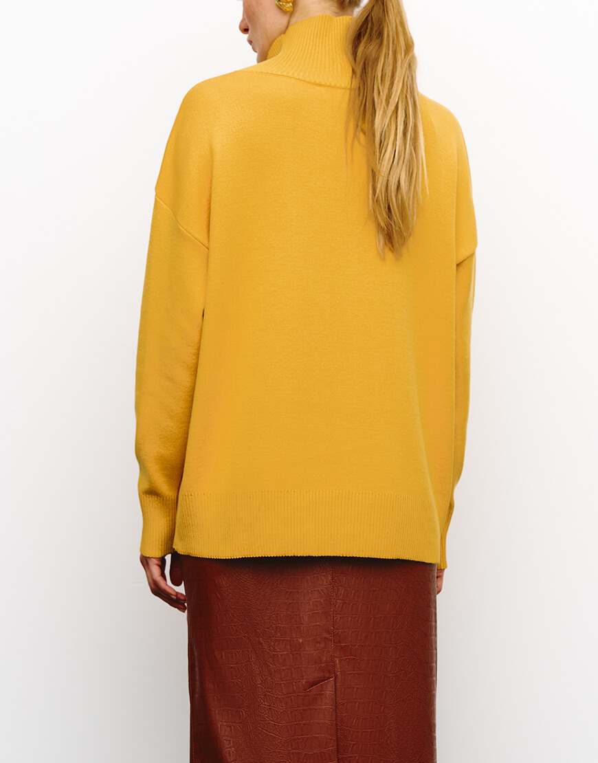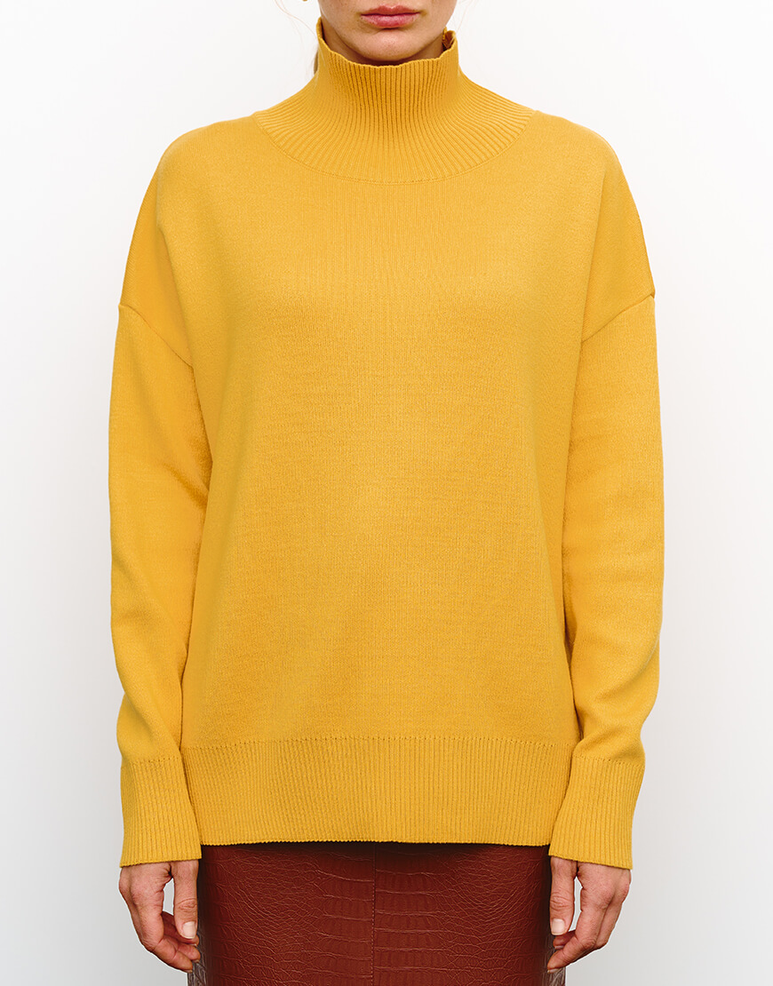 Светр виконаний з м’якої та приємної до тіла пряжі. Модель вільного крою, зі спущеною лінією плеча та з високою горловиною в рубчик. Манжети та нижній край вив’язані широкою резинкою, завдяки якій краї светра не розтягуються.