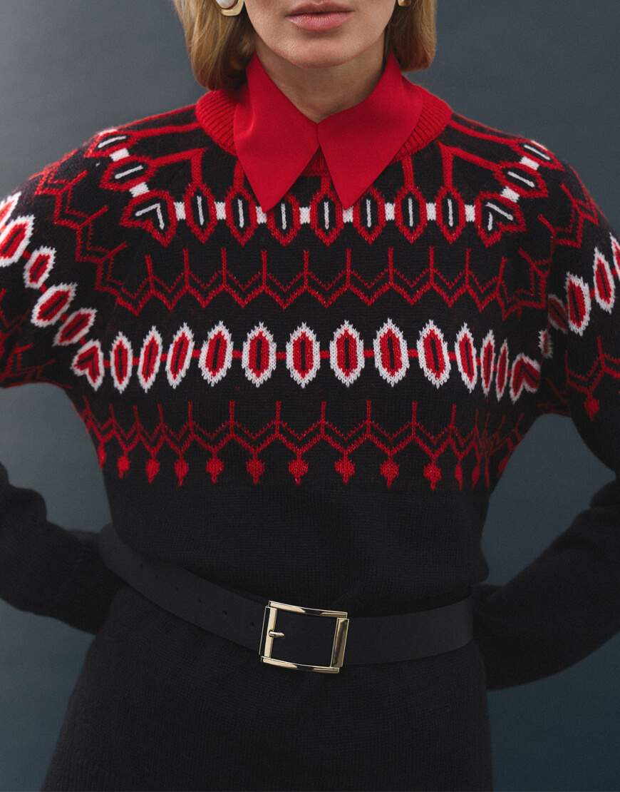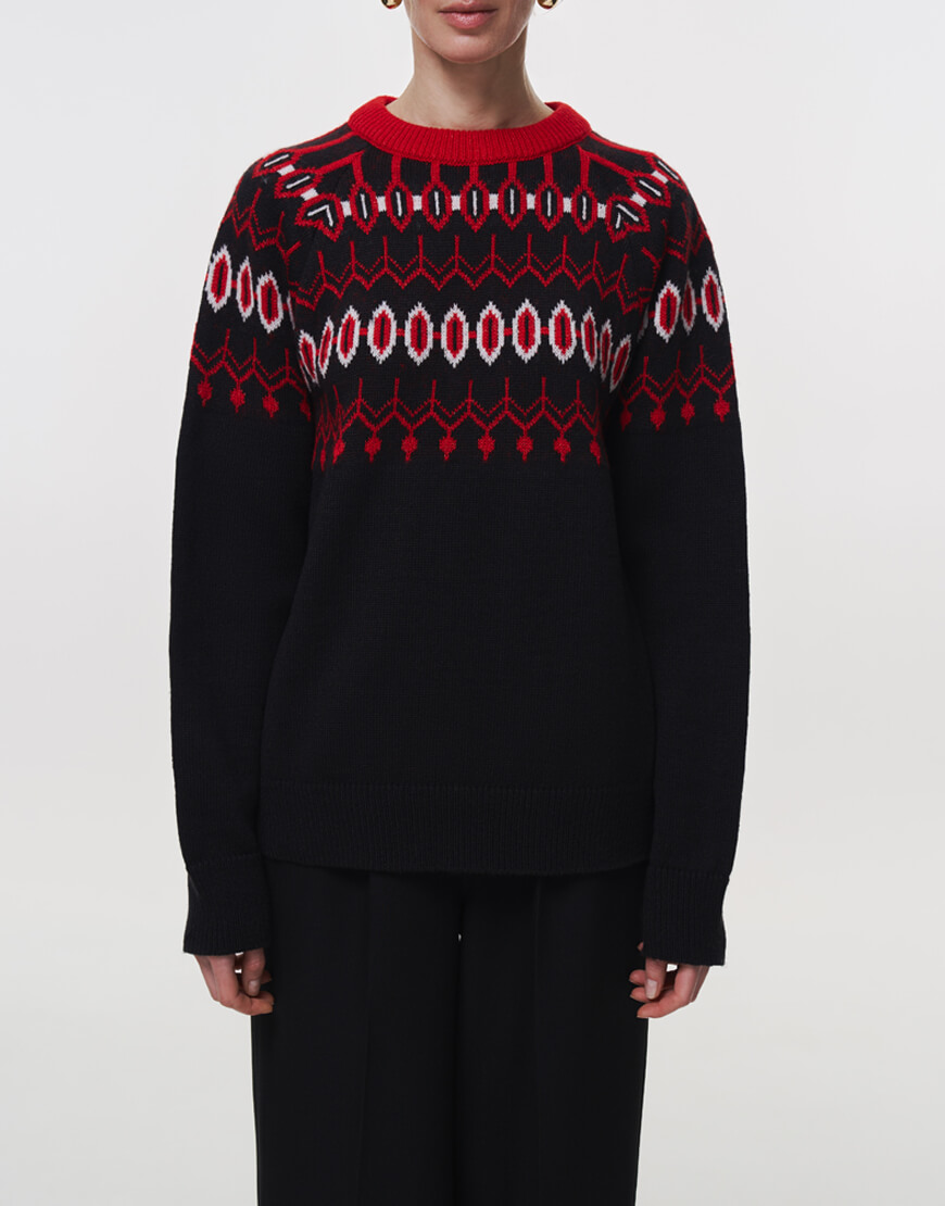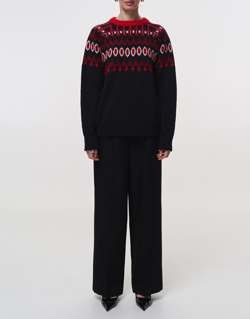 Затишний та неймовірно теплий светр, оздоблений візерунками. Светр об’ємного та вільного крою, з круглою горловиною та спущеною лінією плеча.