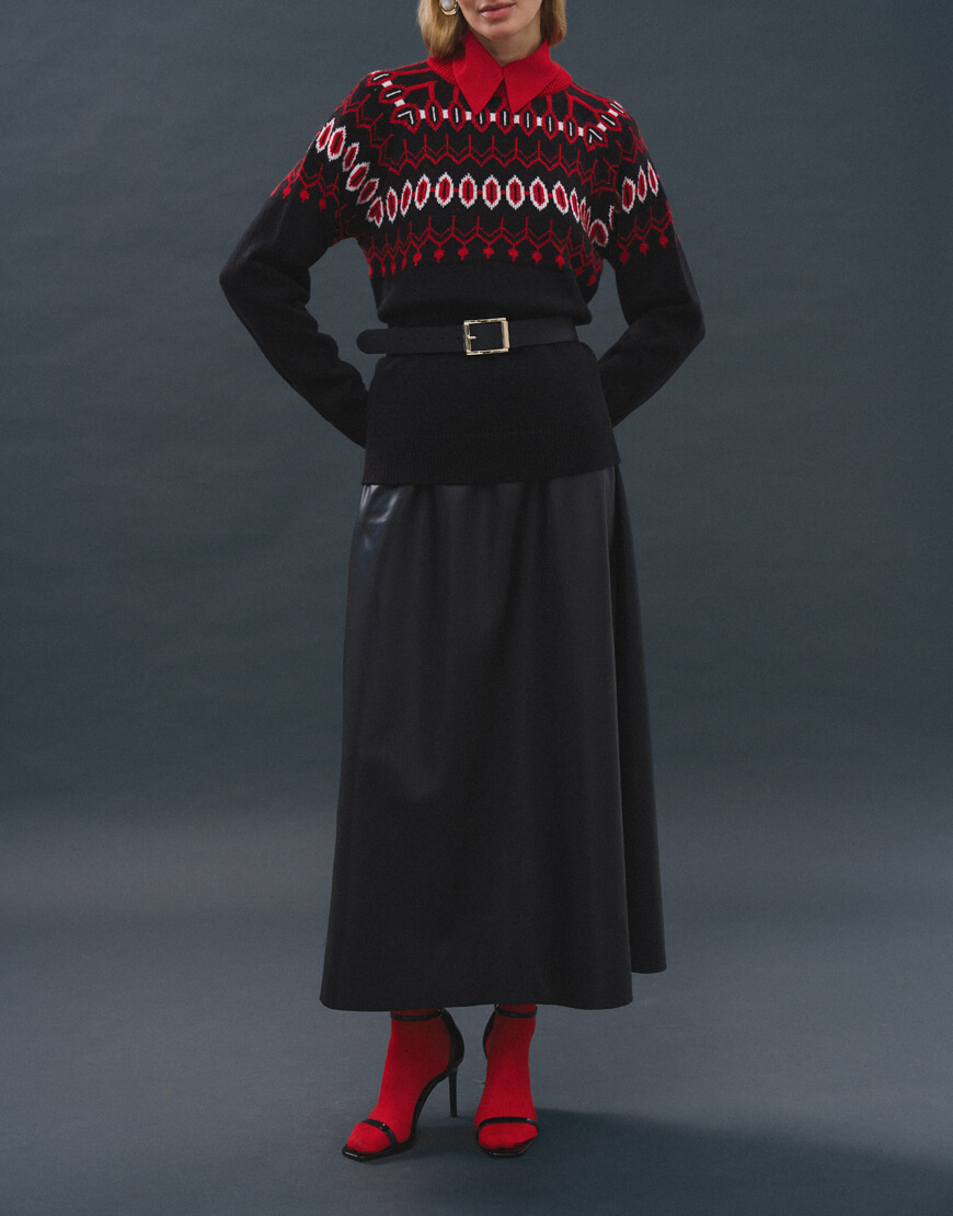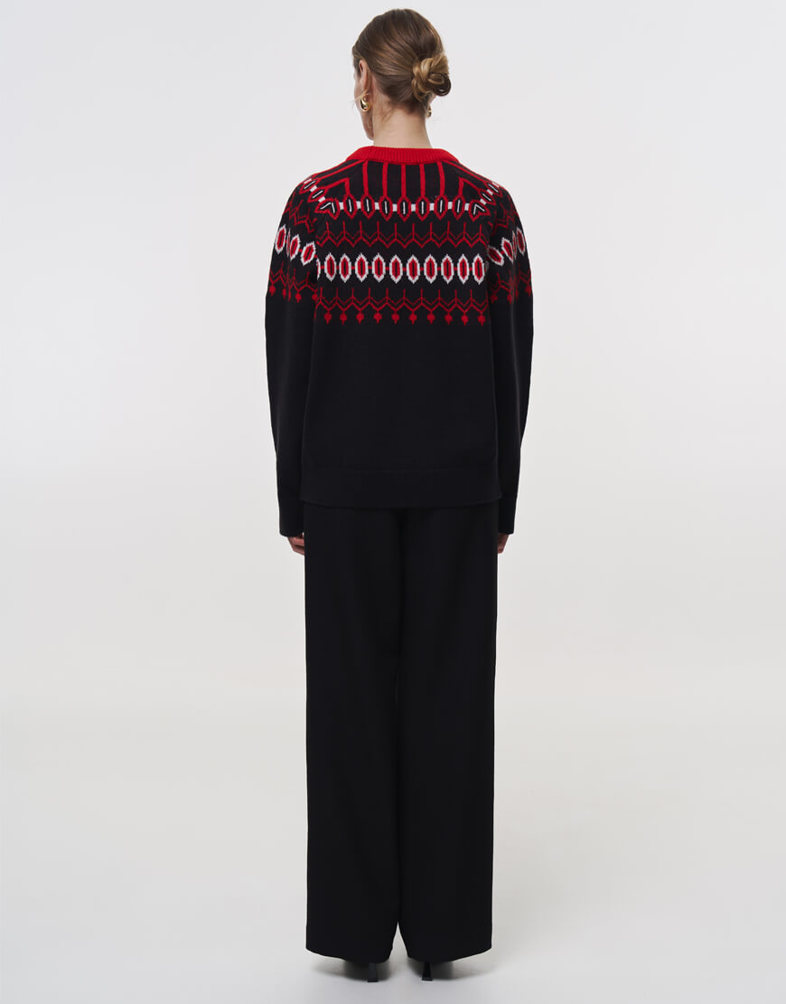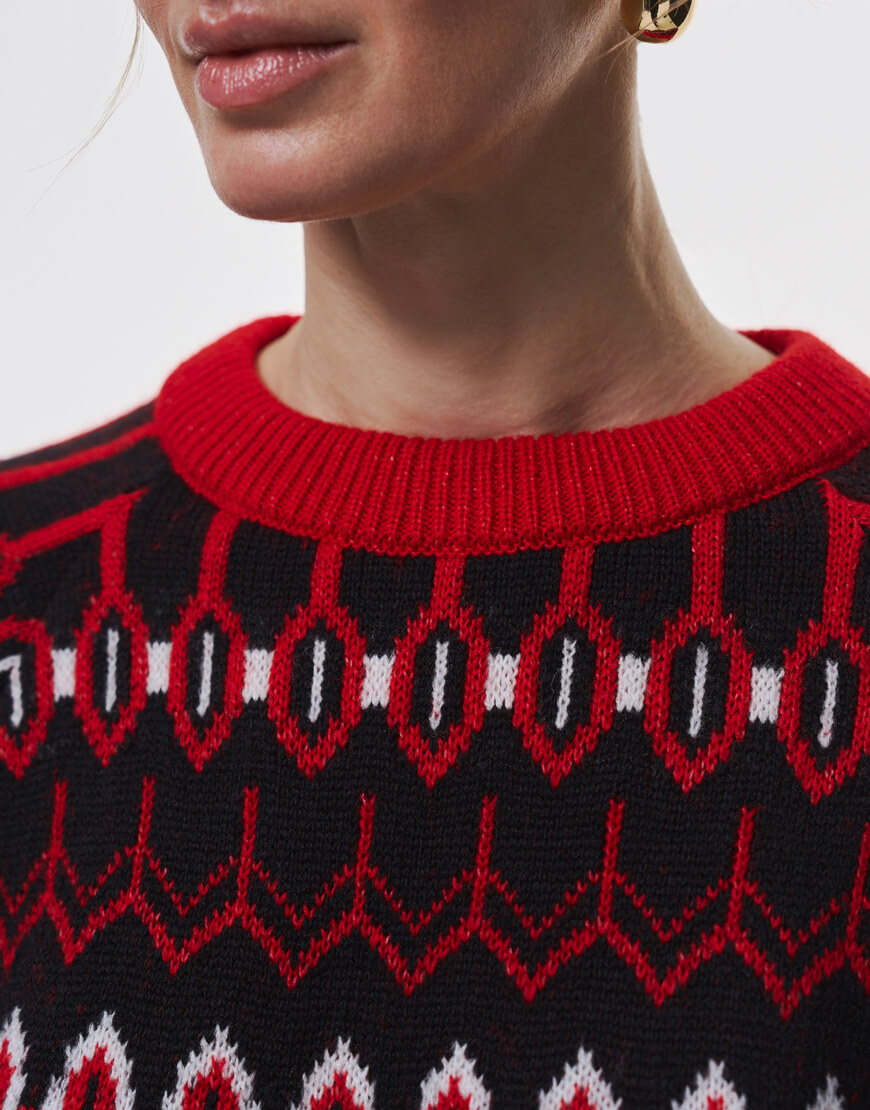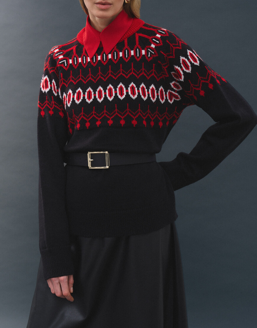 Затишний та неймовірно теплий светр, оздоблений візерунками. Светр об’ємного та вільного крою, з круглою горловиною та спущеною лінією плеча.