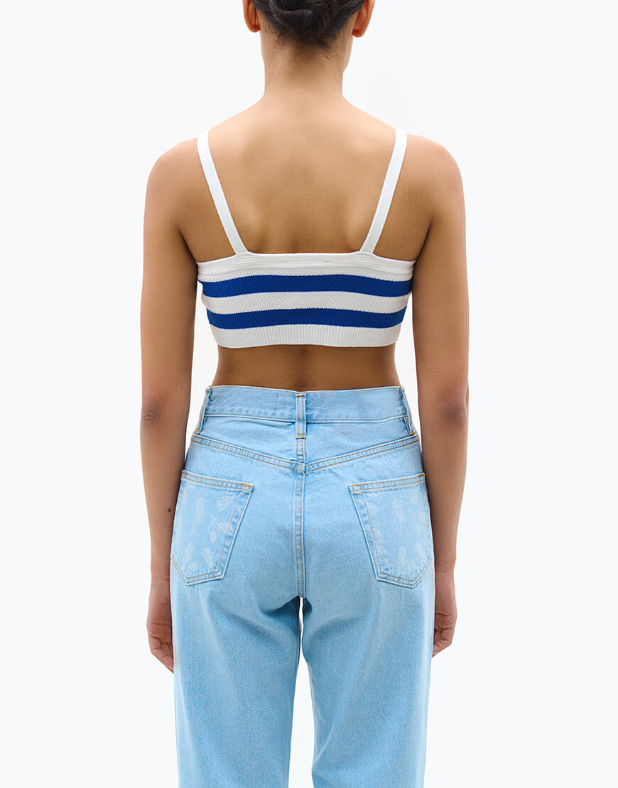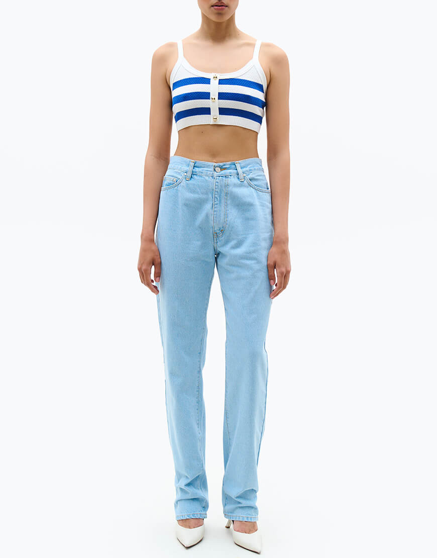 Топ на бретелях, має виражену щільну фактурну в’язку. По центру розміщена нефункціональна планка з металевими ґудзиками. Наявність у складі пряжі віскози з еластаном, надає топу пружності та еластичності. Вдалим доповненням до даної моделі топу стане жакет COLETTE