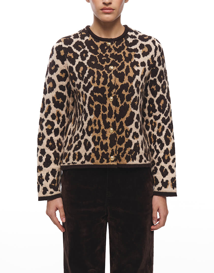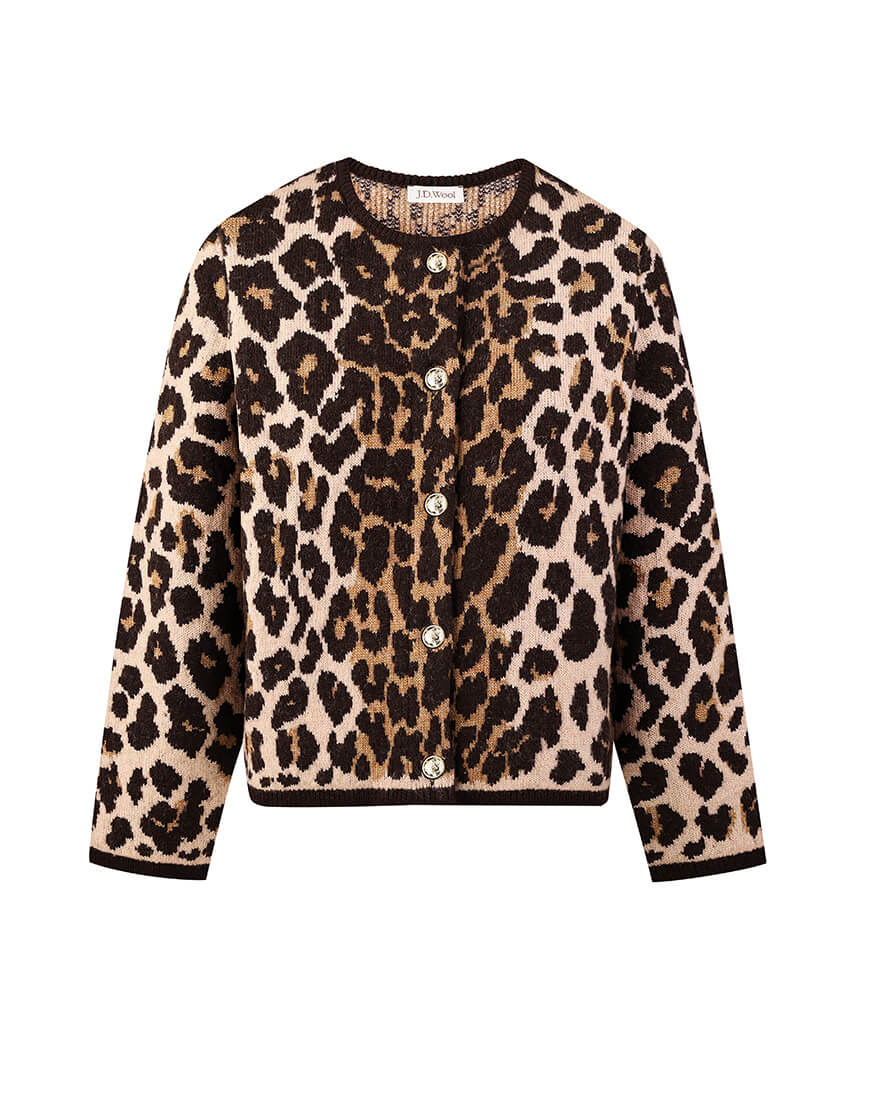Вкорочений кардиган, об’ємного крою з охайним втачним рукавом, стилізований металевими золотими ґудзиками. Кардиган виконаний з щільного трикотажу, принт “леопард”. Неймовірно затишний та теплий кардиган виконаний з м’якої та приємної до тіла вовни.