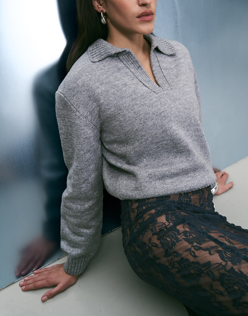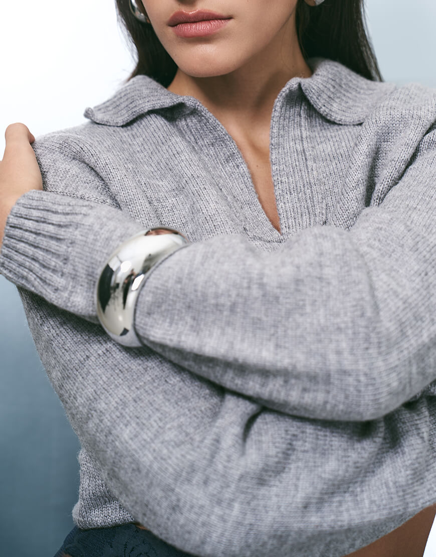 Класична модель джемпера – поло з широким відкладним коміром та неглибоким V-вирізом. Затишний джемпер виконаний з м’якої та приємної до тіла пряжі.