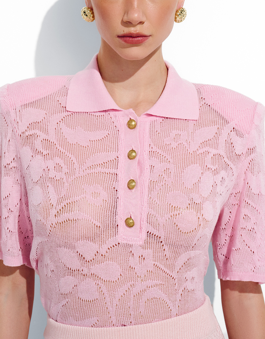 Доставка впродовж 2-5 робочих днівДля того, щоб навесні та влітку ви змогли створювати класичні образи, до нашої колекції ми додали витончене та елегантне поло вільного, прямого крою, з подовженим рукавом та акцентними плечима. Акцентні плечі досягнуто за рахунок підплічників. Поло застібається на золоті металеві ґудзики. Родзинкою даної моделі поло є ажурний візерунок в квіти.