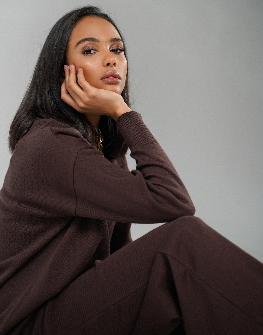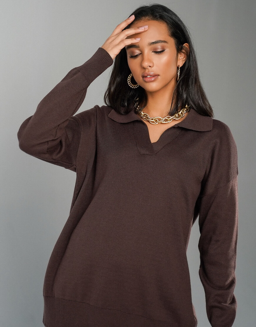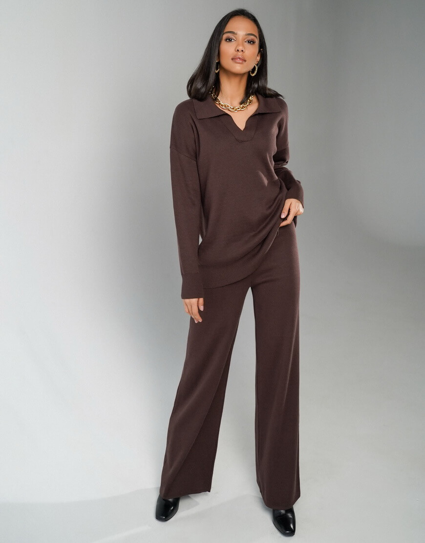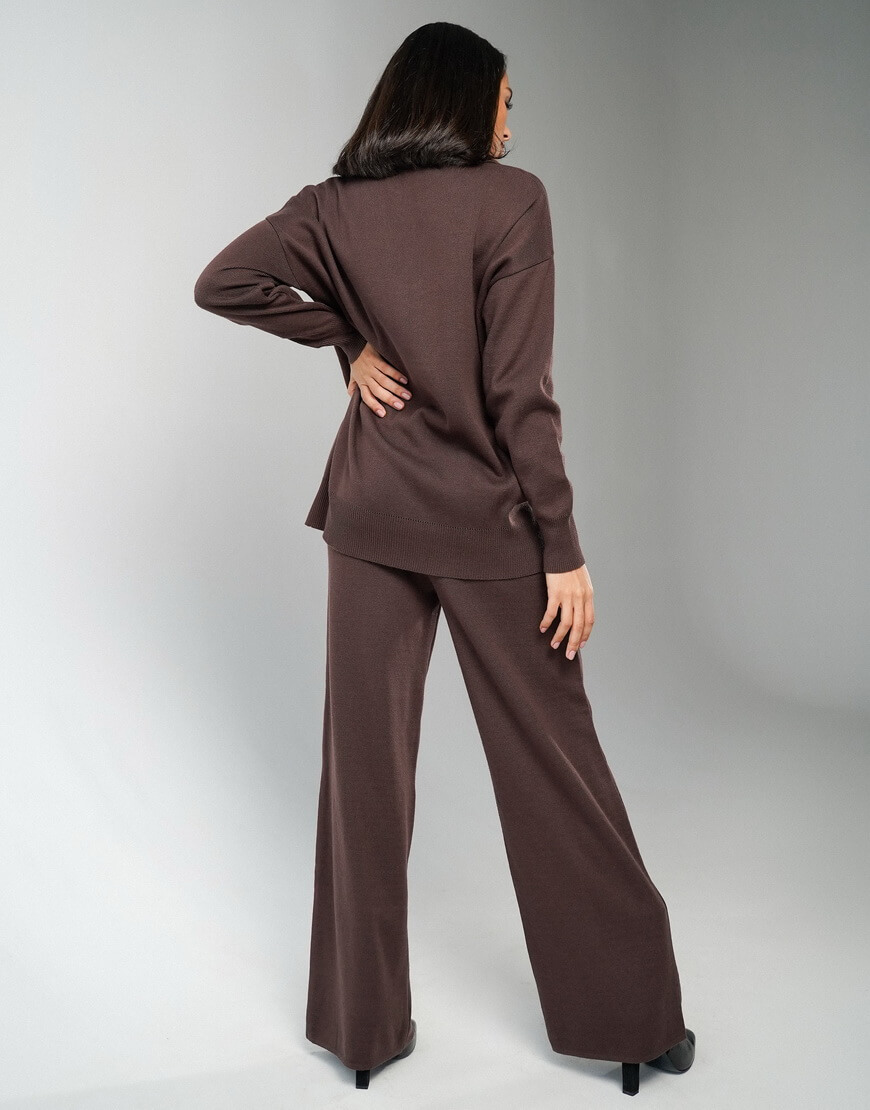 Трикотажний костюм: вільні прямі штани на високій посадці та подовжений светр-поло.