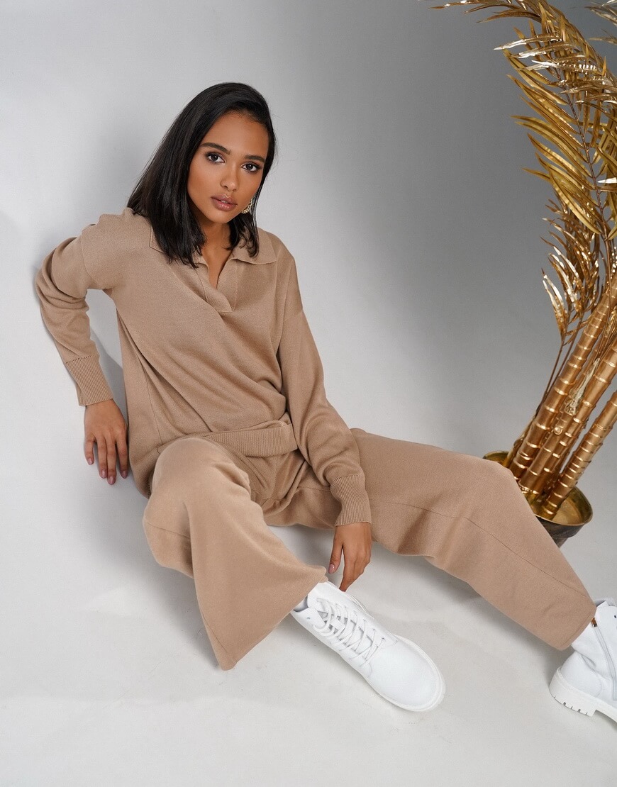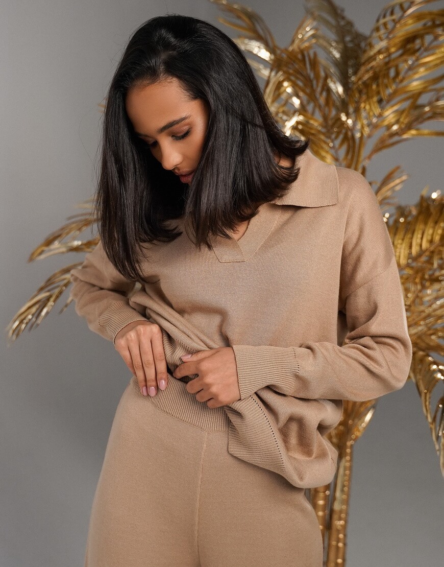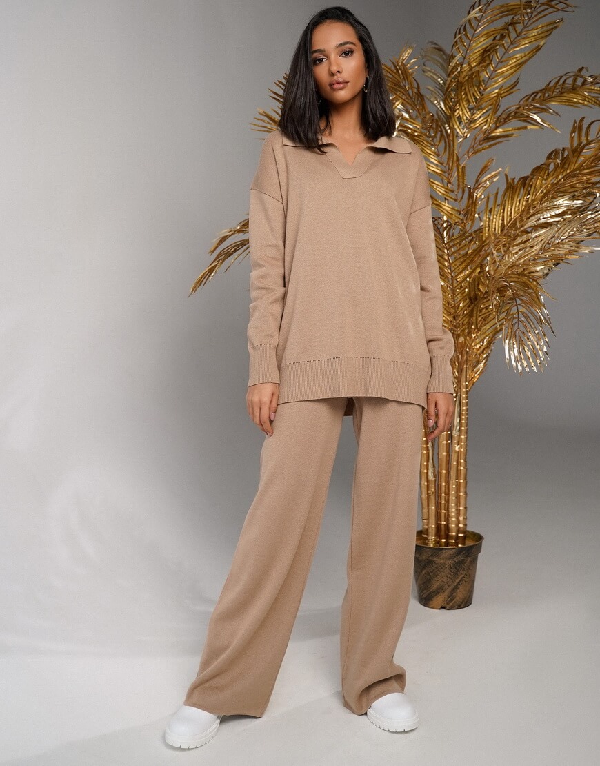 Трикотажний костюм: вільні прямі штани на високій посадці та подовжений светр-поло.