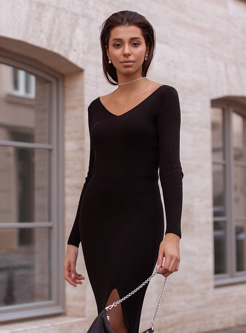 Трикотажна сукня з V-подібною горловиною і розрізом на нозі. Виконана з віскозної нитки, м’якої та еластичної, приємної до тіла.