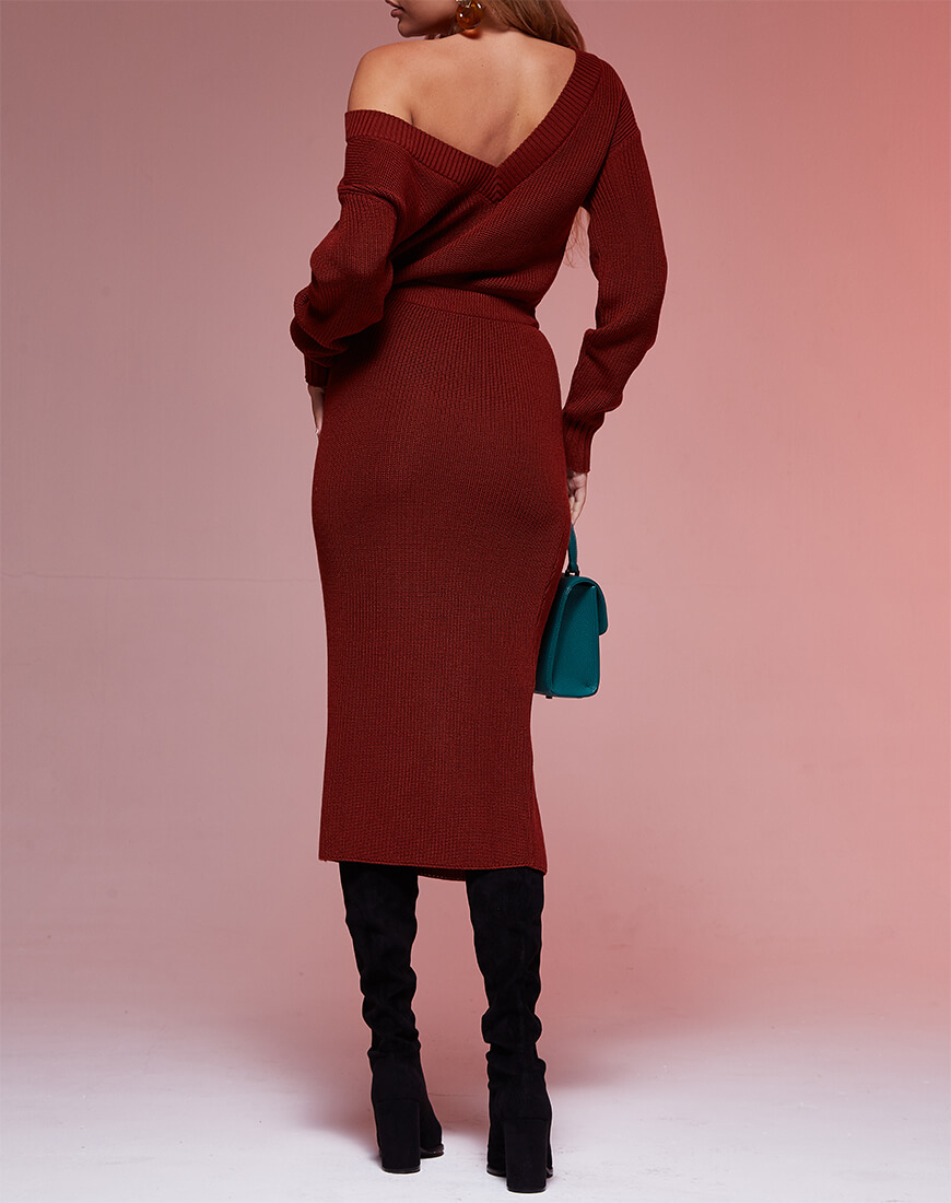 Трикотажна сукня з V-подібним вирізом. Сукню можна носити вирізом наперед або назад. У пояс сукні вставлена гумка, яка створює ефект костюма.