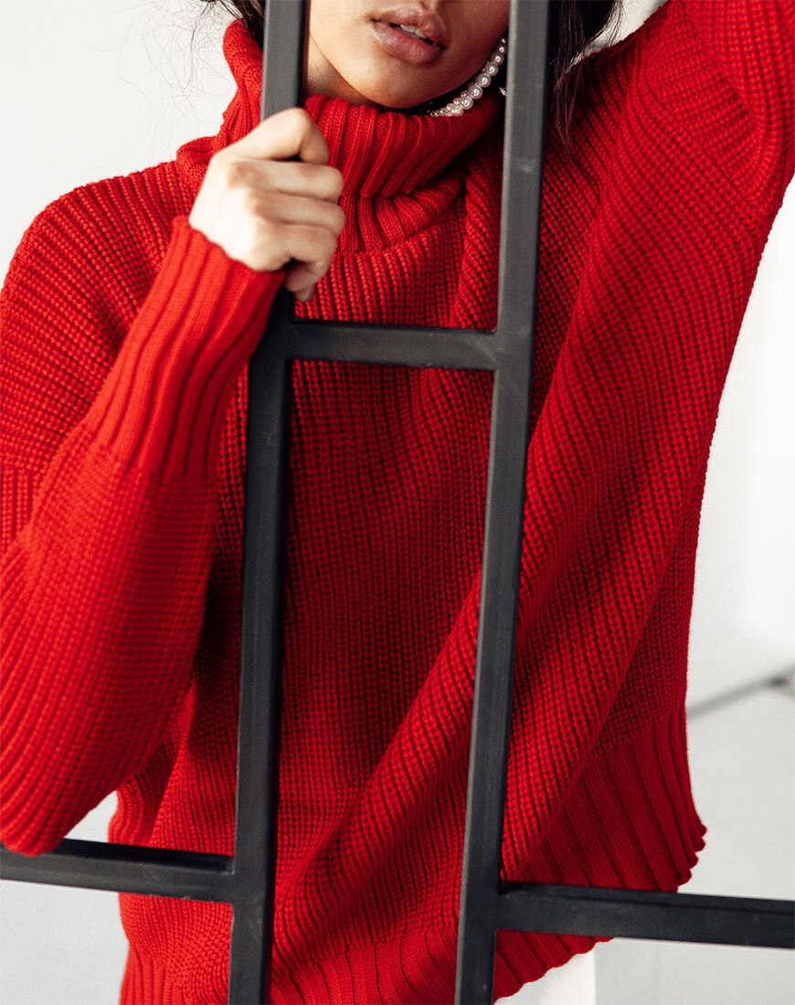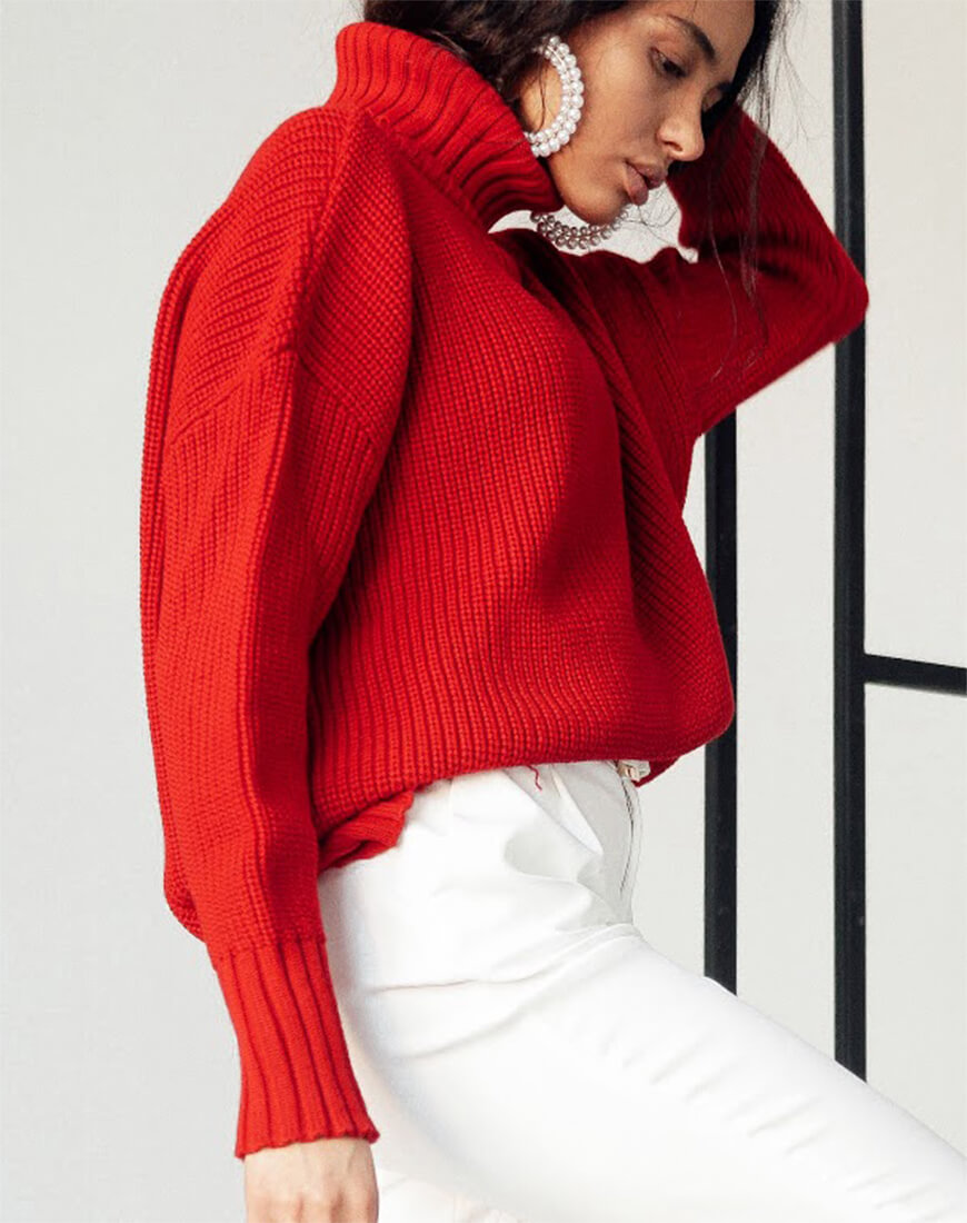 Вільний светр грубої в’язки з об’ємною горловиною і спущеною лінією плеча.