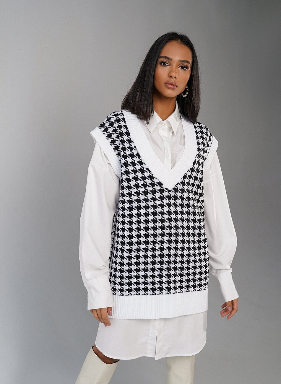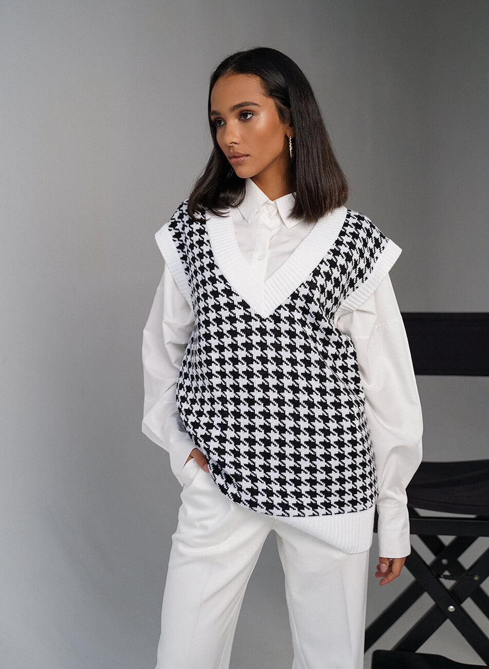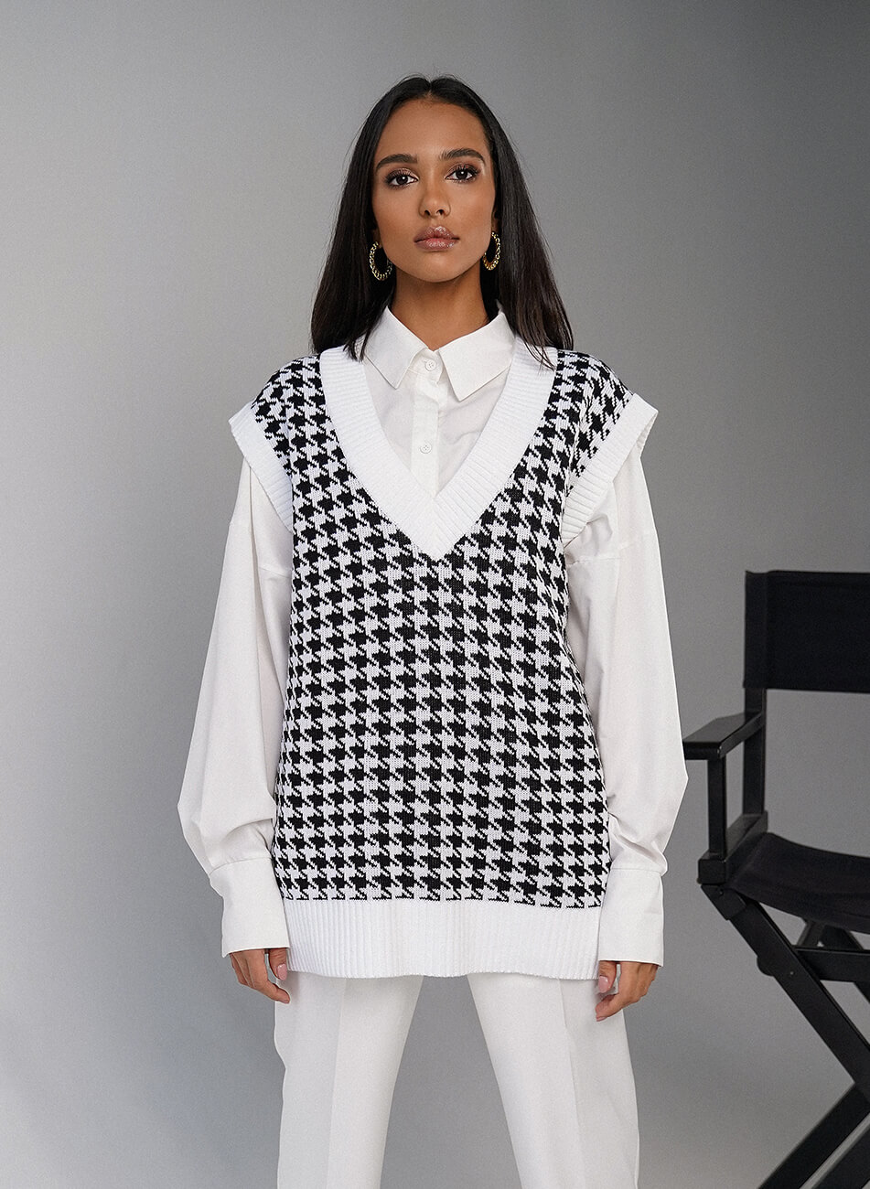 Подовжений трикотажний жилет прямого крою з V-подібною горловиною, принт “гусяча лапка” Трикотажний жилет можна носити і як основний верхній шар, поєднуючи зі штанами, джинсами або зі спідницею. Також об’ємний жилет можна поєднувати зі строгою сорочкою.