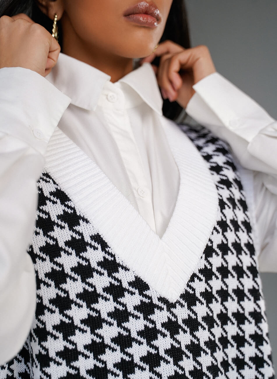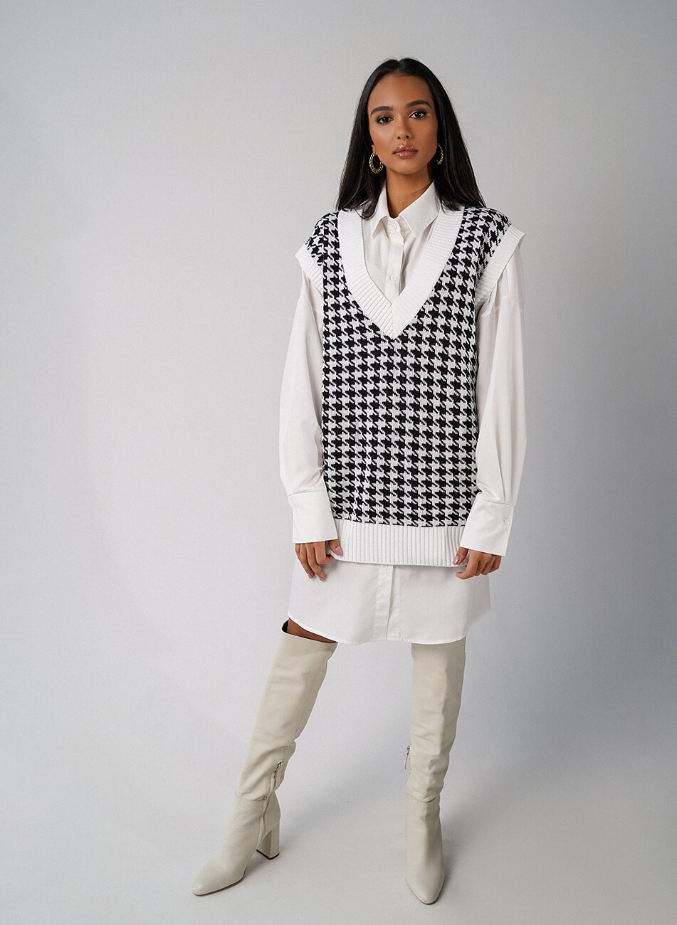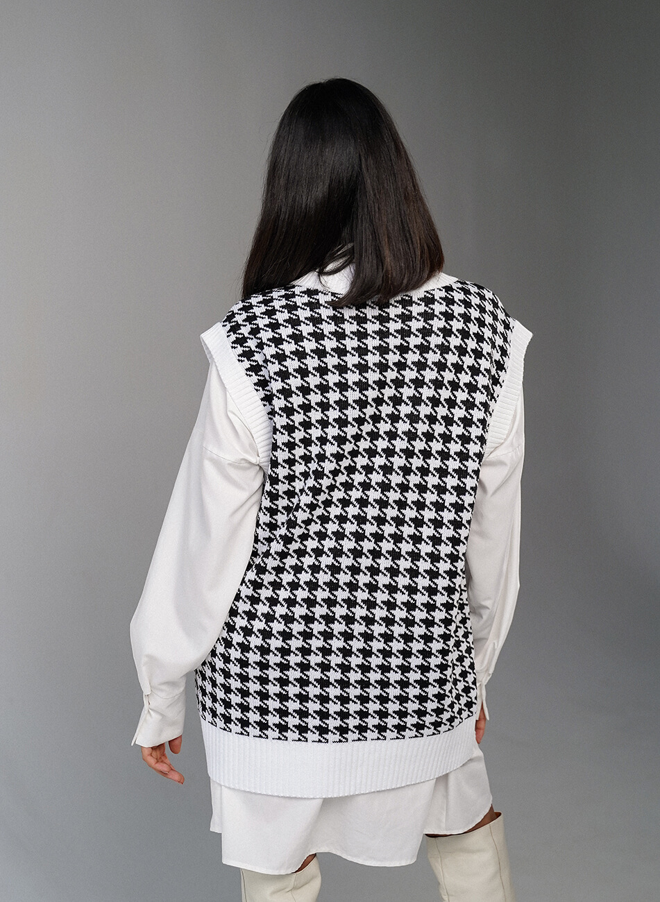 Подовжений трикотажний жилет прямого крою з V-подібною горловиною, принт “гусяча лапка” Трикотажний жилет можна носити і як основний верхній шар, поєднуючи зі штанами, джинсами або зі спідницею. Також об’ємний жилет можна поєднувати зі строгою сорочкою.