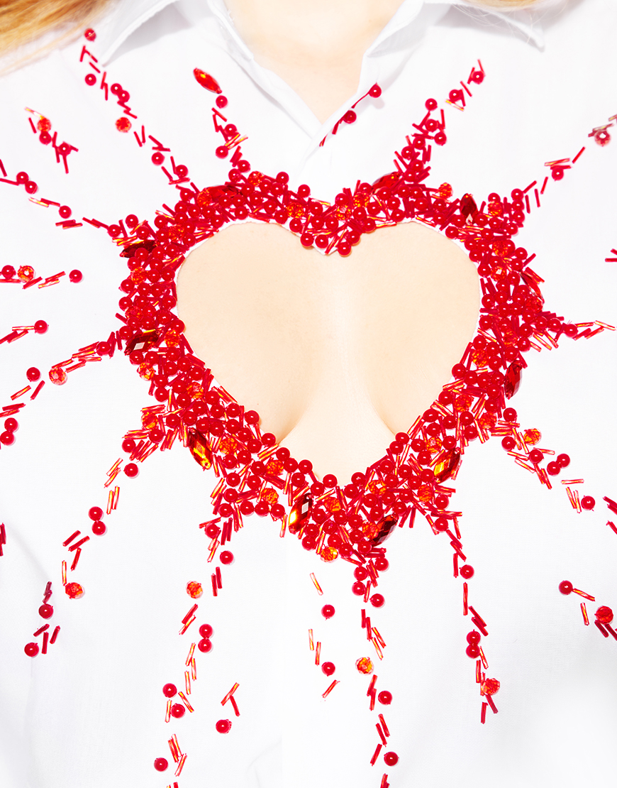 Класична сорочка звеликим вирізом декорована кришталевими намитинами.