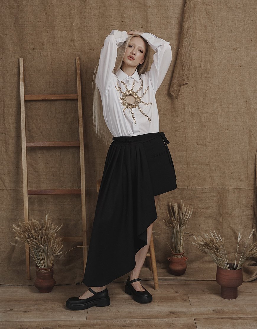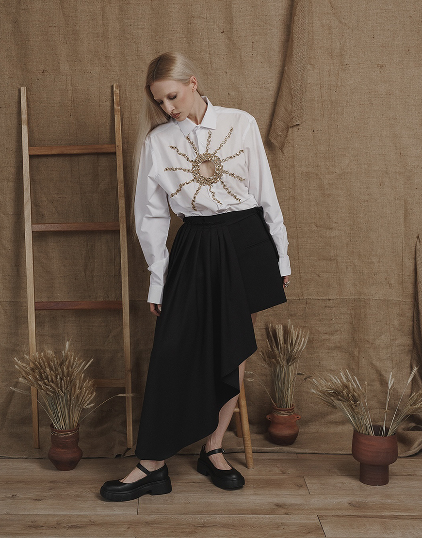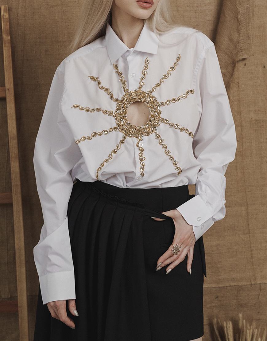 Класична сорочка звеликим вирізом декорована кришталевими намитинами.