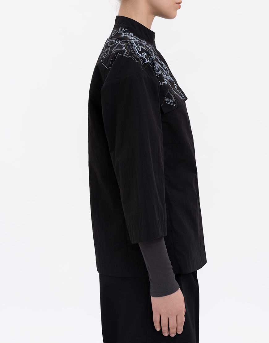 Сорочка має напівприталений силует, приховану застібку на ґудзики та виразну особливість – укорочений вільний рукав. Виготовлена з комбінації нейлону (73%) та бавовни (27%), ця річ зносостійка та тривка.