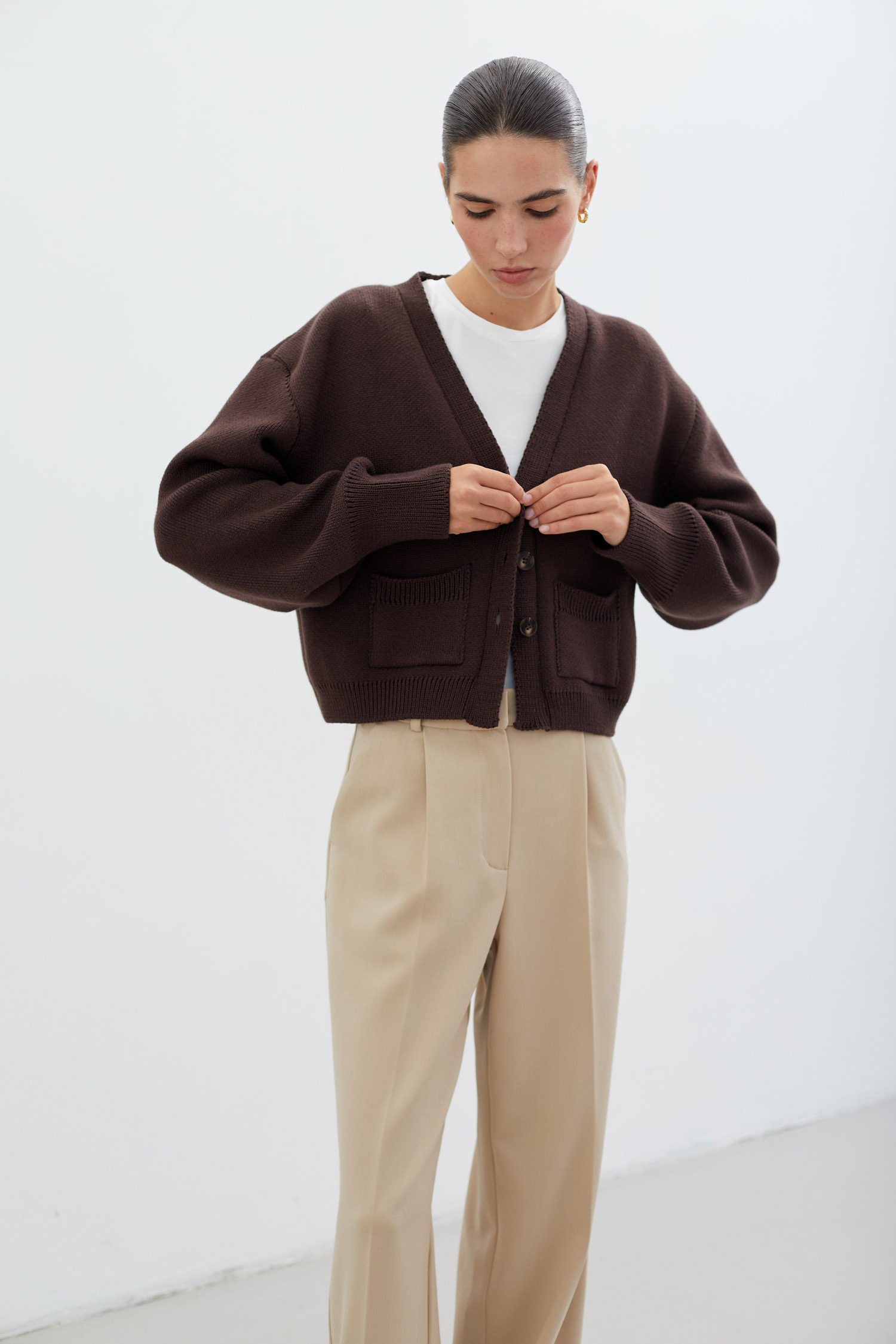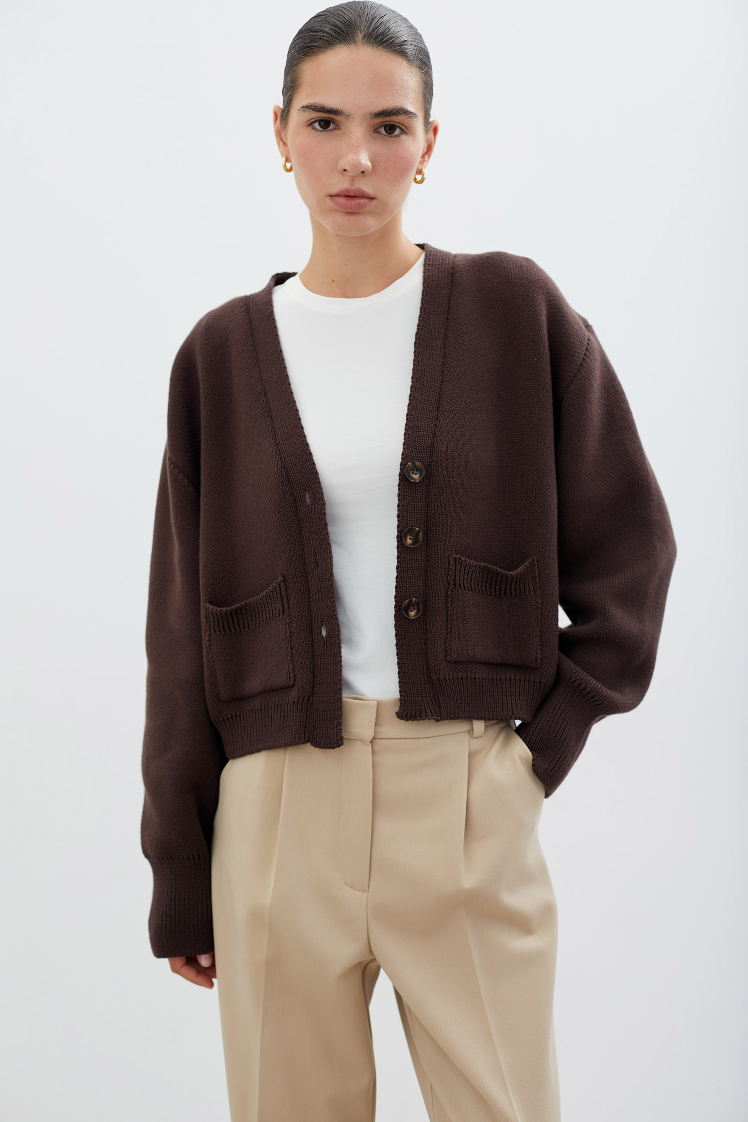 ДоставкаШоколадний кардиган, виготовлений із бавовняної пряжі в трикотажній техніці.