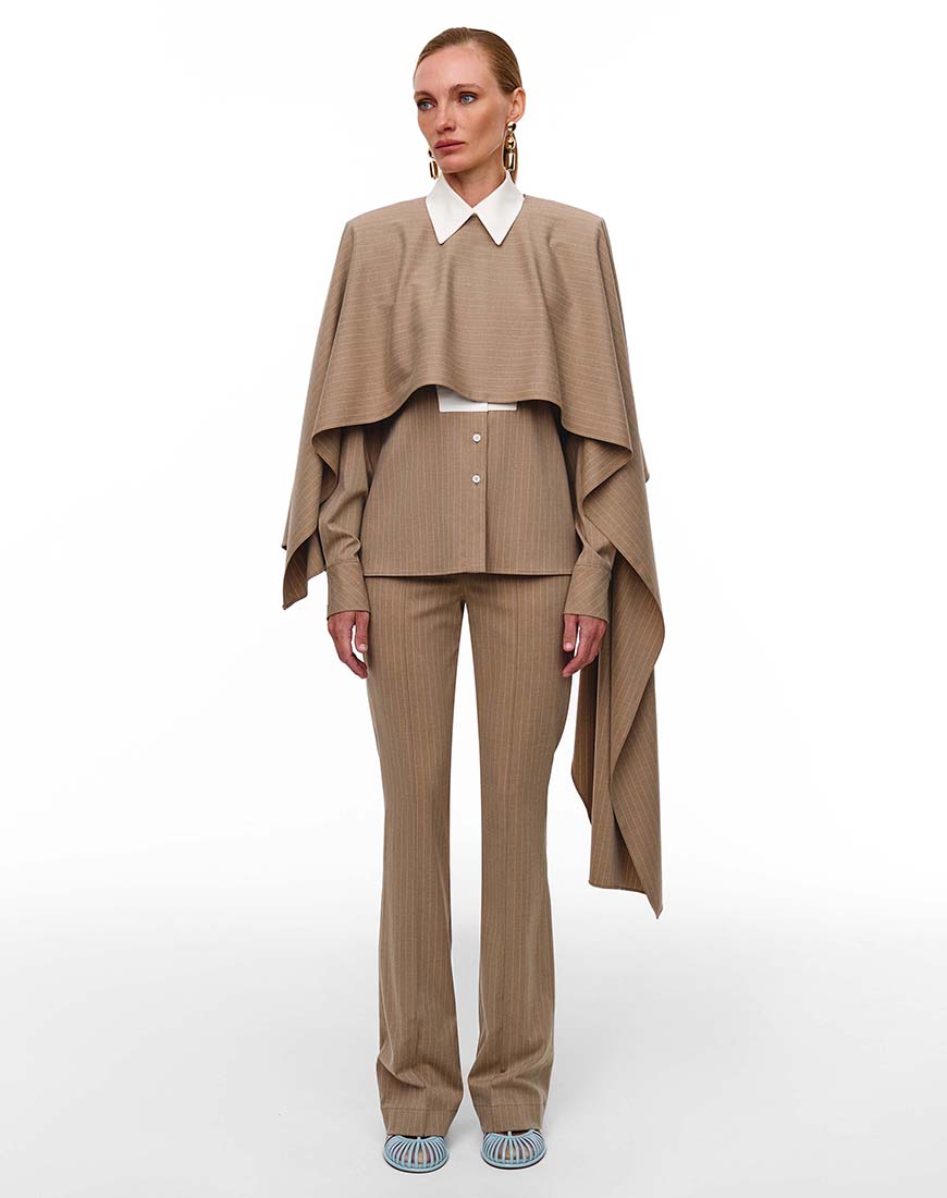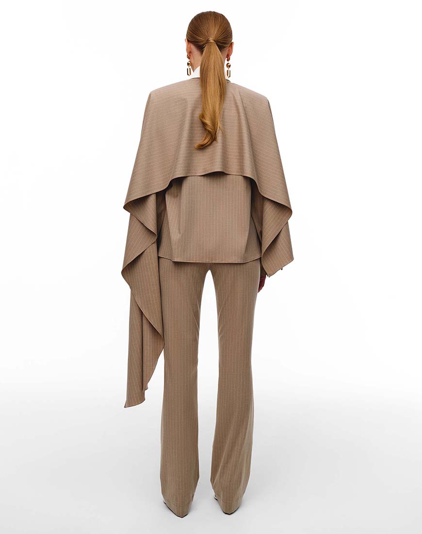 Доставка впродовж 2-10 робочих днівАсиметричний кейп із приємної костюмної тканини. Виріб створений, щоб додати образу об’єм і характер. Асиметричний крій, де одна сторона елегантно подовжена, створює динаміку та відчуття руху. Тонка вертикальна смужка підкреслює витонченість силуету. Кейп ідеально комбінується із штанами Marie або сорочкою Malena, дозволяючи створювати як офісні, так і вечірні образи.