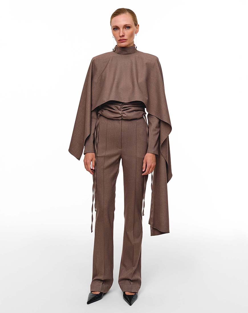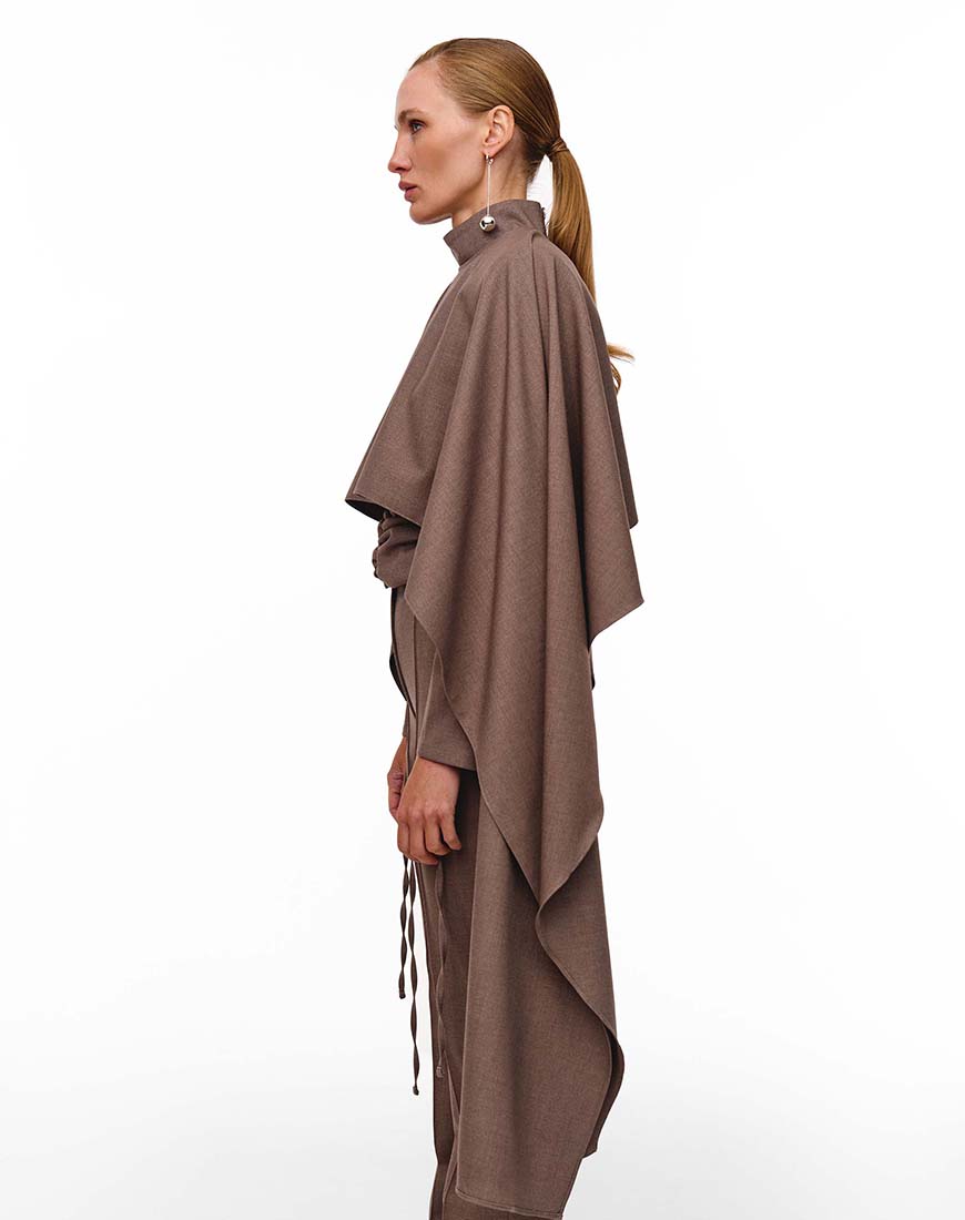 Доставка впродовж 2-10 робочих днівАсиметричний кейп із приємної костюмної тканини. Виріб створений, щоб додати образу об’єм і характер. Асиметричний крій, де одна сторона елегантно подовжена, створює динаміку та відчуття руху. Тонка вертикальна смужка підкреслює витонченість силуету. Кейп ідеально комбінується із штанами Marie або сорочкою Malena, дозволяючи створювати як офісні, так і вечірні образи.