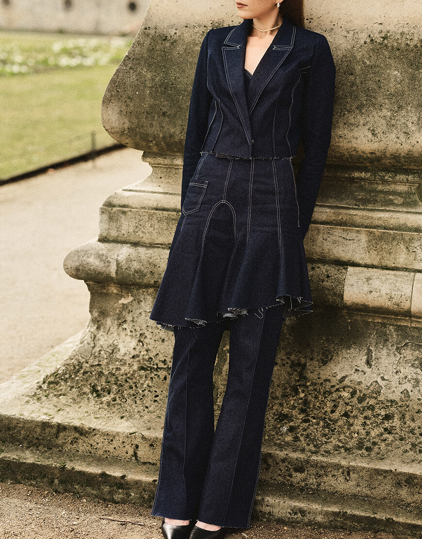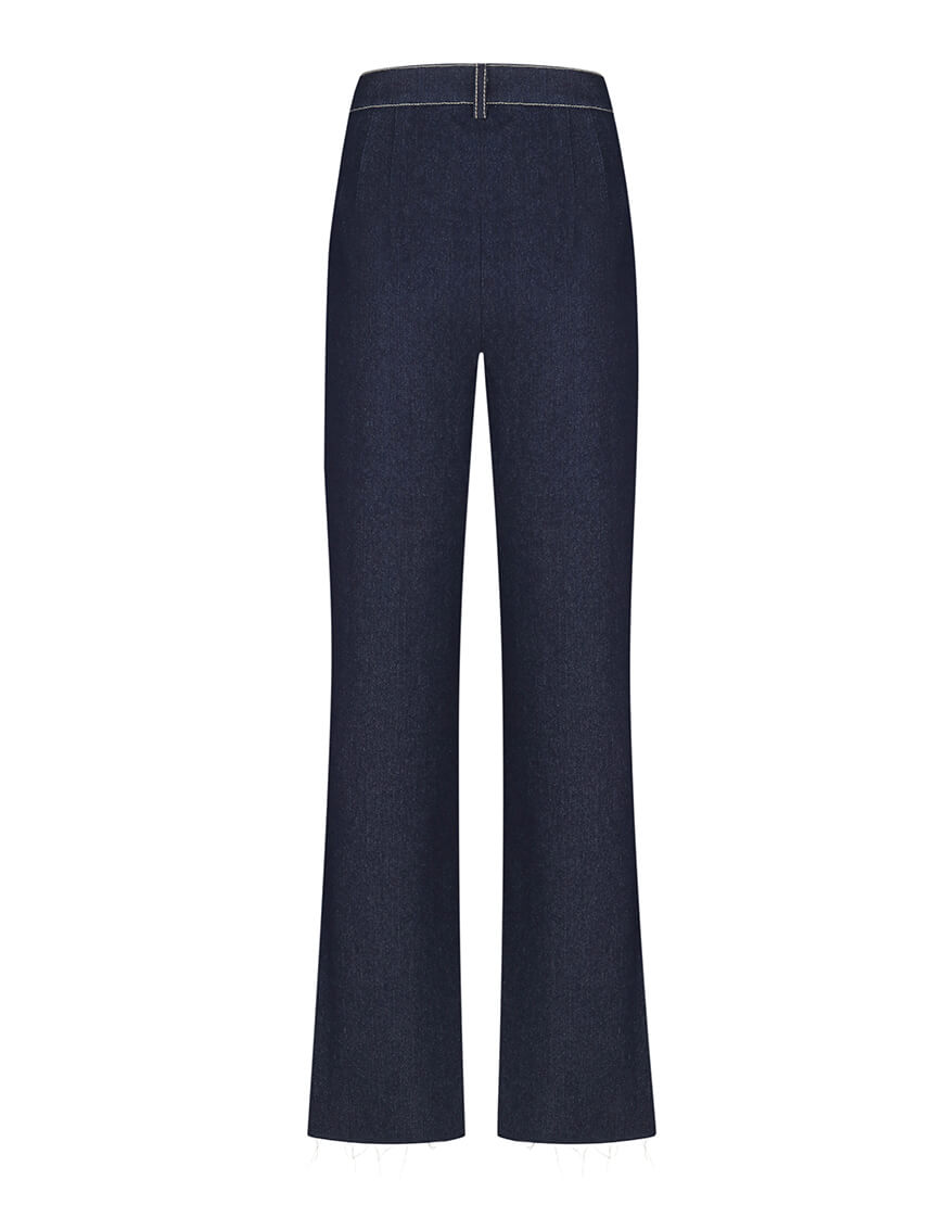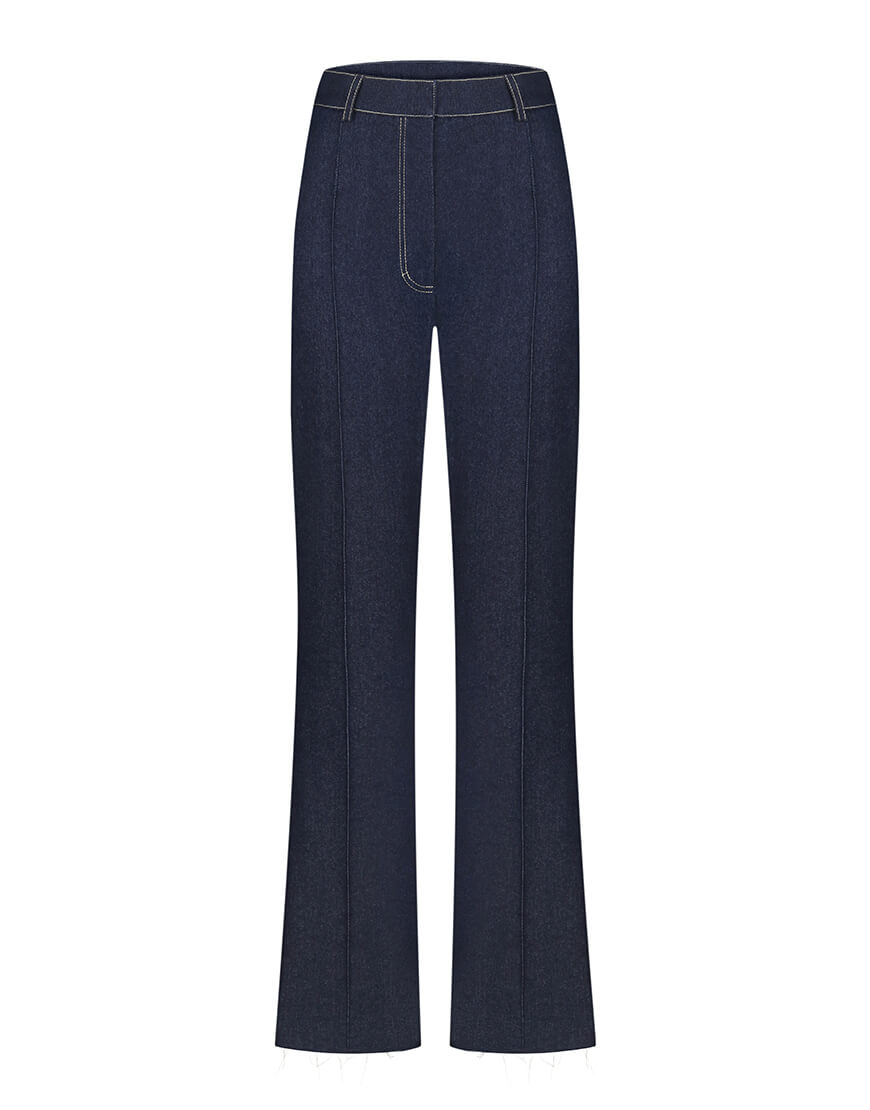 Доставка впродовж 2-5 робочих днівБрюки джинсові напівприлеглого силуету із акцентованими строчками, розклишені від коліна, з боку шліца, низ не оброблений.