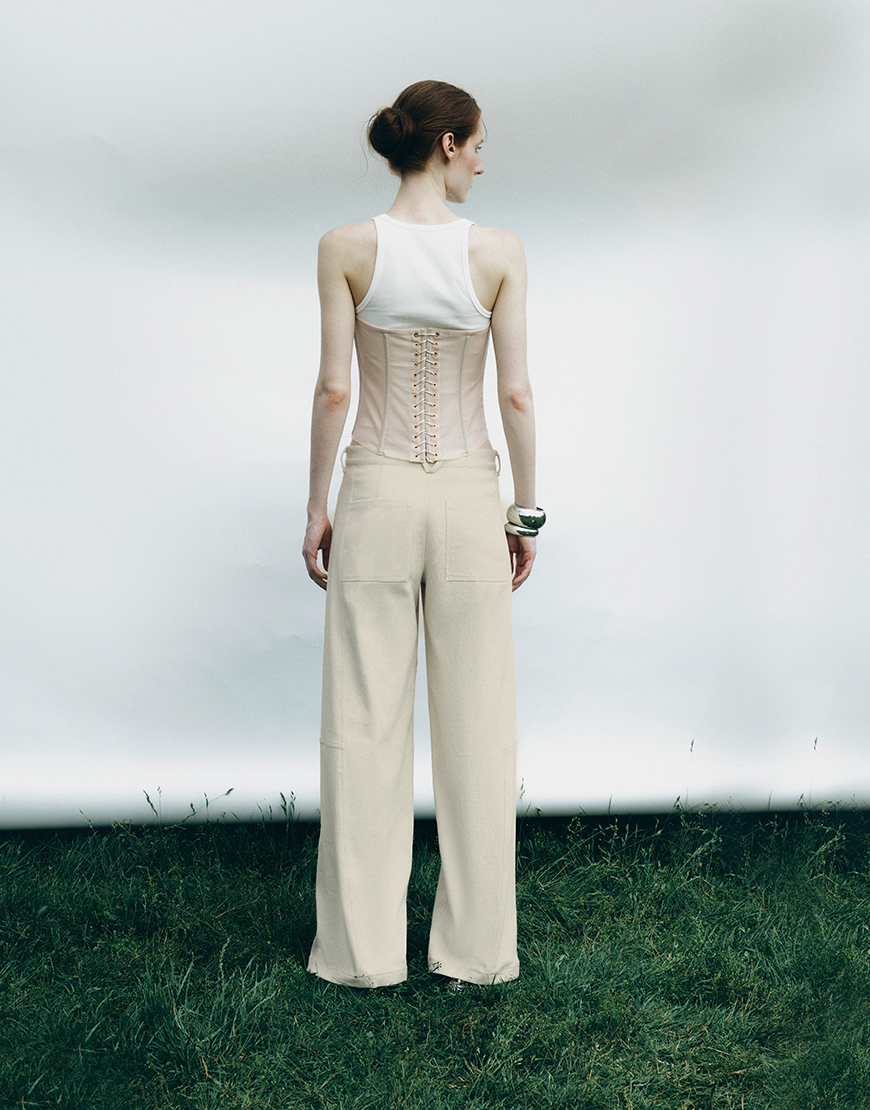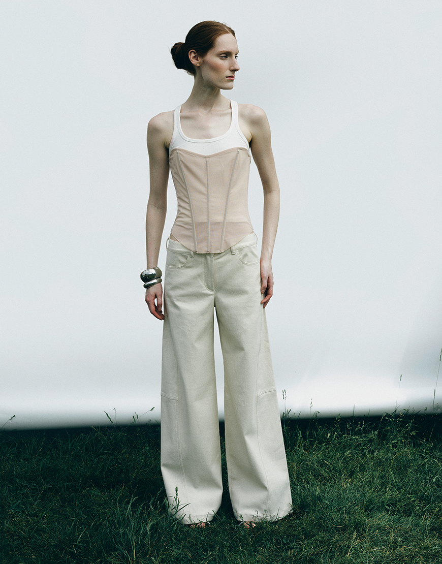 Знімний топ на кнопках дозволяє змінювати образ: від відкритої архітектурної форми — до більш стриманої, закритої.