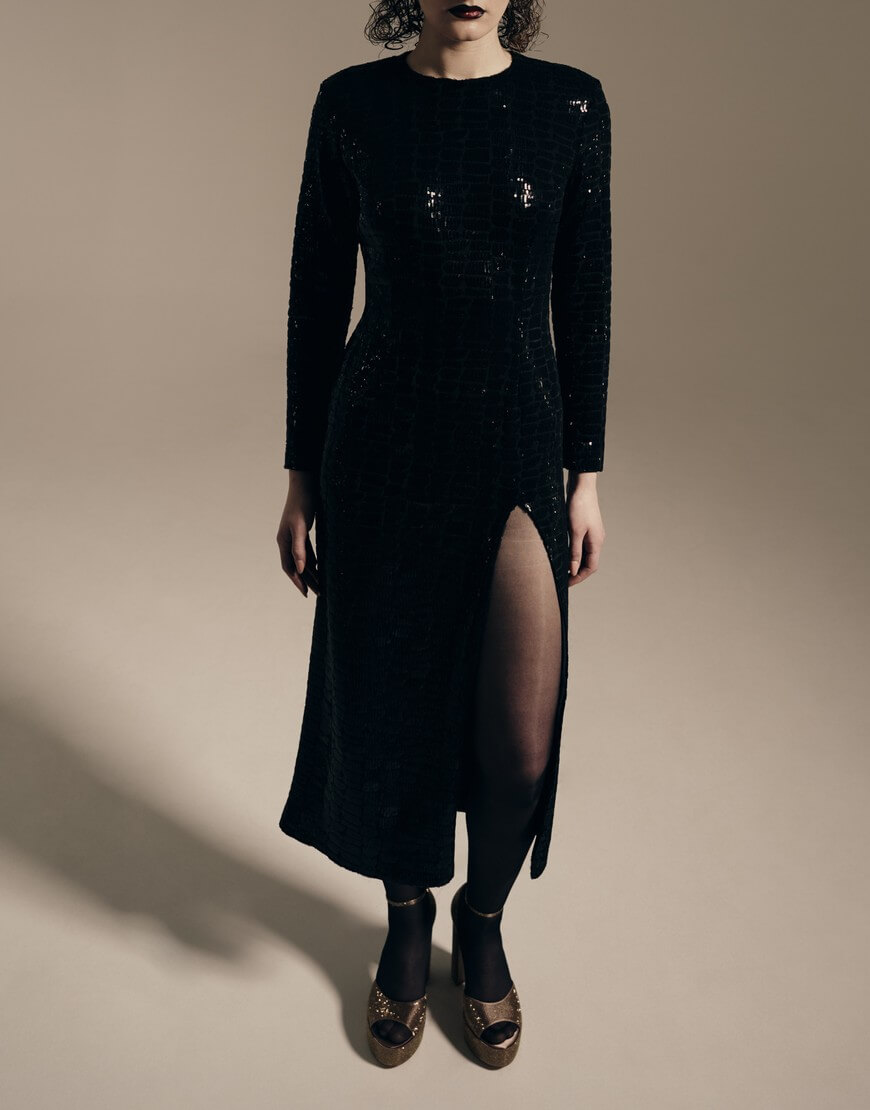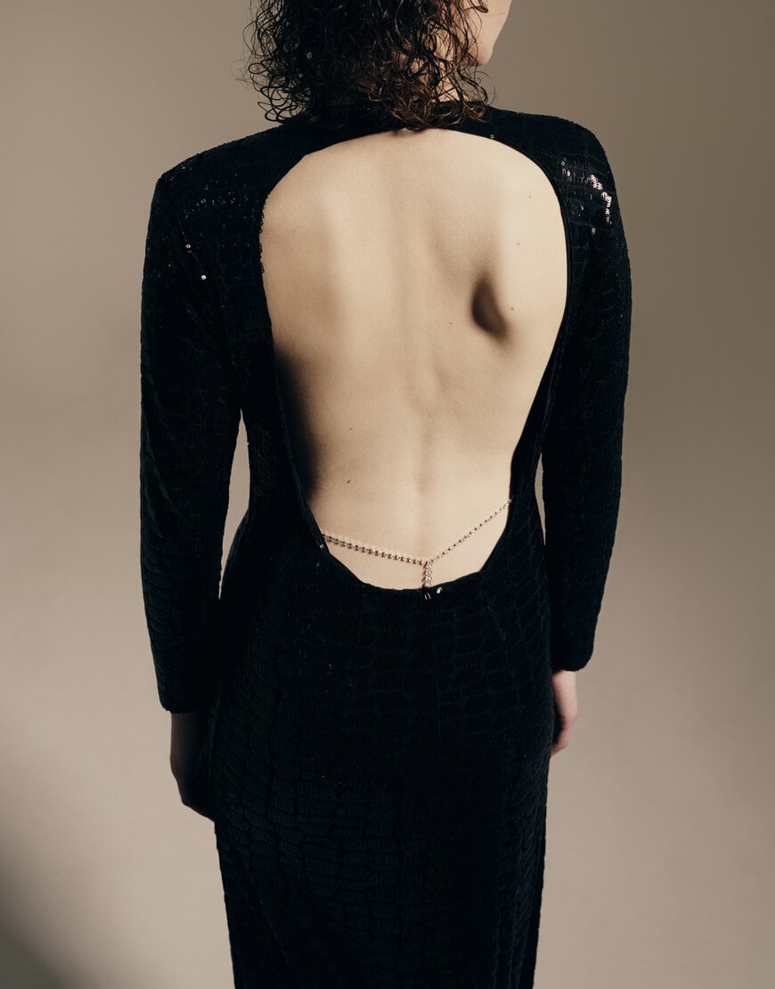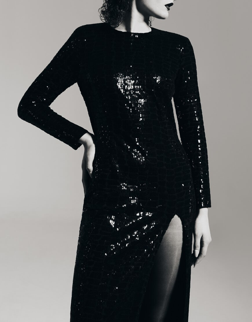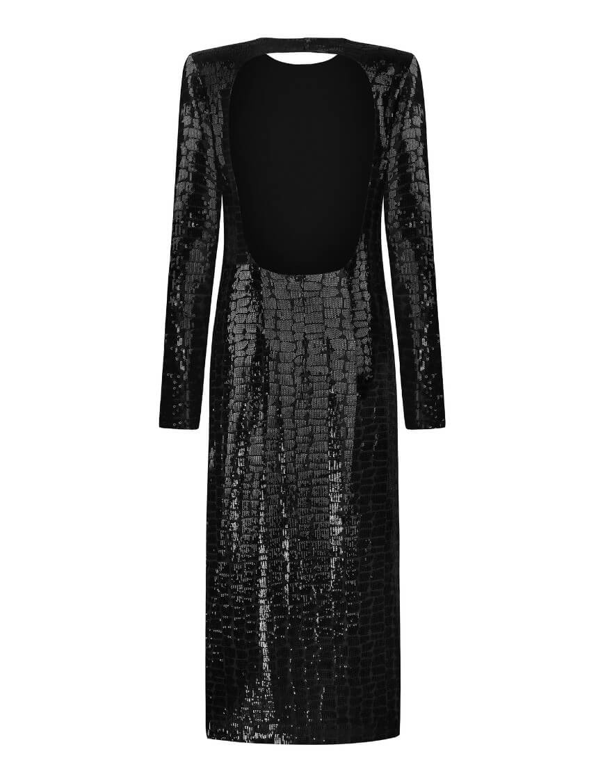 Сукня довжини міді на підкладці, глибокий виріз на спинці. Застібається на потайну блискавку. Виготовлена з тканини, обшитої паєтками.