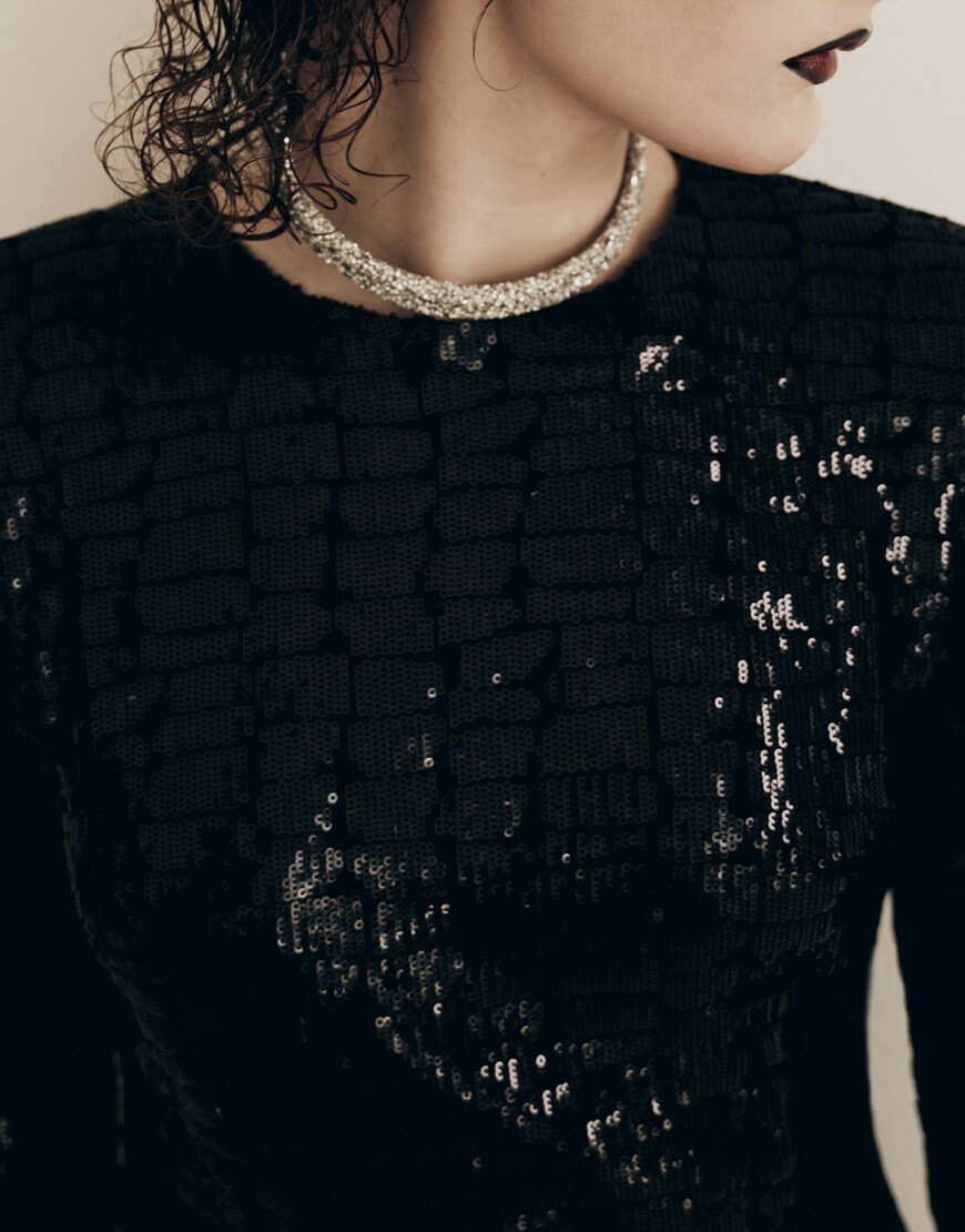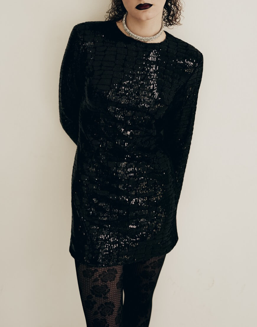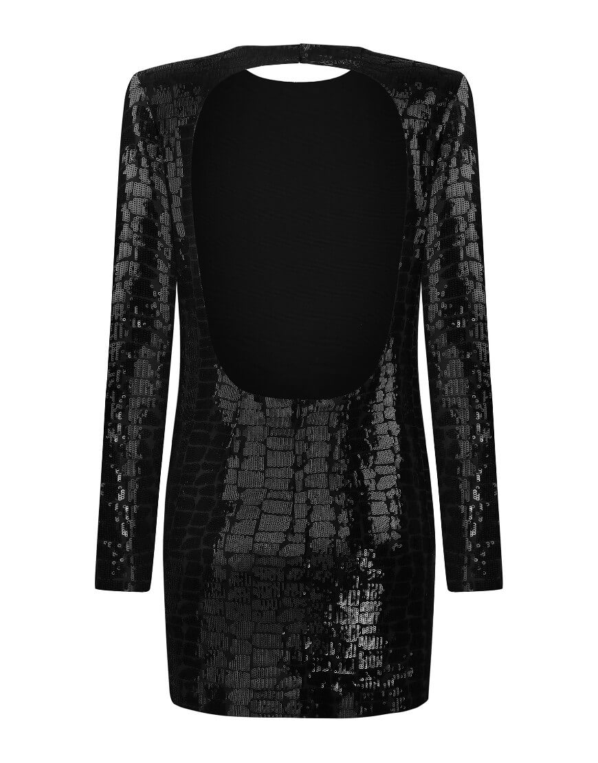 Сукня міні, глибокий виріз на спинці, застібається на потайну блискавку. Виготовлена з тканини з паєтками.