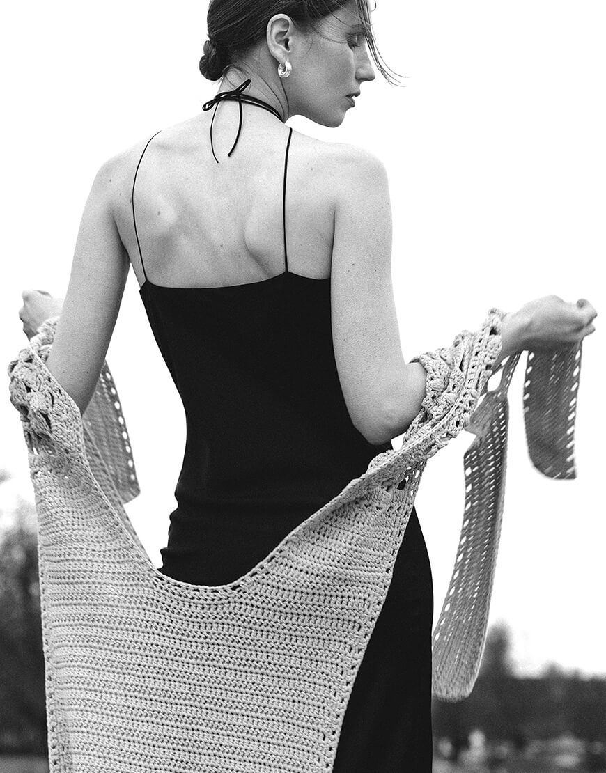 Ручна вʼязка, виконана технікою крючком в три нитки для передання форм узорів. Пряжа бамбукова.