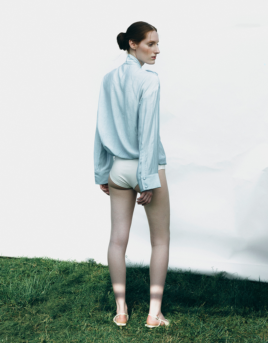 Спущена лінія плечей і подовжені рукави на манжетах створюють силует легкості й свободи.