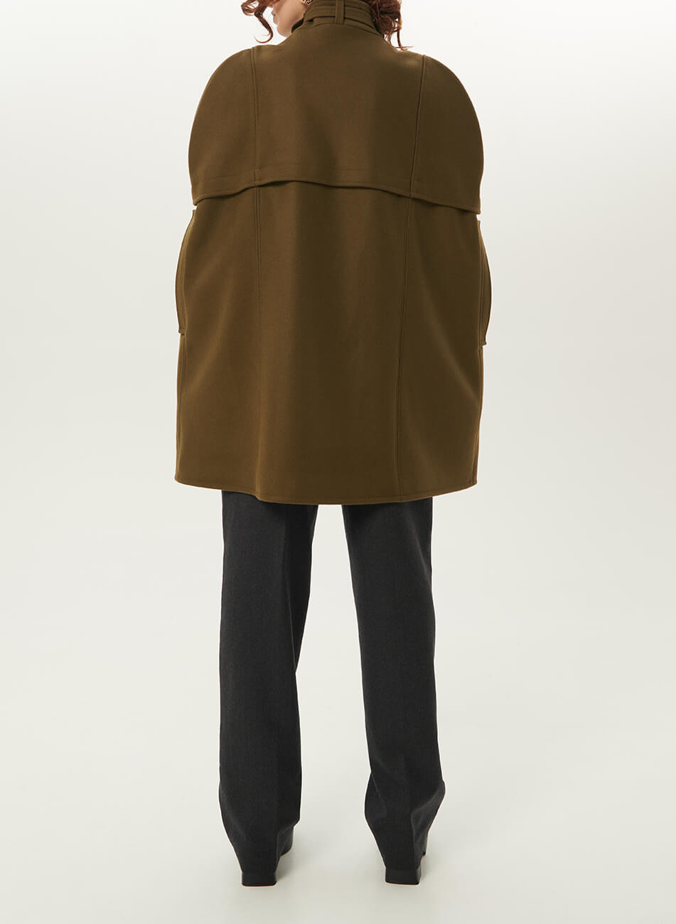 Кейп вільного крою, трапецієподібної форми з поясом на талії. Не обмежує рухи, має додаткові прорізи для рук. Воротник-стійка з регульованим ремінцем. Застібається на внутрішні металеві кнопки.