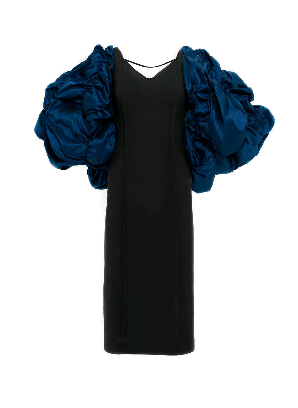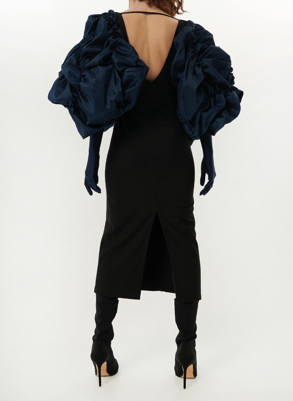 Доставка впродовж 2-5 робочих днівКласична сукня-футляр з глибоким вирізом на спині та рельєфними лініями на передній частині. Рукава буфи. Завершує образ пара витончених рукавичок.