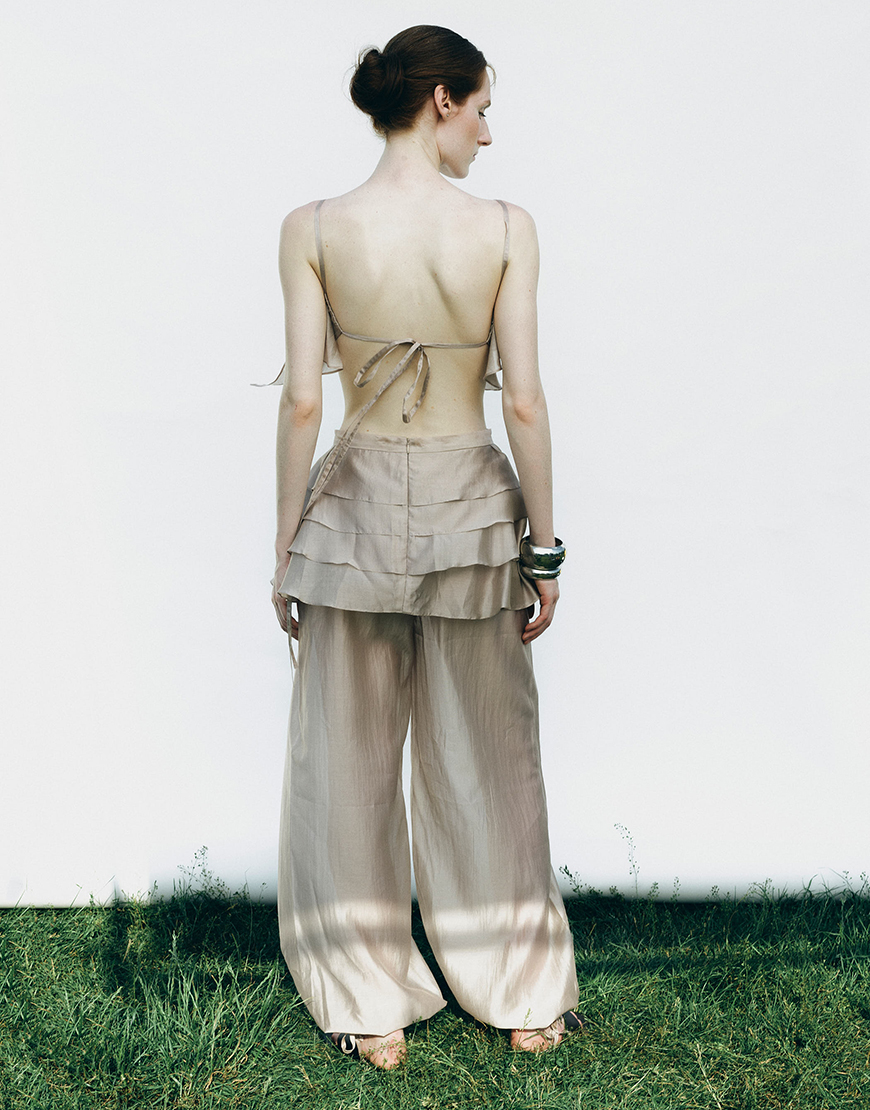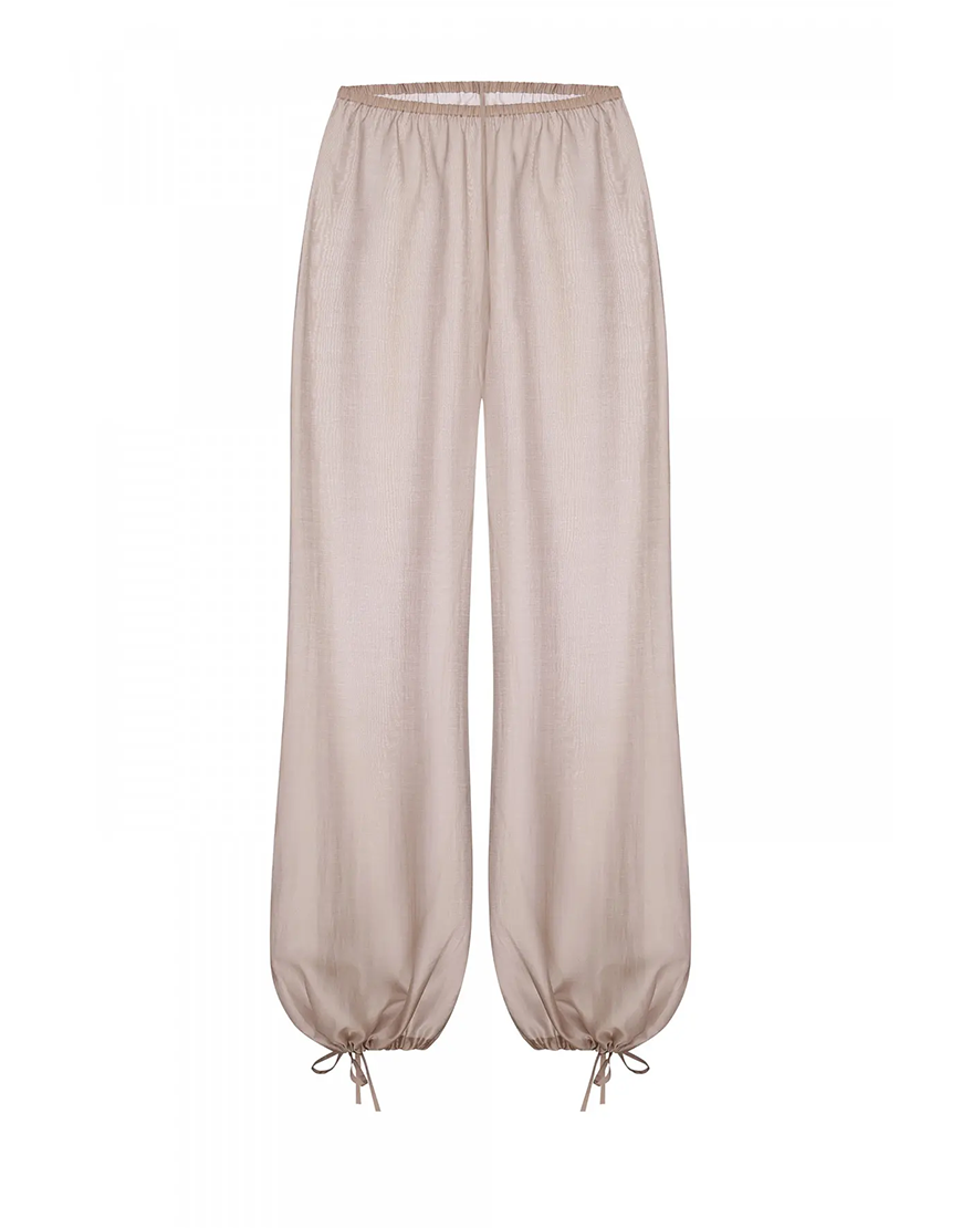 Посадка на еластичній резинці дозволяє носити штани як на стегнах, так і на талії. Низ штанин фіксується на кулісці, формуючи акцентований обʼєм і змінюючи силует залежно від стилізації.