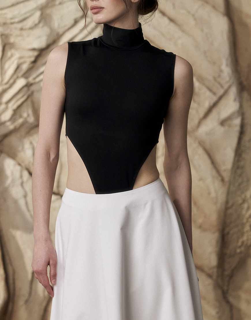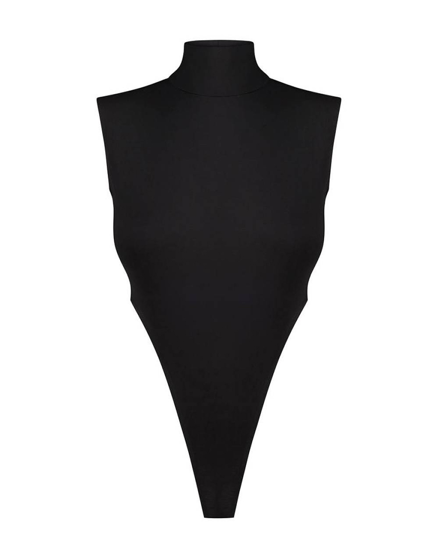 Чорний боді з високими вирізами на талії виконане з мʼякого трикотажу та має застібку на гачках.