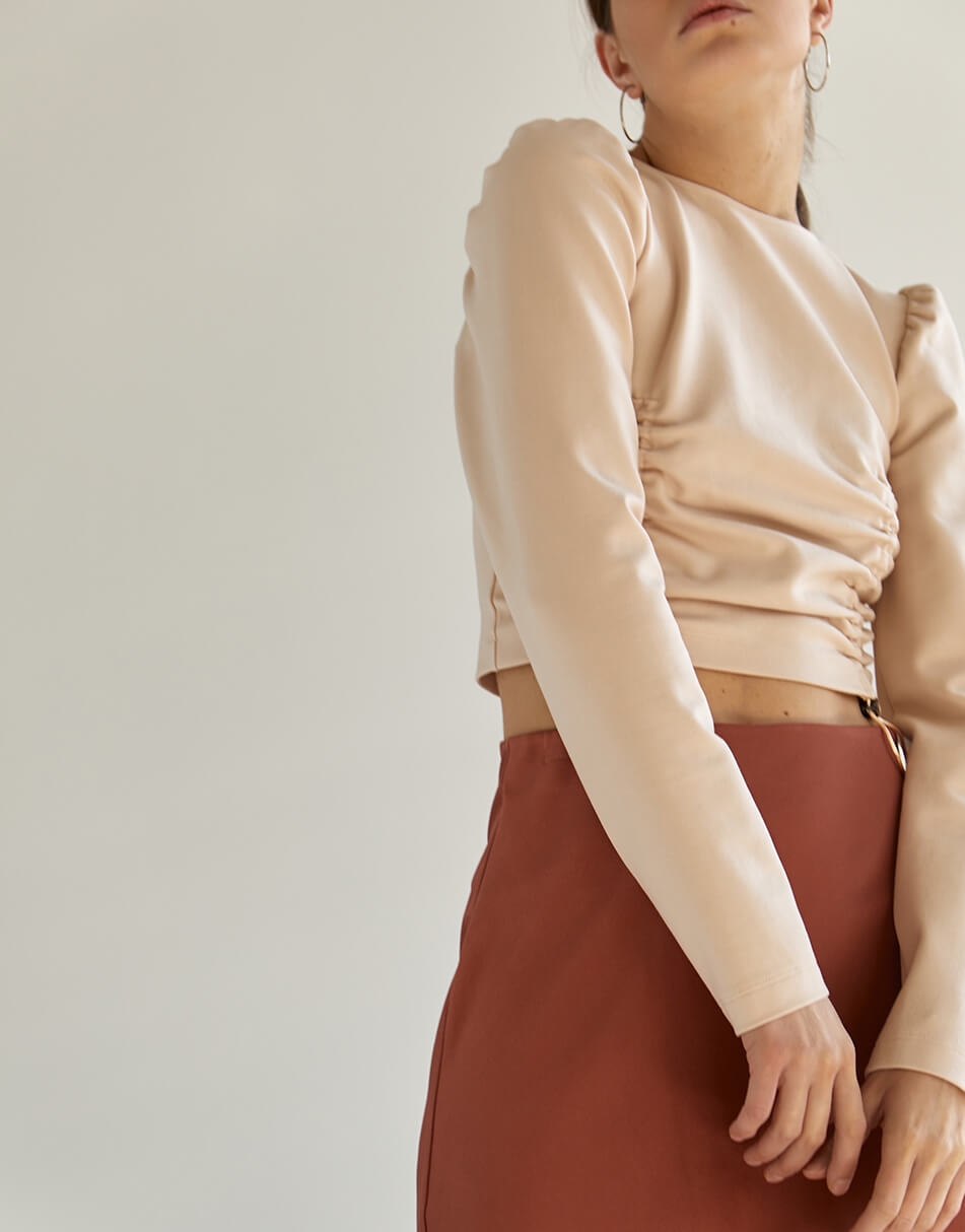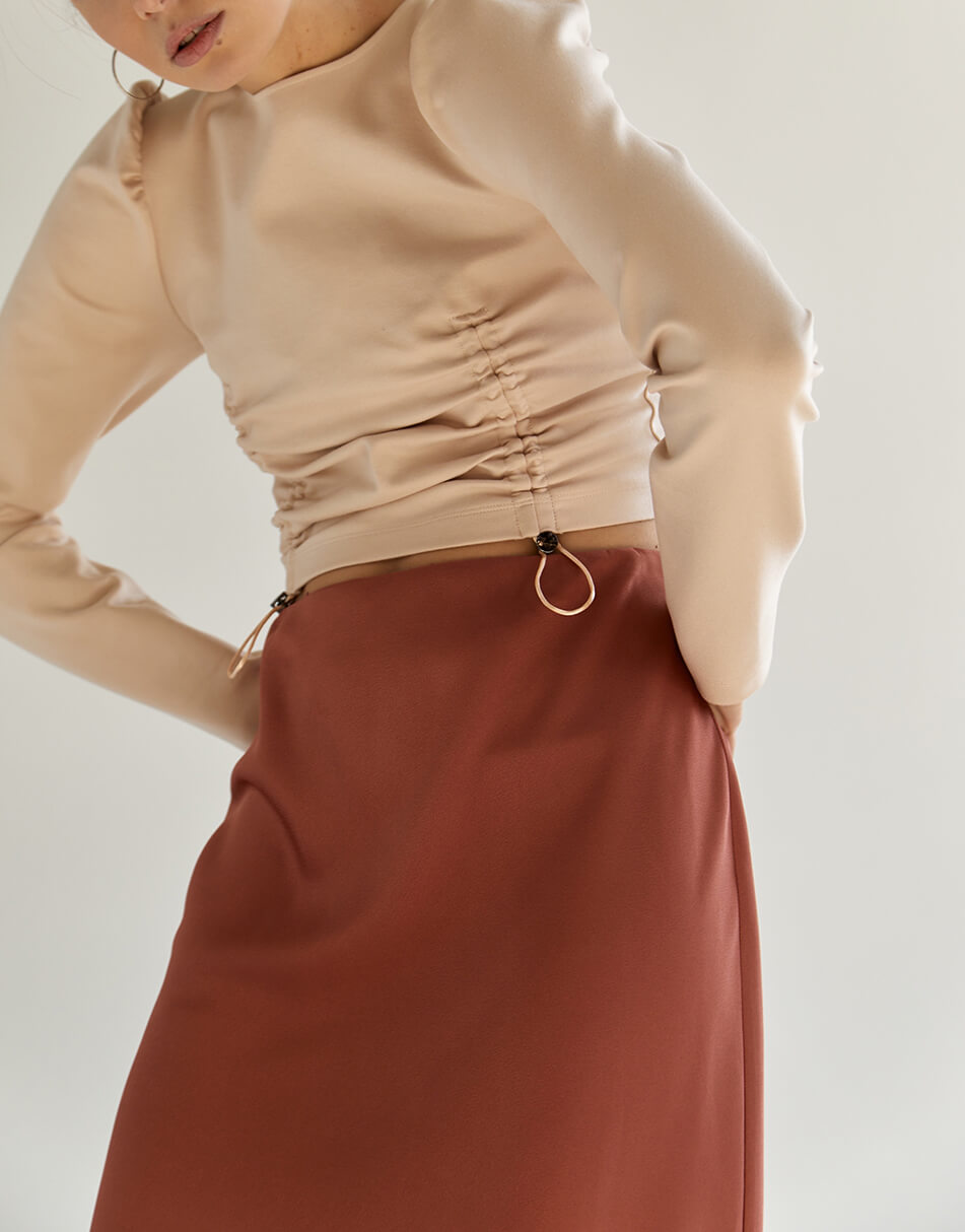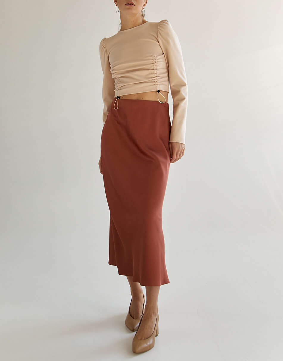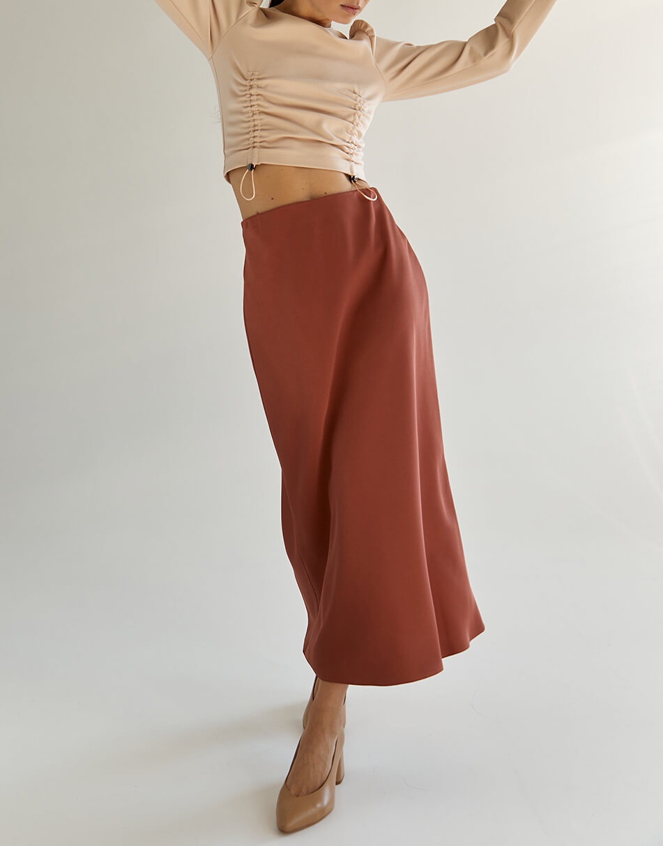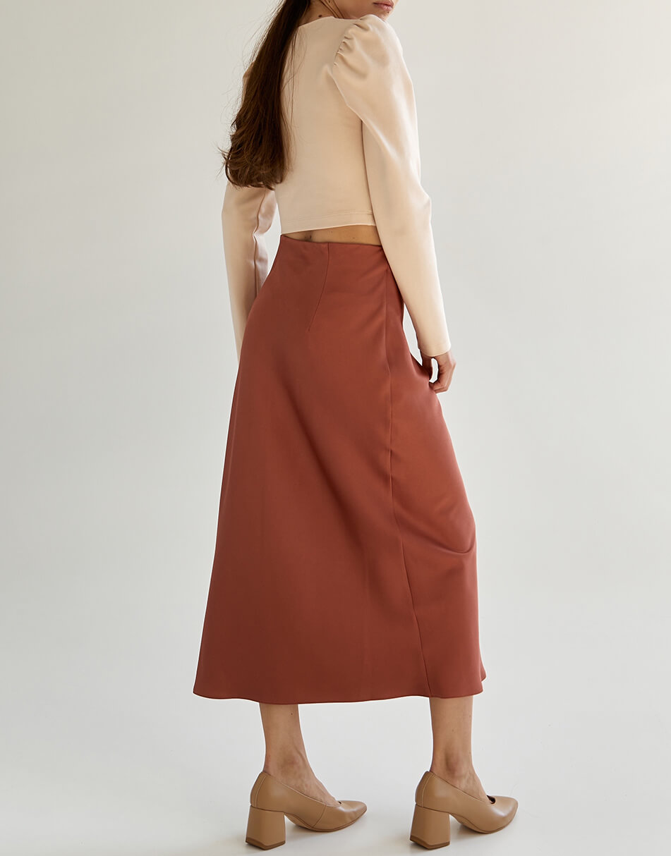 Спідниця по косій теракотового кольору з класичною посадкою на талії. Довжина до середини гомілки.
