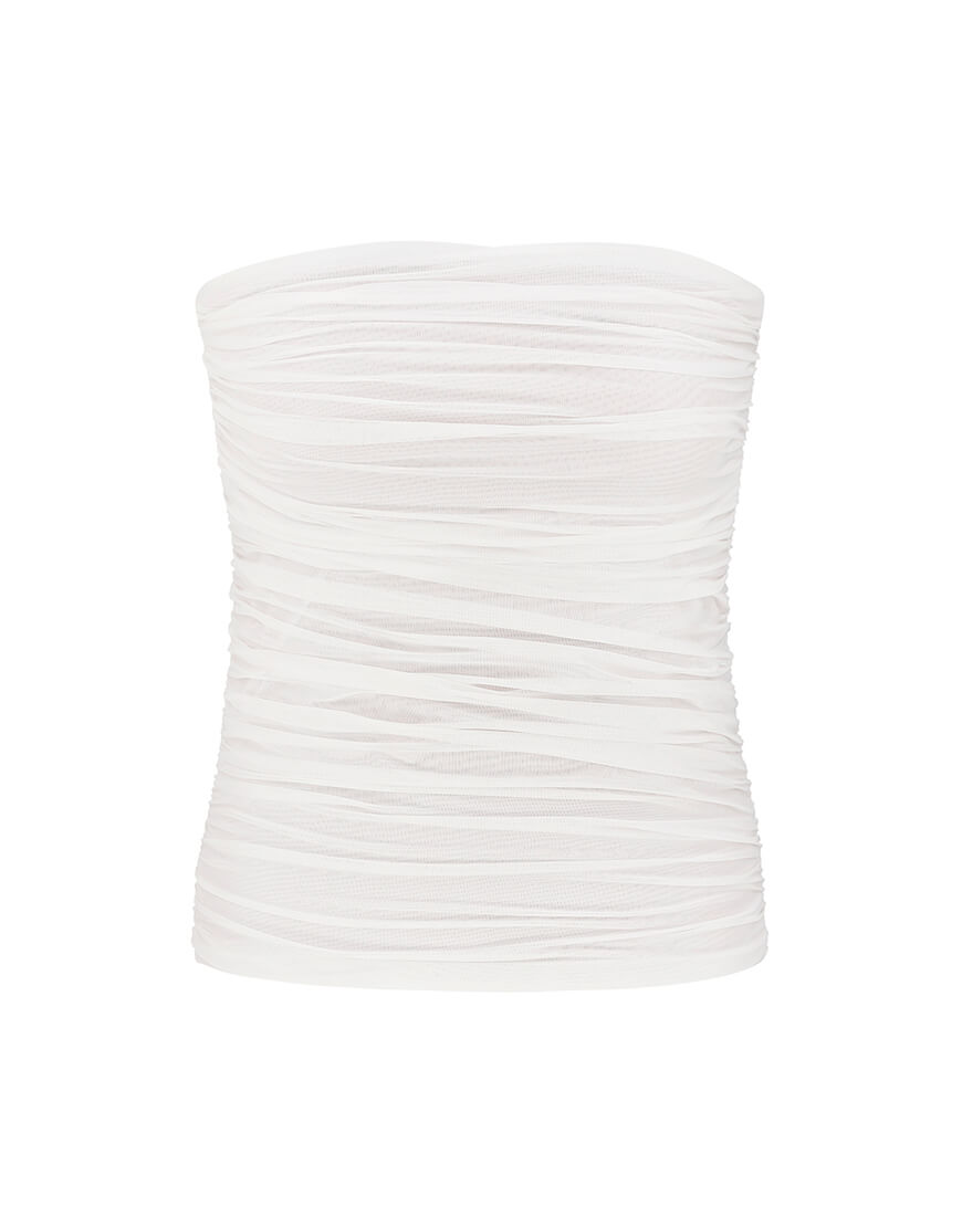Топ-бандо декорований сіткою. Добре тримається на тілі. Гладка і приємна текстура тканини, забезпечить максимальне прилягання по фігурі і комфорт при русі. Гарно поєднується з атласними штанами, штанами-палаццо та спідницею по косій.