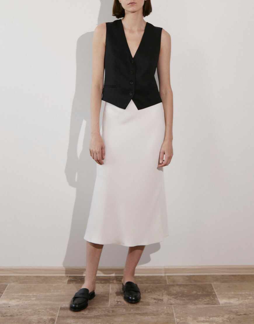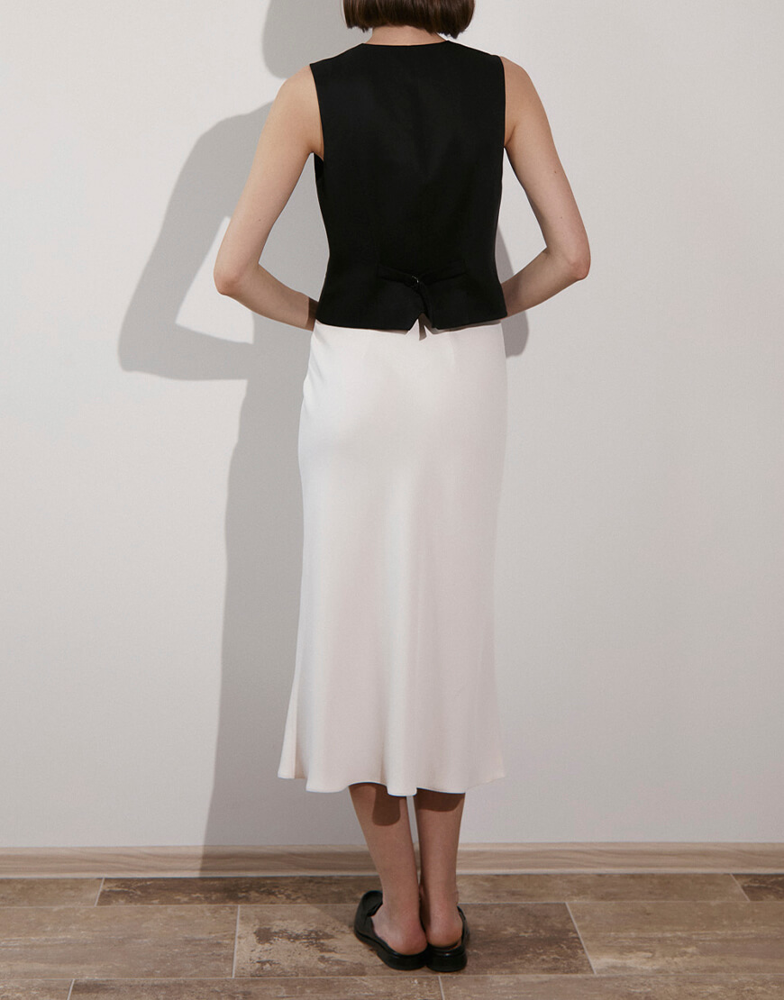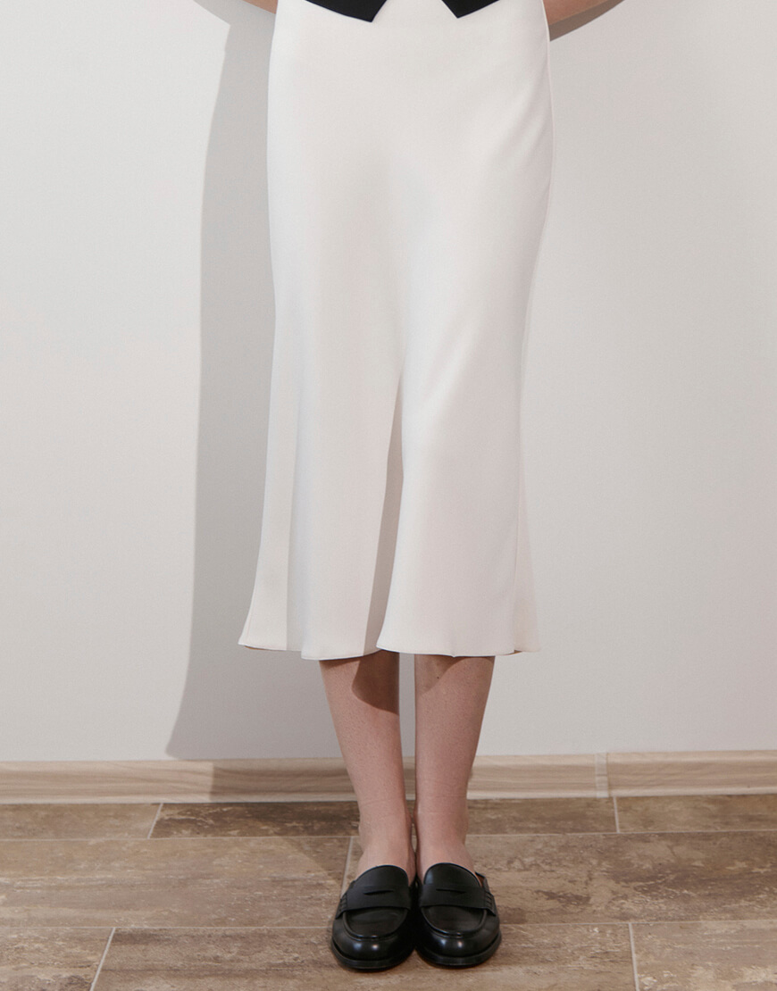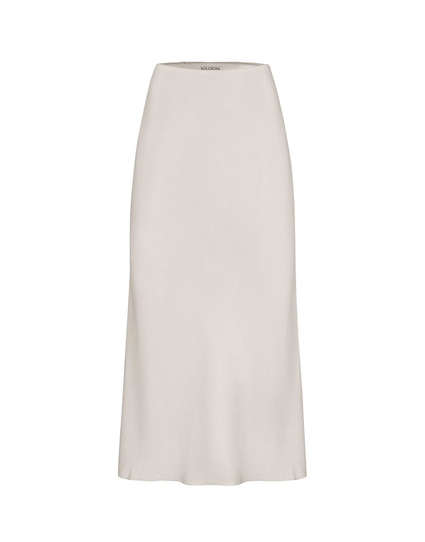 Спідниця молочного кольору, довжини міді з класичною посадкою на талії. Гарно поєднується з боді, топом бандо, жакетом, тренчем, футболкою та сорочкою вільного крою.