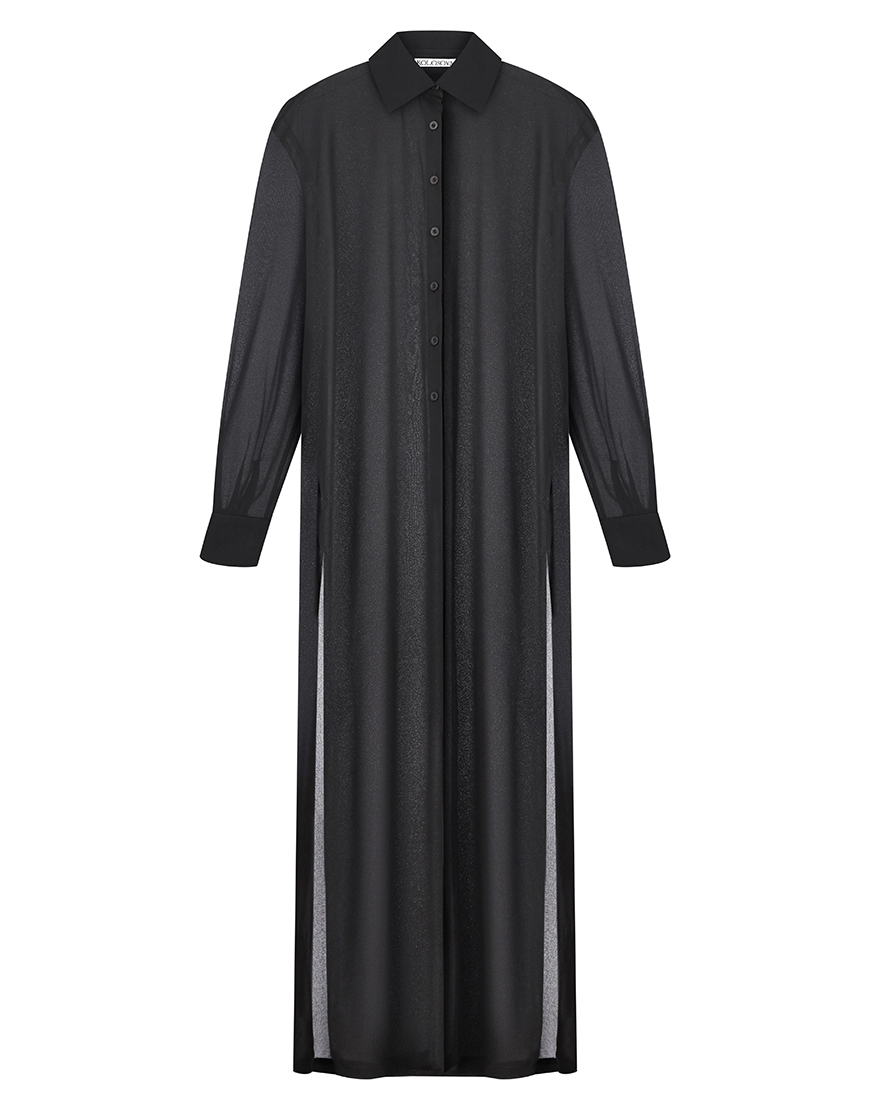 Подовжена сорочка виконана з напівпрозорого шифону,має відкладний комір, манжети та застібку на ґудзиках попереду. Збоку модель має два розрізи, завдяки яким є можливість поєднувати виріб з різними елементами гардеробу.