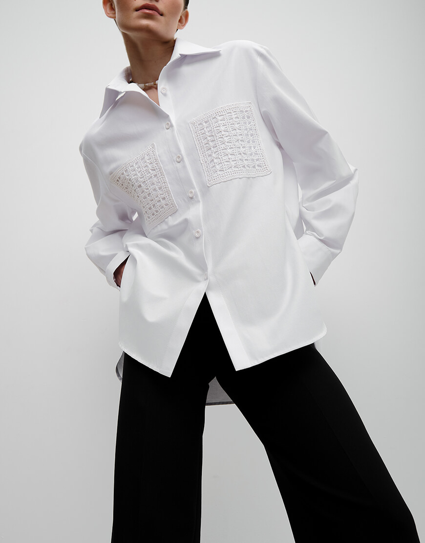 Сорочка з вʼязаними кишенями молочного кольору. Закруглені знизу розрізи по боках. Класичний комір та манжети. Декорована в’язаними накладними кишенями. Onesize