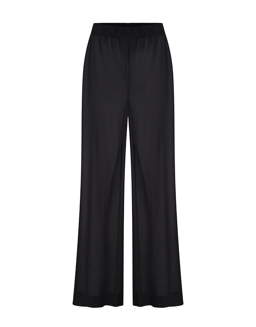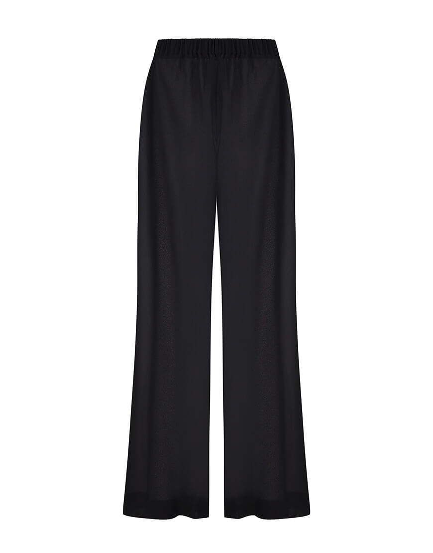 Доставка впродовж 1-2 робочих днівПрямі чорні брюки скроєні по косій з шифону та резинкою на поясі.Ідеальним доповненням стане шифонова чорна блуза вільного крою